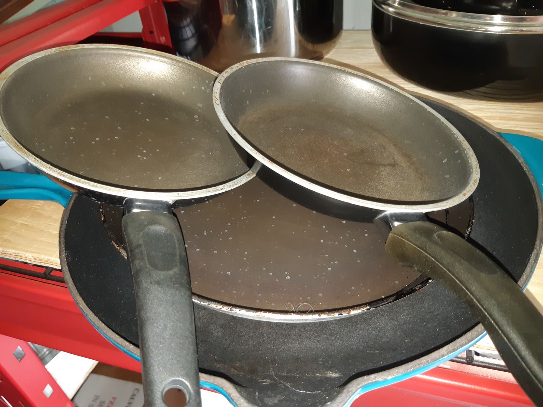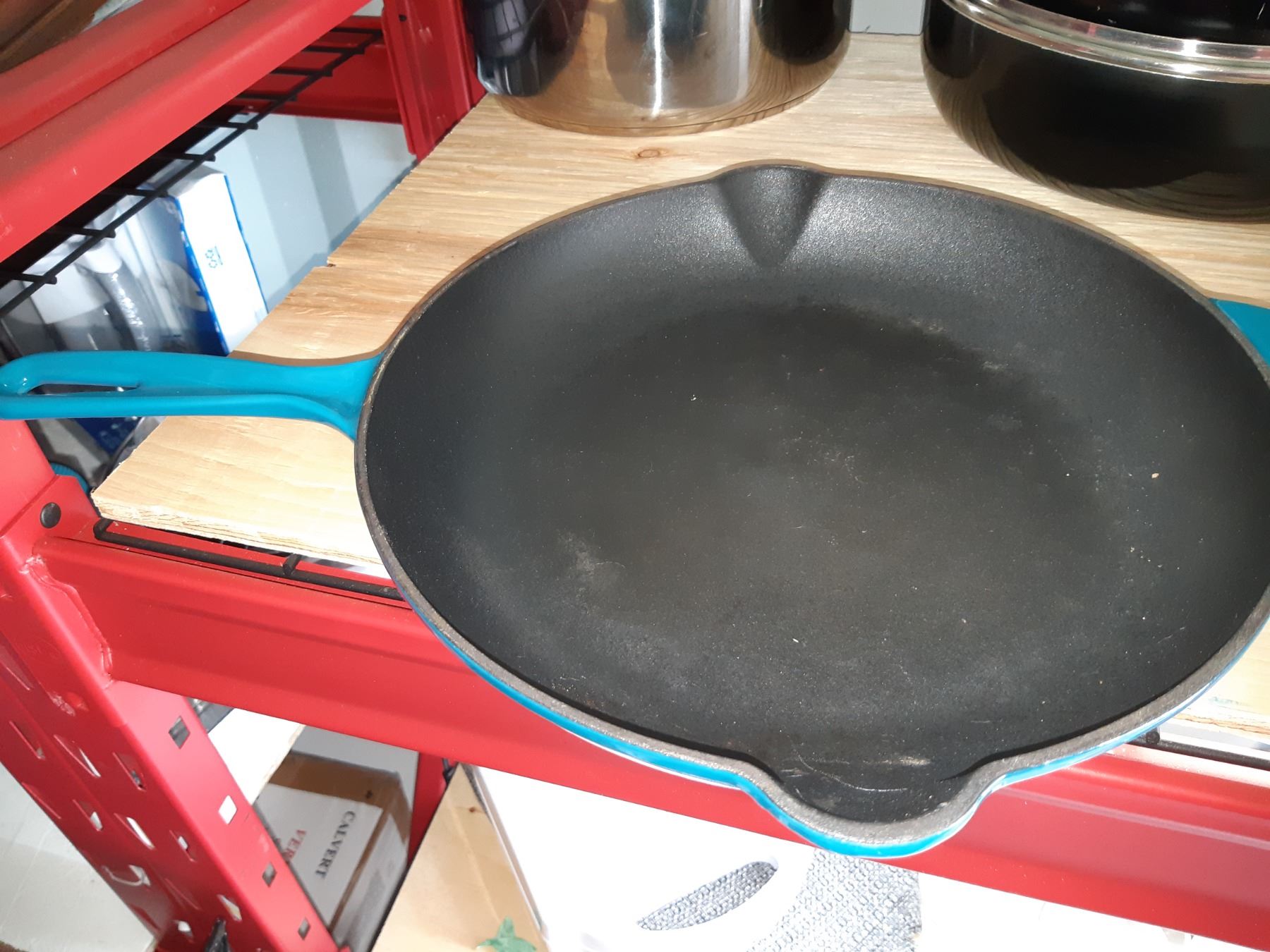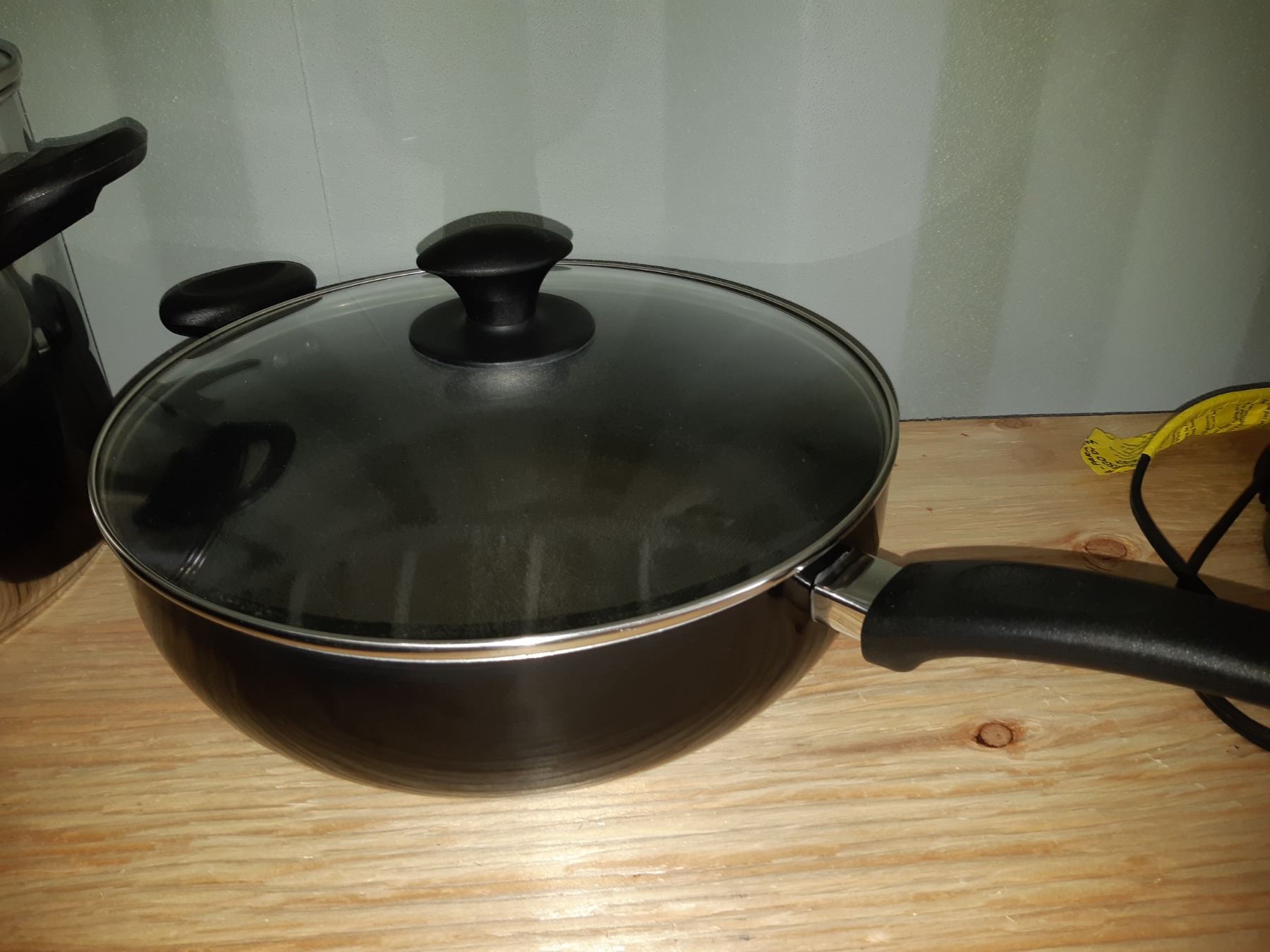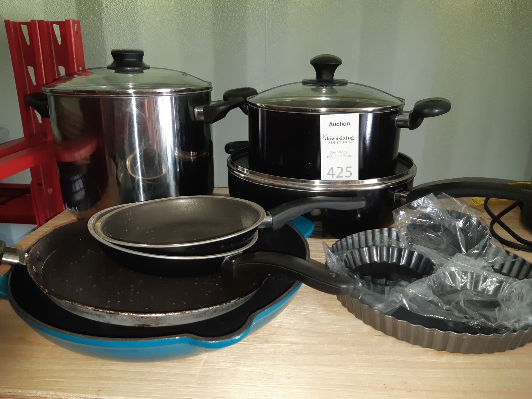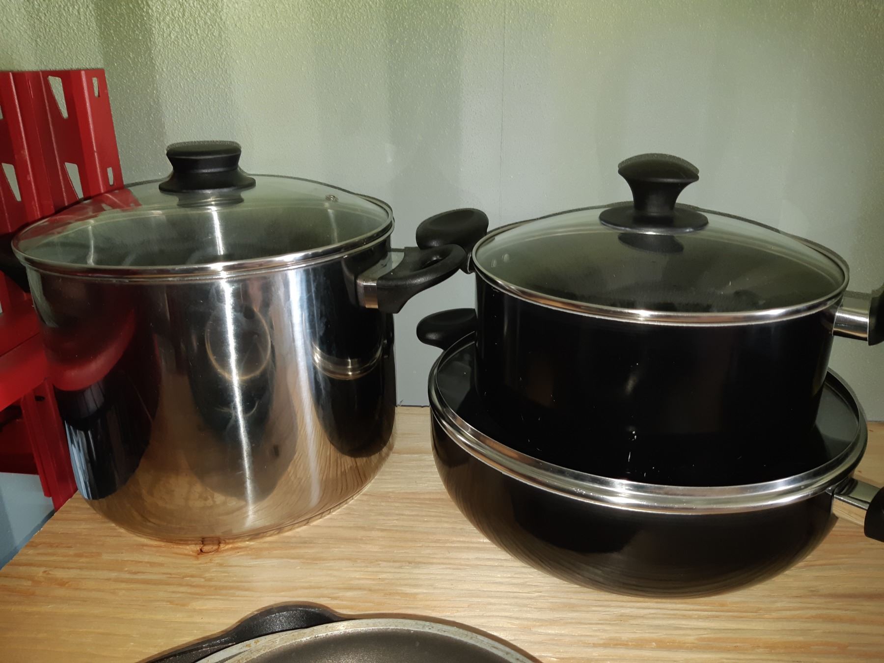 PC enamaled cast iron fry pan, non stick small fry pans, lidded soup pot, large lidded pot, and lidded deep cooking/stirfry pot. Bring packing supplies and pickup at 11 am