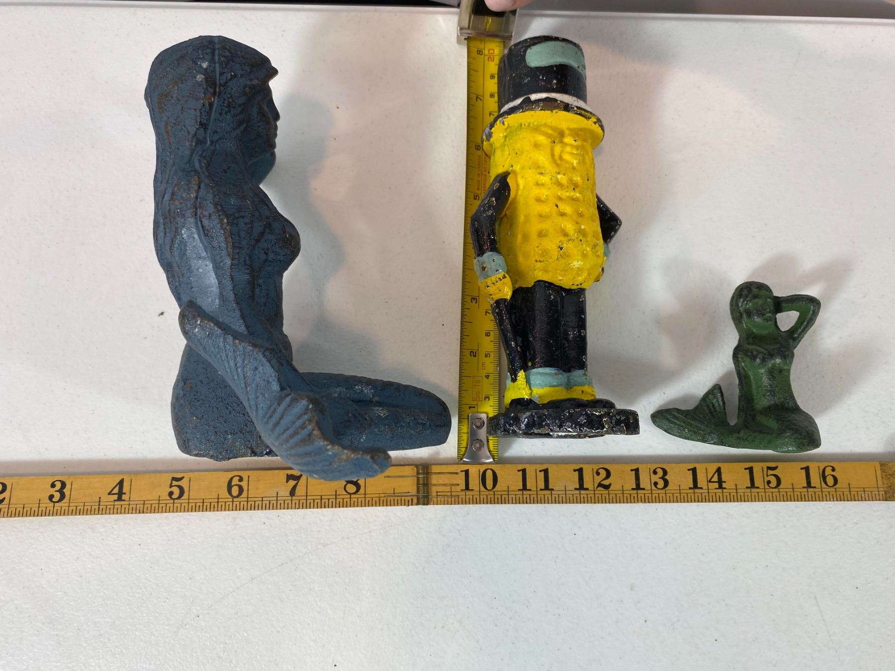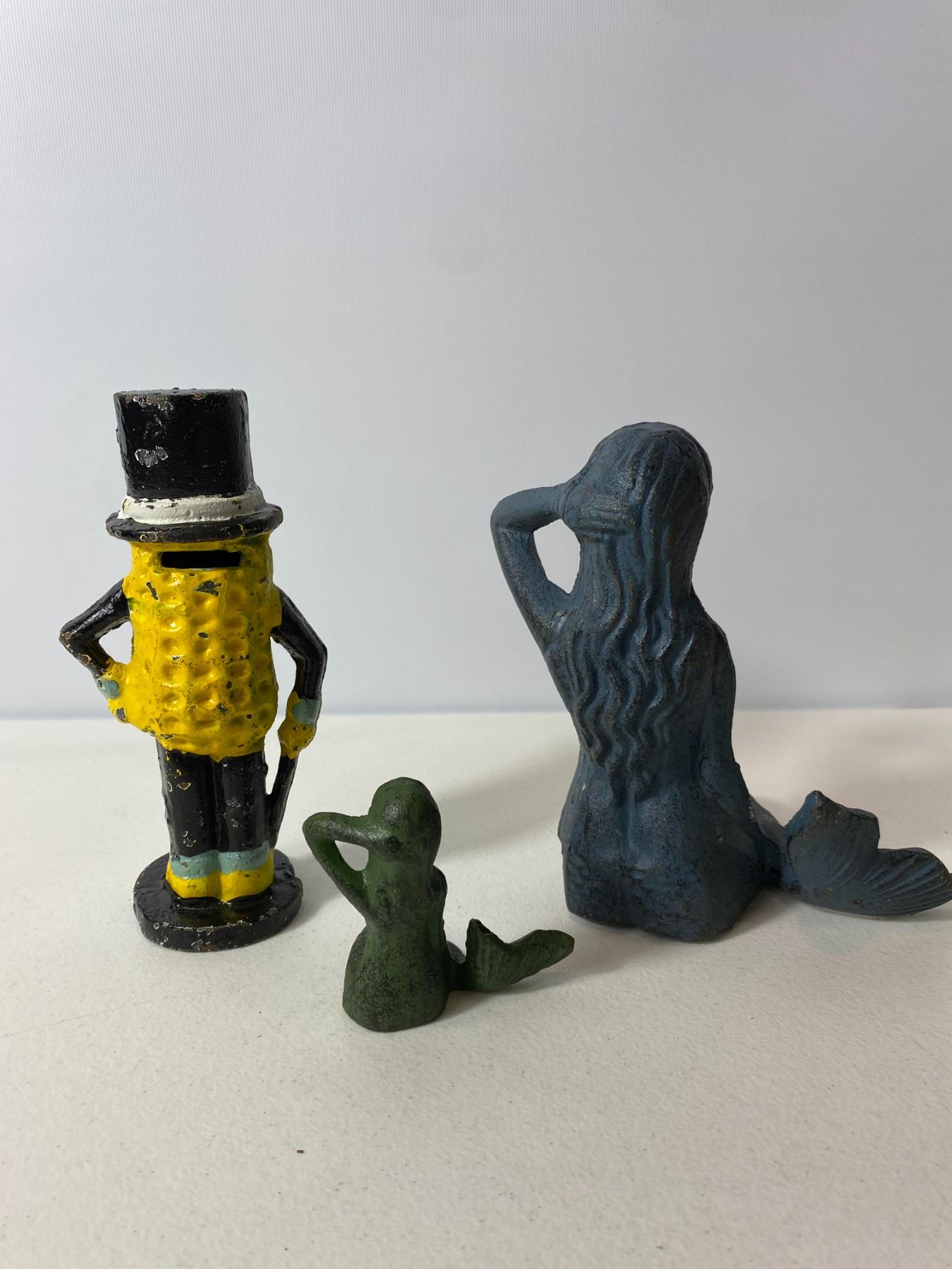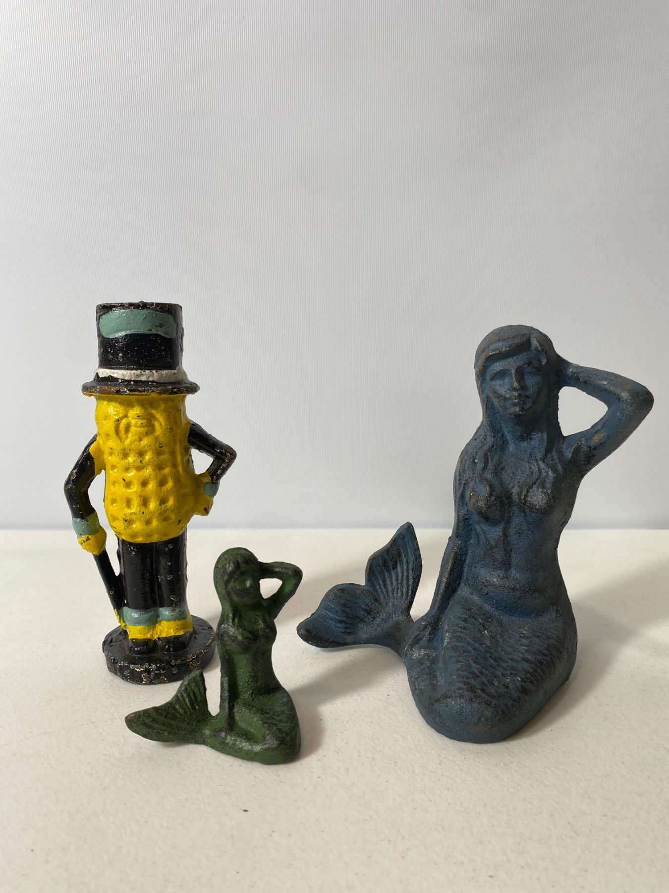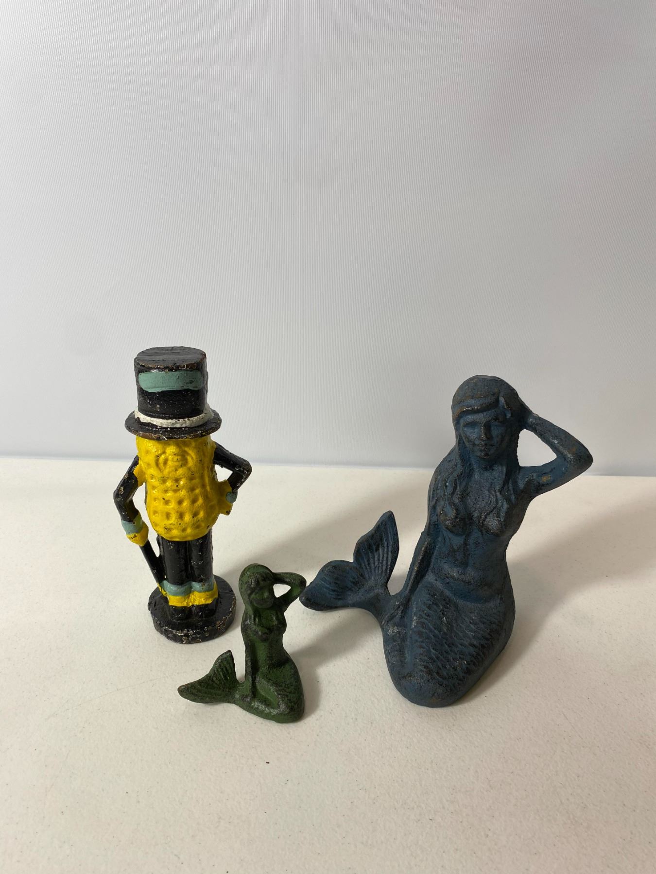 Group of cast iron figurines including a large blue mermaid, small green mermaid, and a brightly painted yellow MR Peanut Character. Original painted surfaces with visible wear.