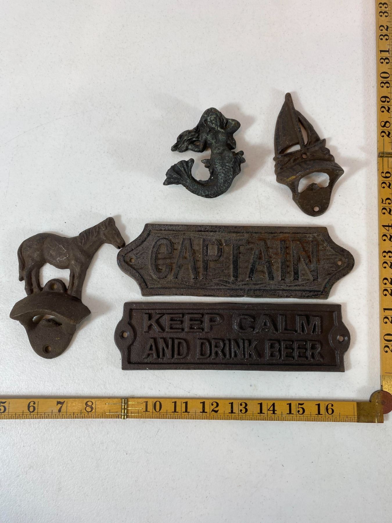 Group of five cast iron hooks and bottle openers including a mermaid figure, cowboy hat and horseshoe hook, hammer shaped opener, fish opener and one additional wall-mount opener. Pieces range from approx. 4 to 8 in. long. Some rust and finish wear.