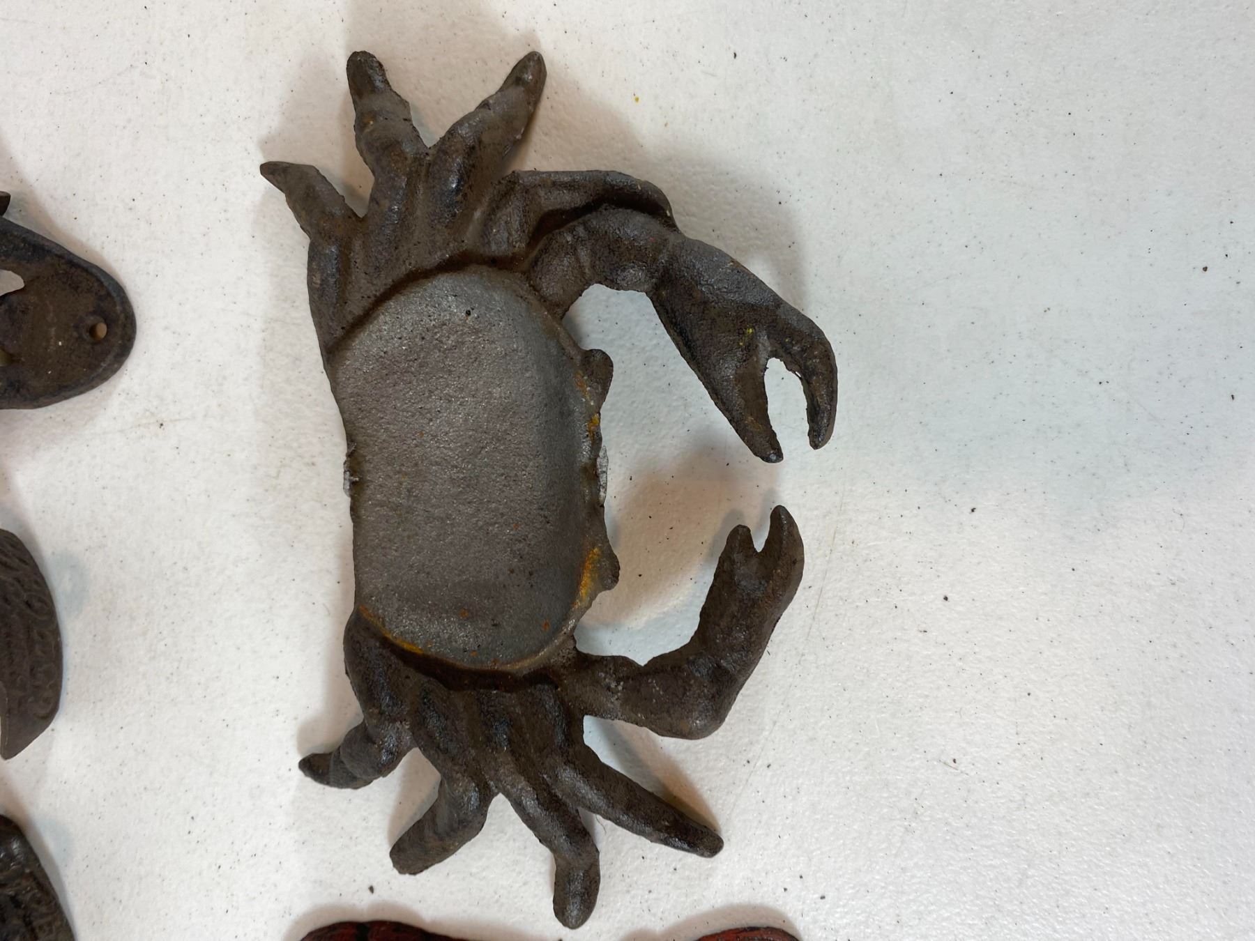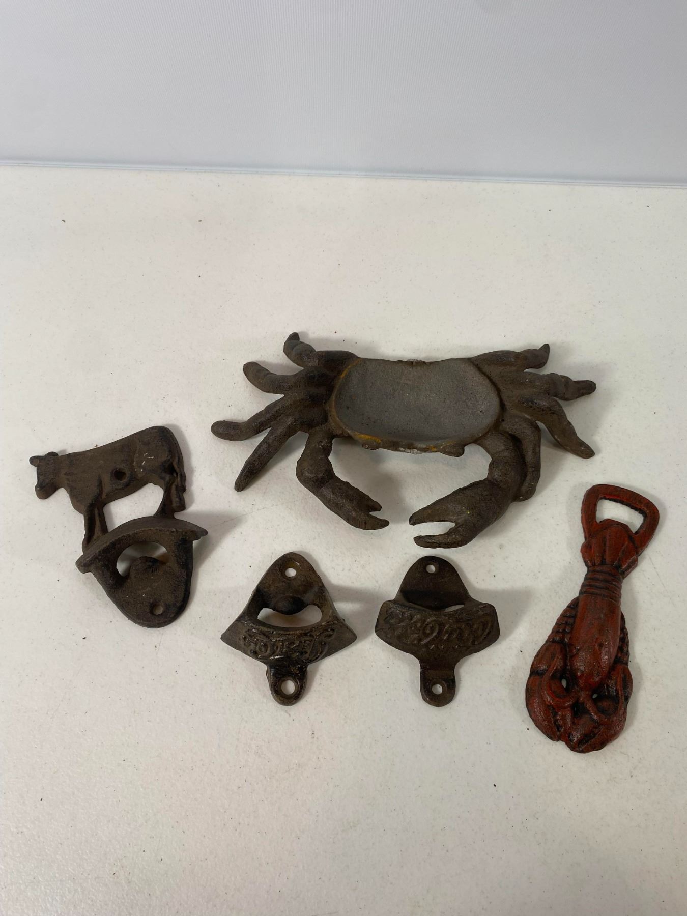 Assortment of cast iron bottle openers including a crab-shaped opener, a cow-head opener, two wall-mount openers with decorative script, and a red-painted figural opener.