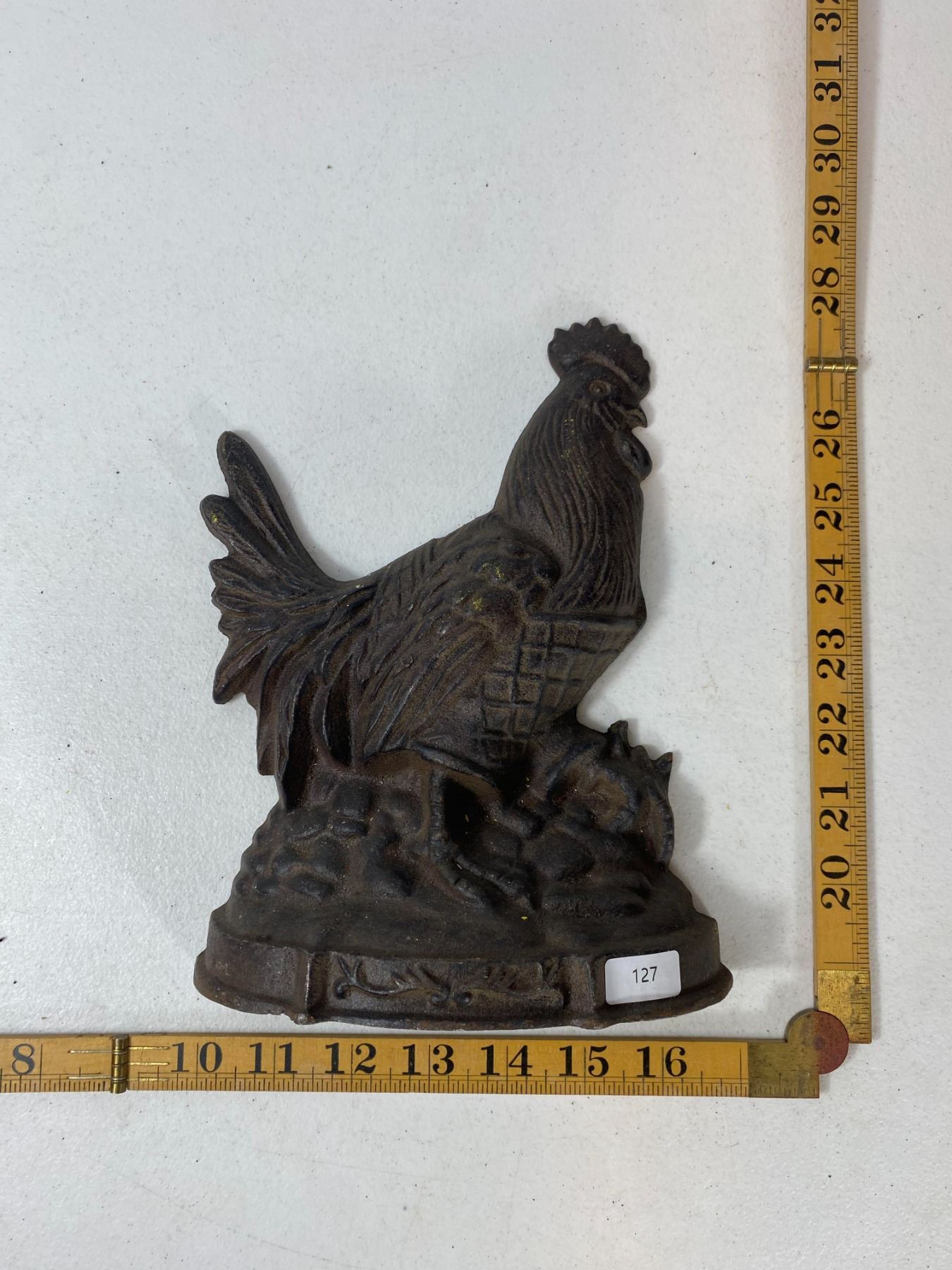 Cast iron rooster doorstop with raised base. Shows surface rust and finish wear consistent with cast-iron reproductions. Offered as a decorative collectible.