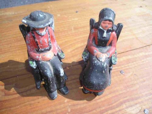 This set of heavy cast iron salt and pepper shakers are of an Amish man and women rocking. They are approximately 3" tall.