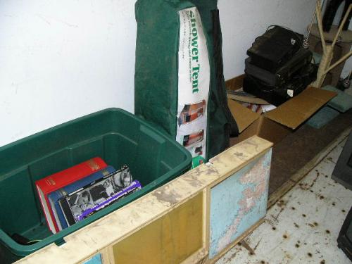 Cat tree and Cat house and Stereo system, model Airplane parts, shower tent with electric pump, electric sign, bin full of books, and folding chair (169)