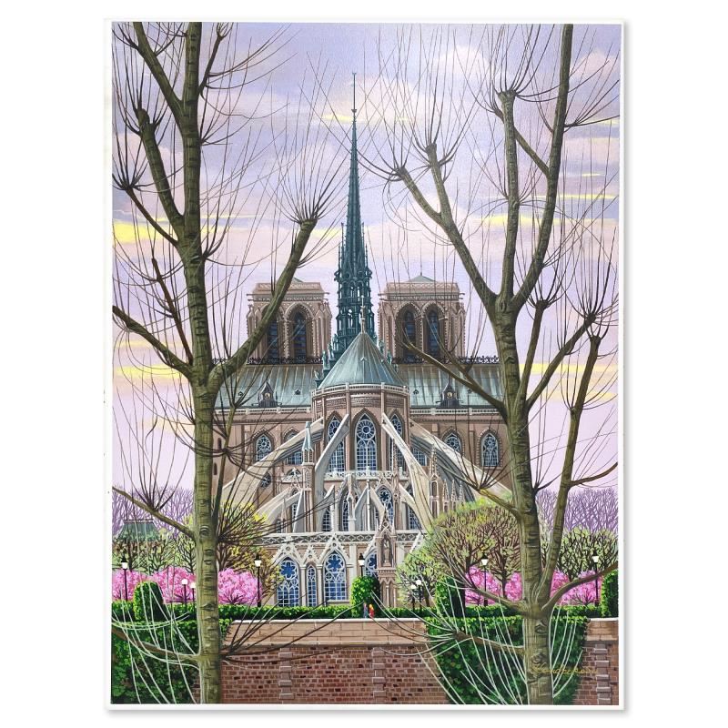 "Cathedral Notre-Dame (Toujours Paris)" is a limited edition serigraph on gesso board by Liudmila Kondakova, hand signed by the artist. Includes Letter of Authenticity. Measures approx. 18" x 13.5" (image).