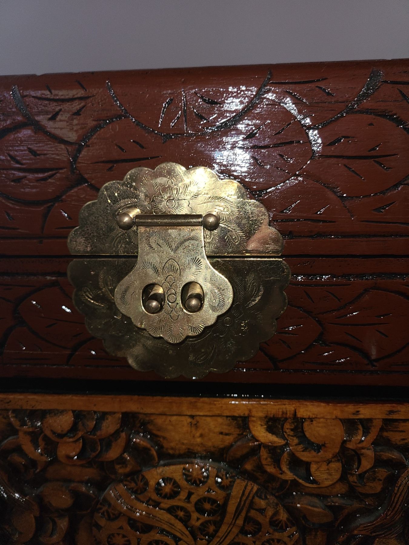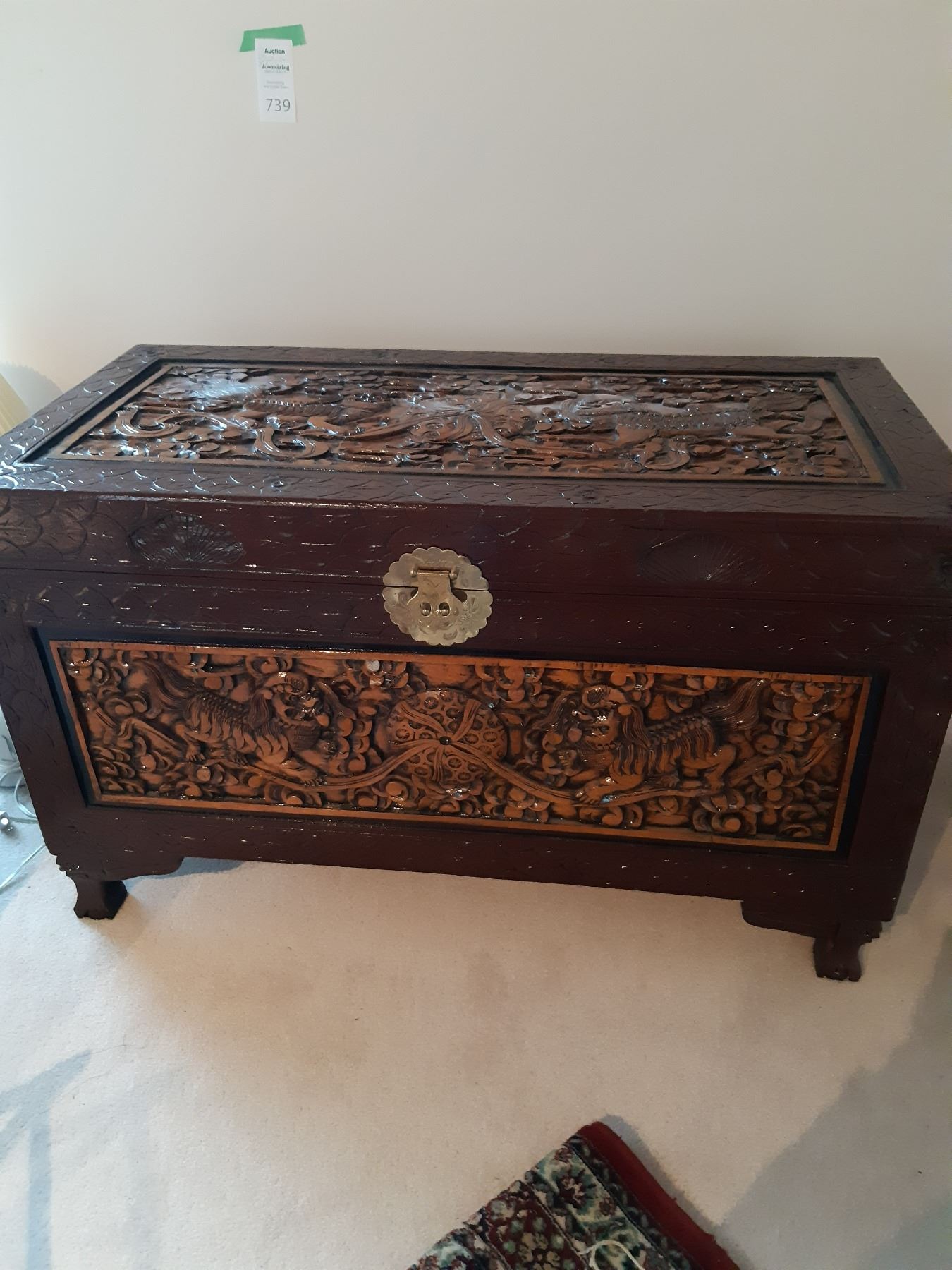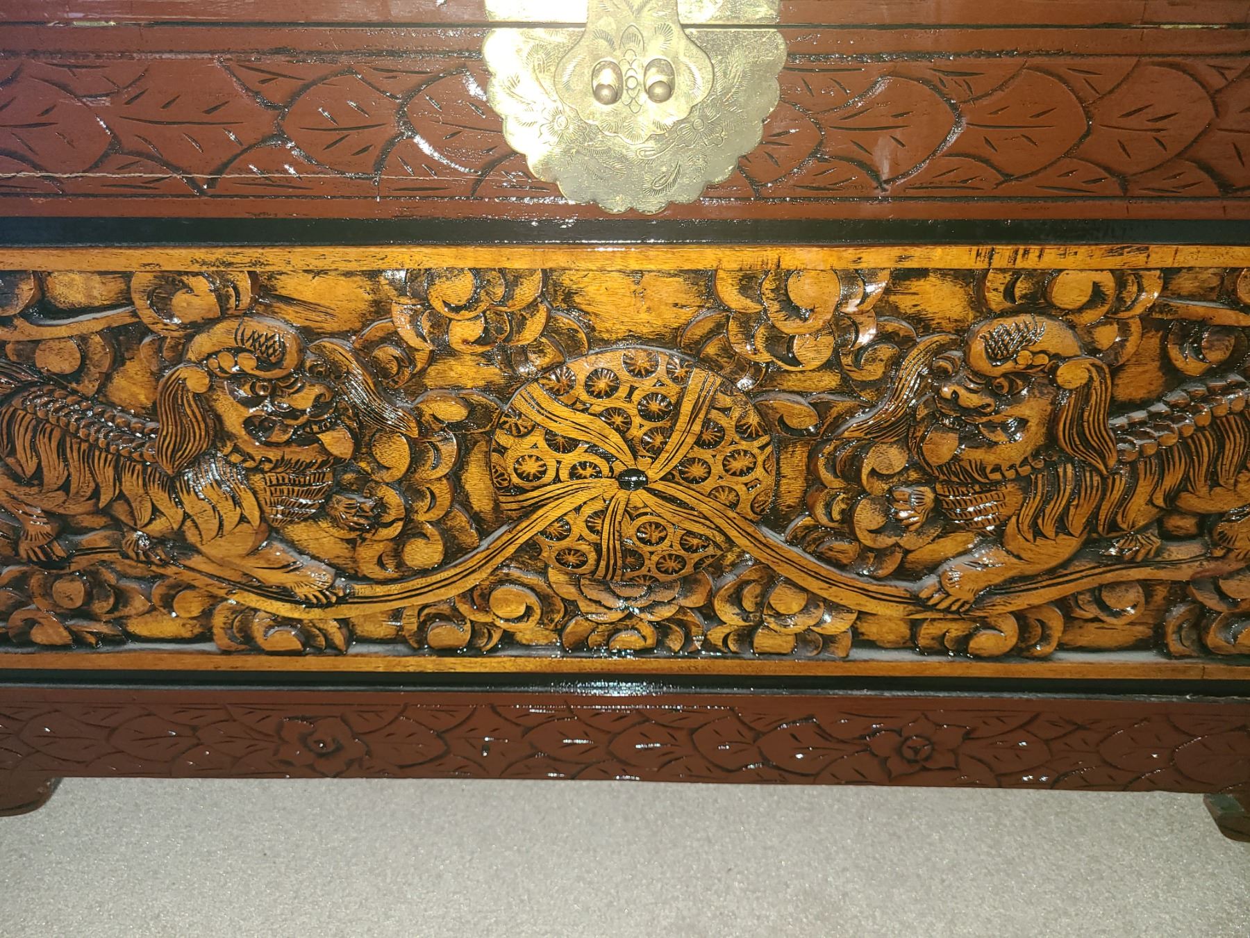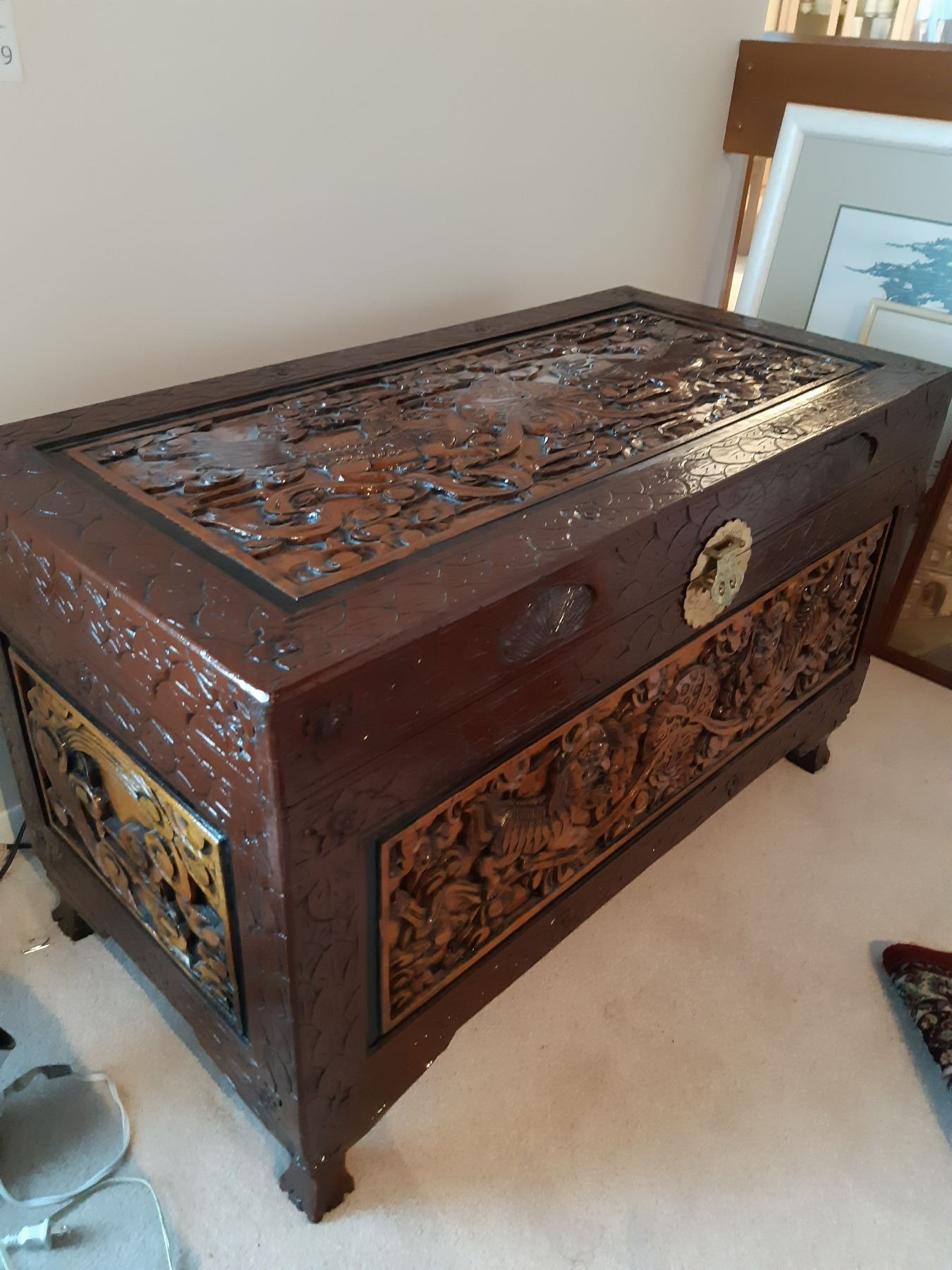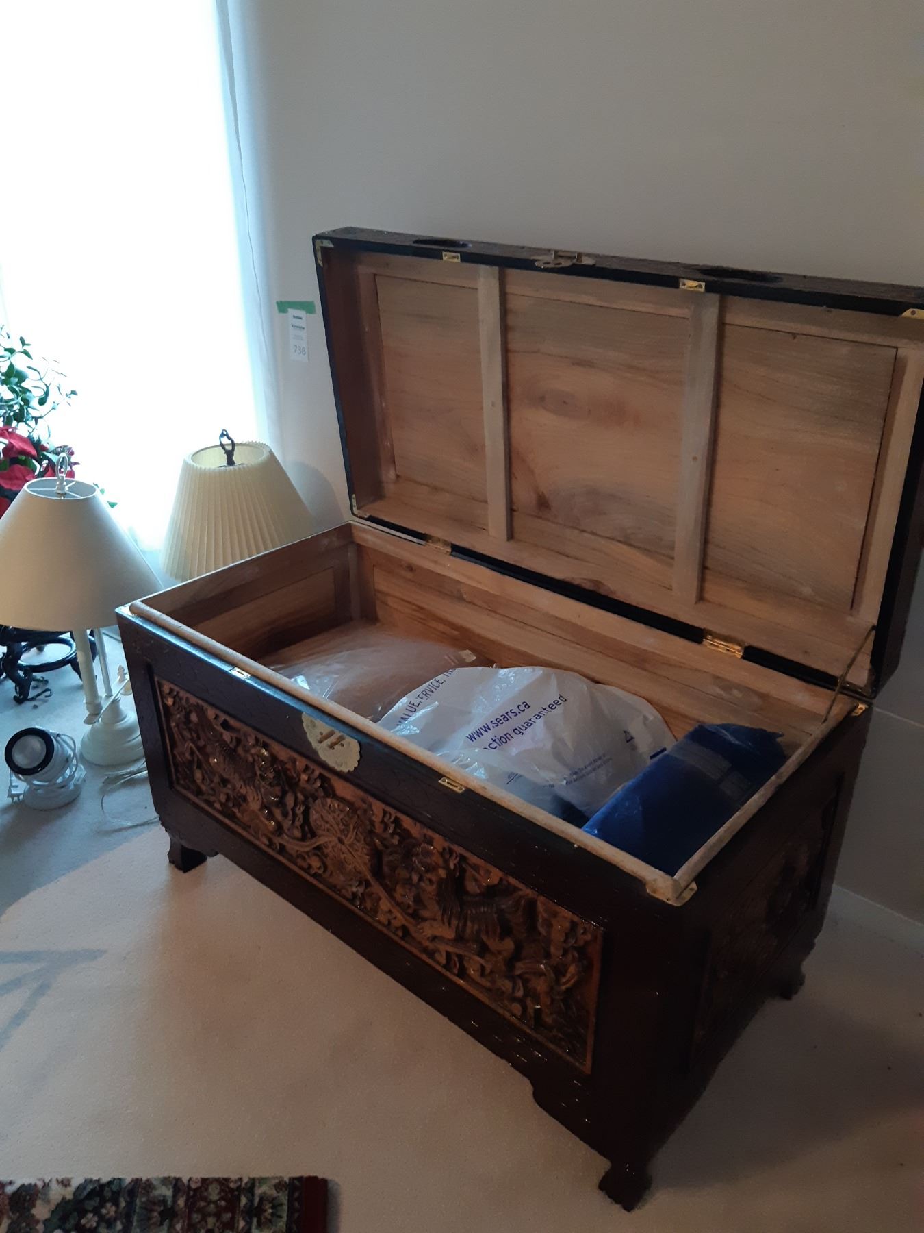 Asian style cedar chest with assorted blankets. Heavy, bring help to move. Pickup 10 am