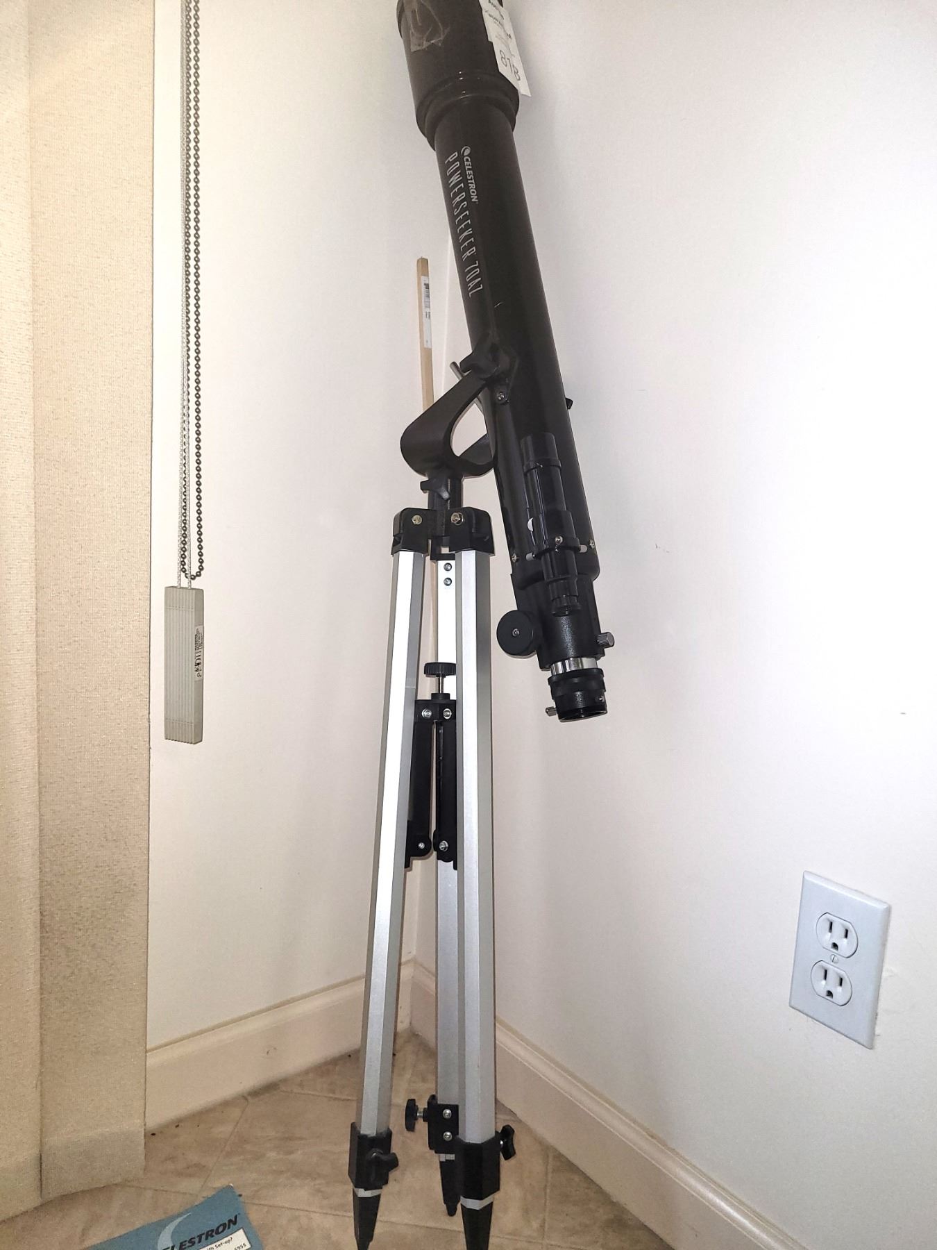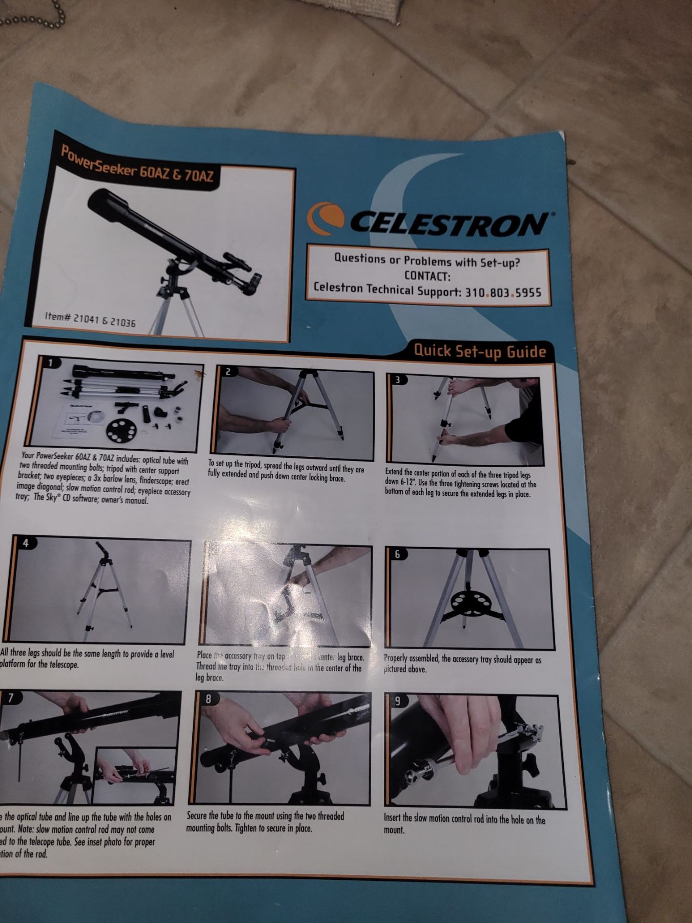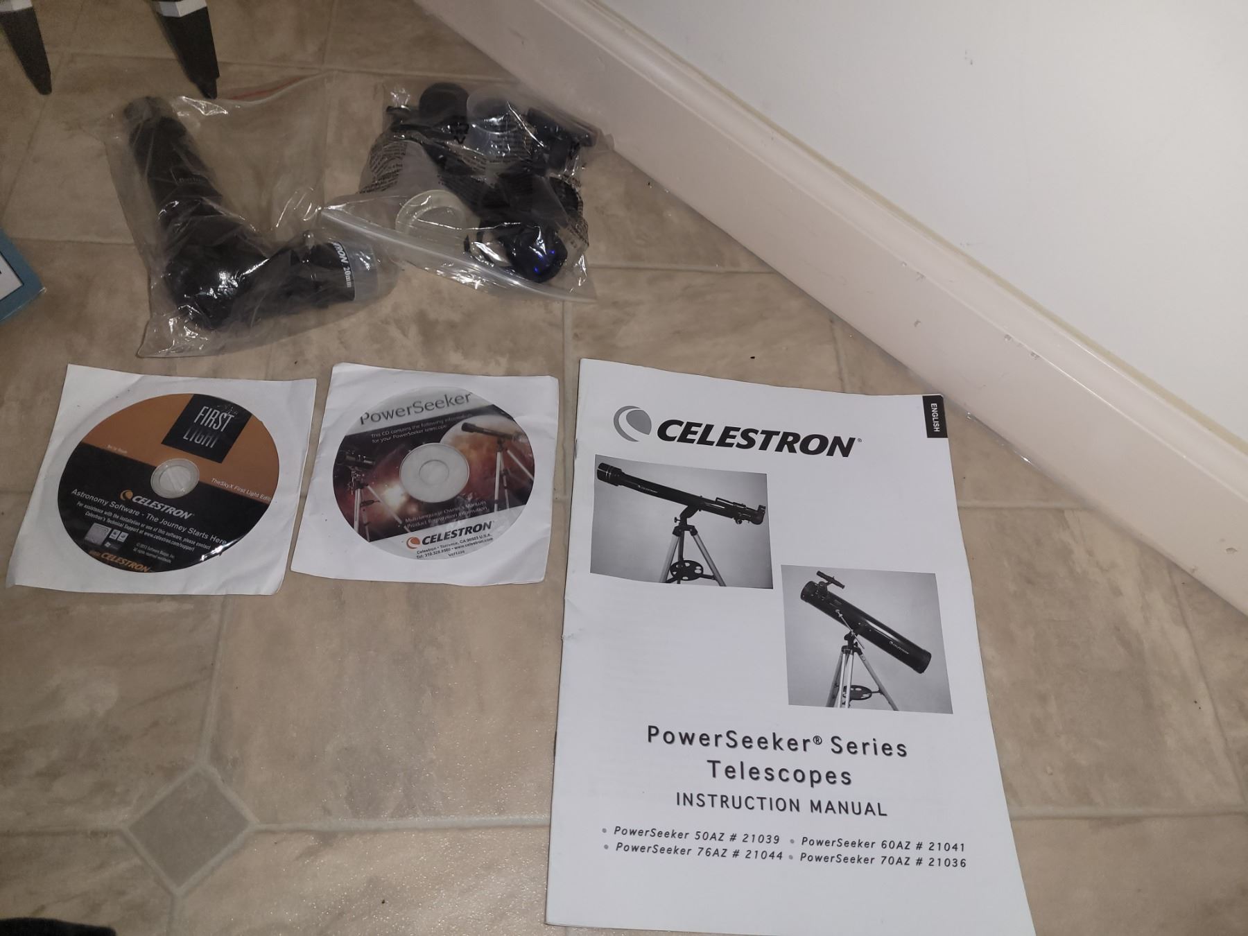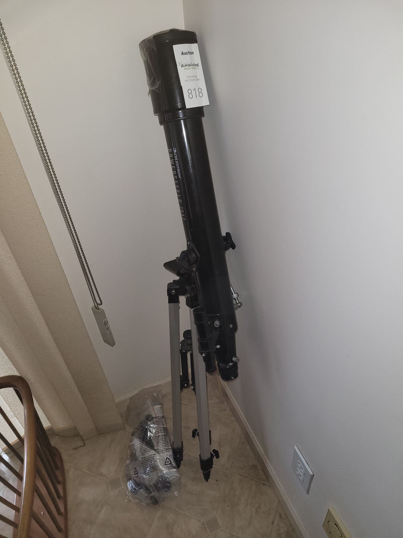 Telescope with tripod, attachments, manual, untested. Pick up 9-10