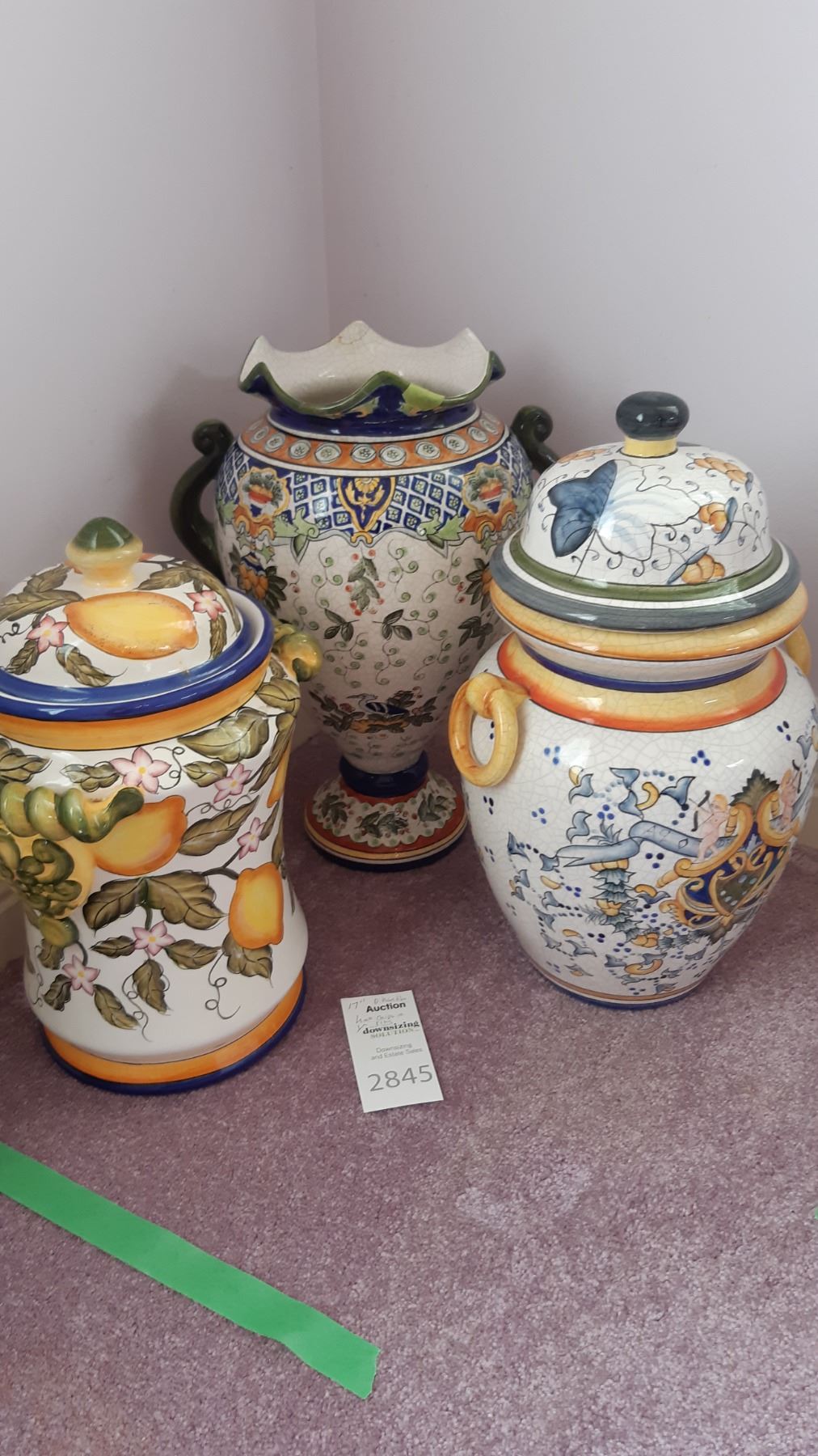 Three Mediterranean themed urns, one has damage to rim, 17". Pick up 9 am