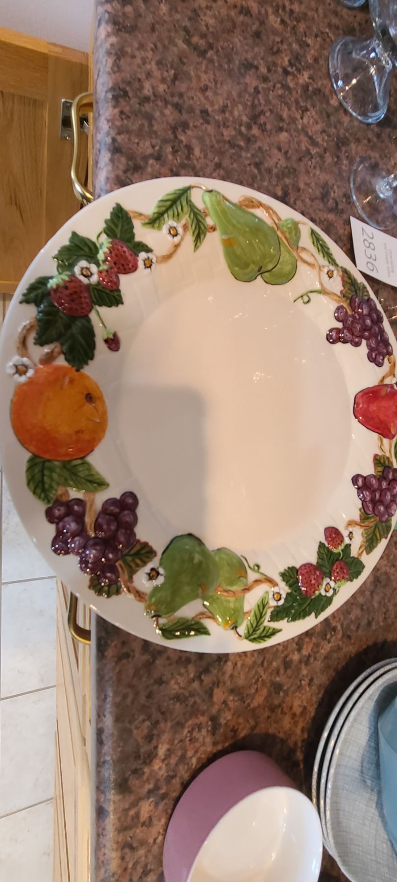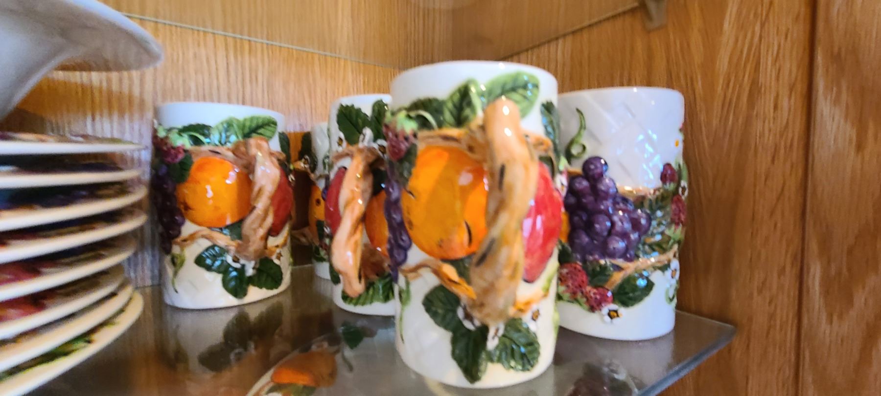 Fruit and basket weave dinnerware. 9 dinner plates, 8 cup and saucers. 8 fruit/cereal bowls, 8 side plates and 7 coffee mugs. Bring packing and pickup at 9 am