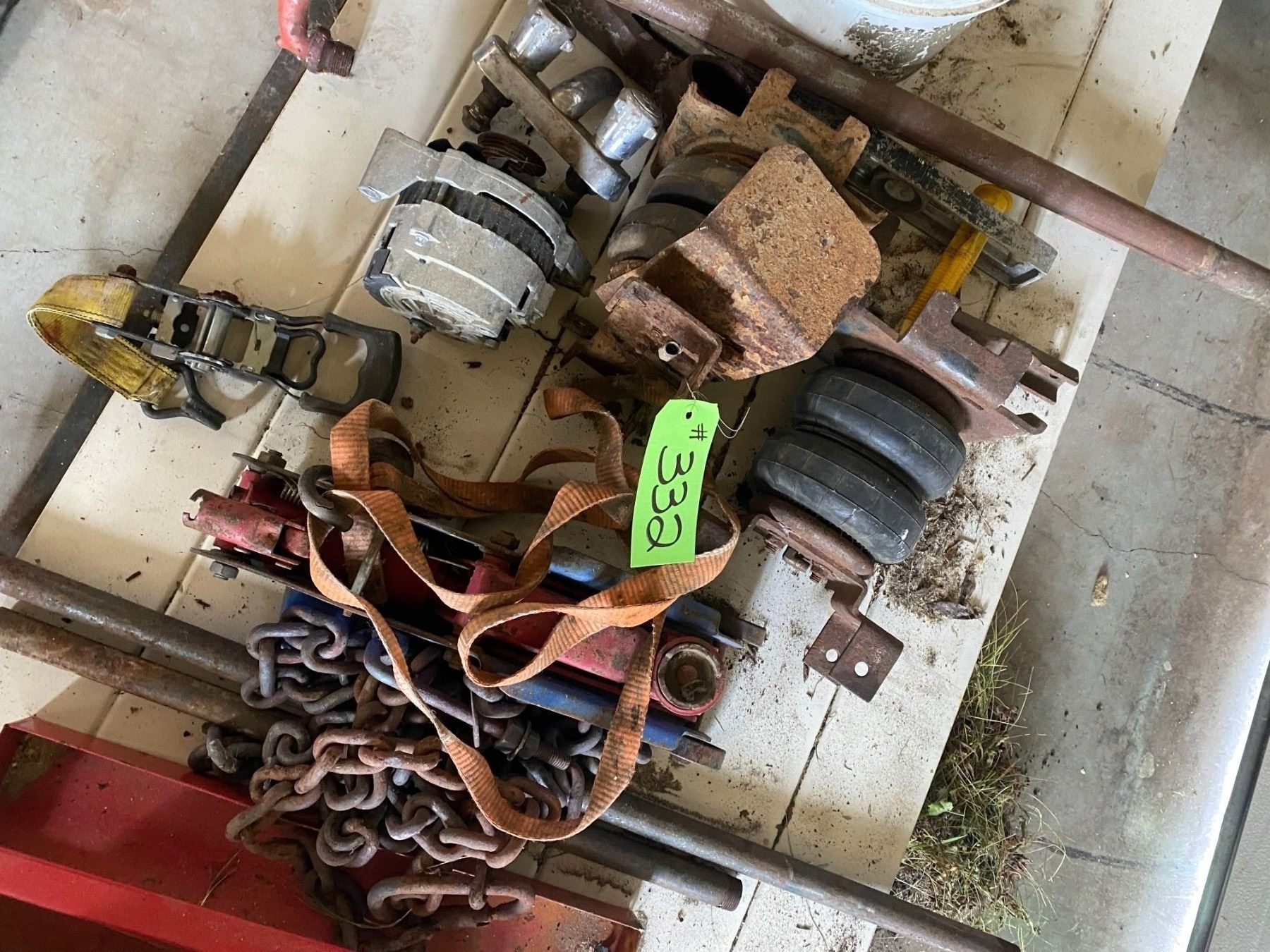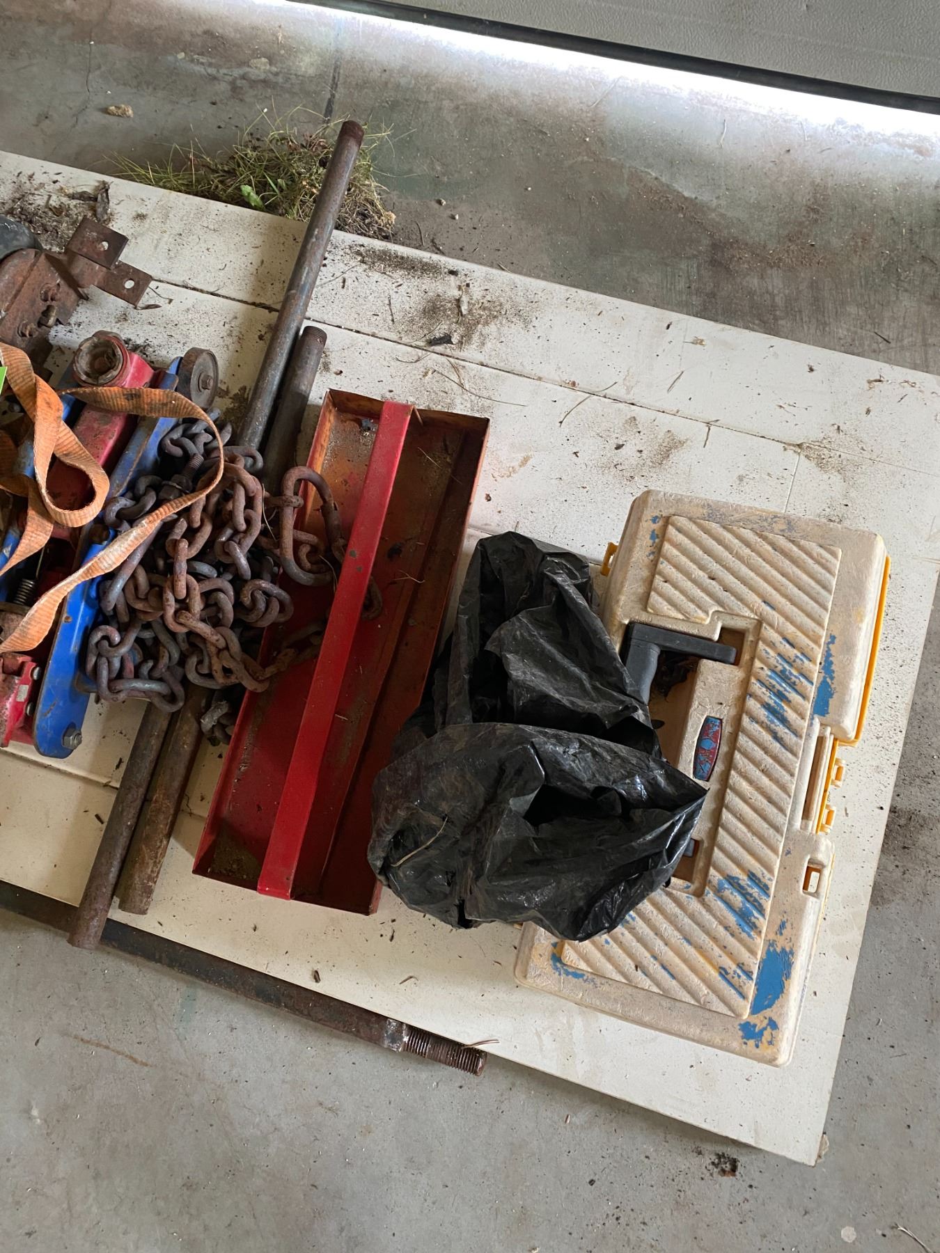 Chain, straps, air shocks, jack, chain, tool box & misc. weed eater line