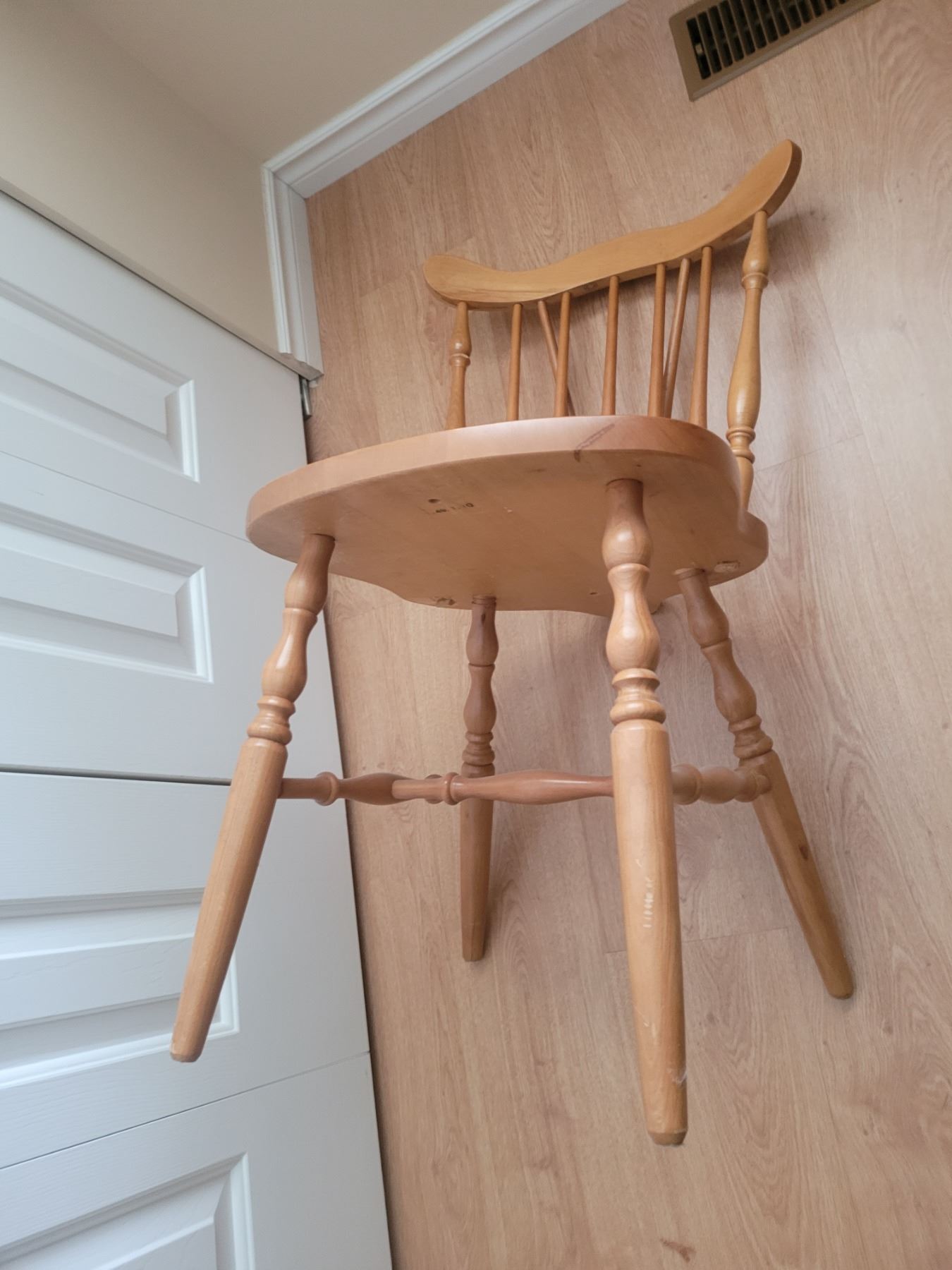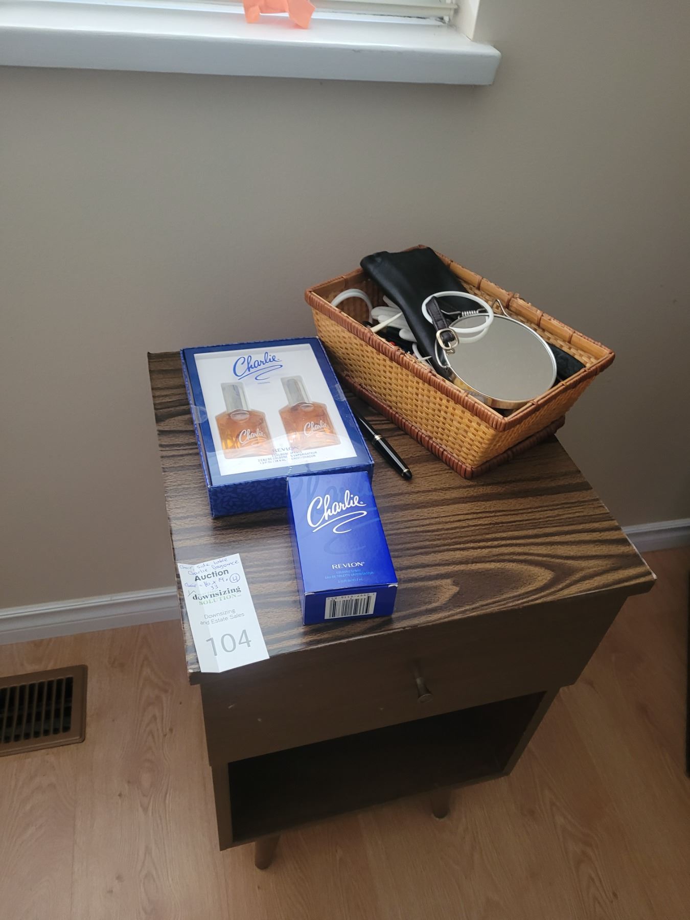 Vintage night stand, wood chair, Charlie fragrance, leather wallet, more. Pick up 9