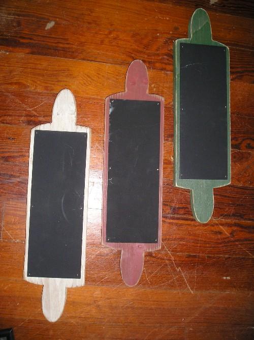 Three wooden rolling pin chalkboard memo hangers each is approximately 19" long.