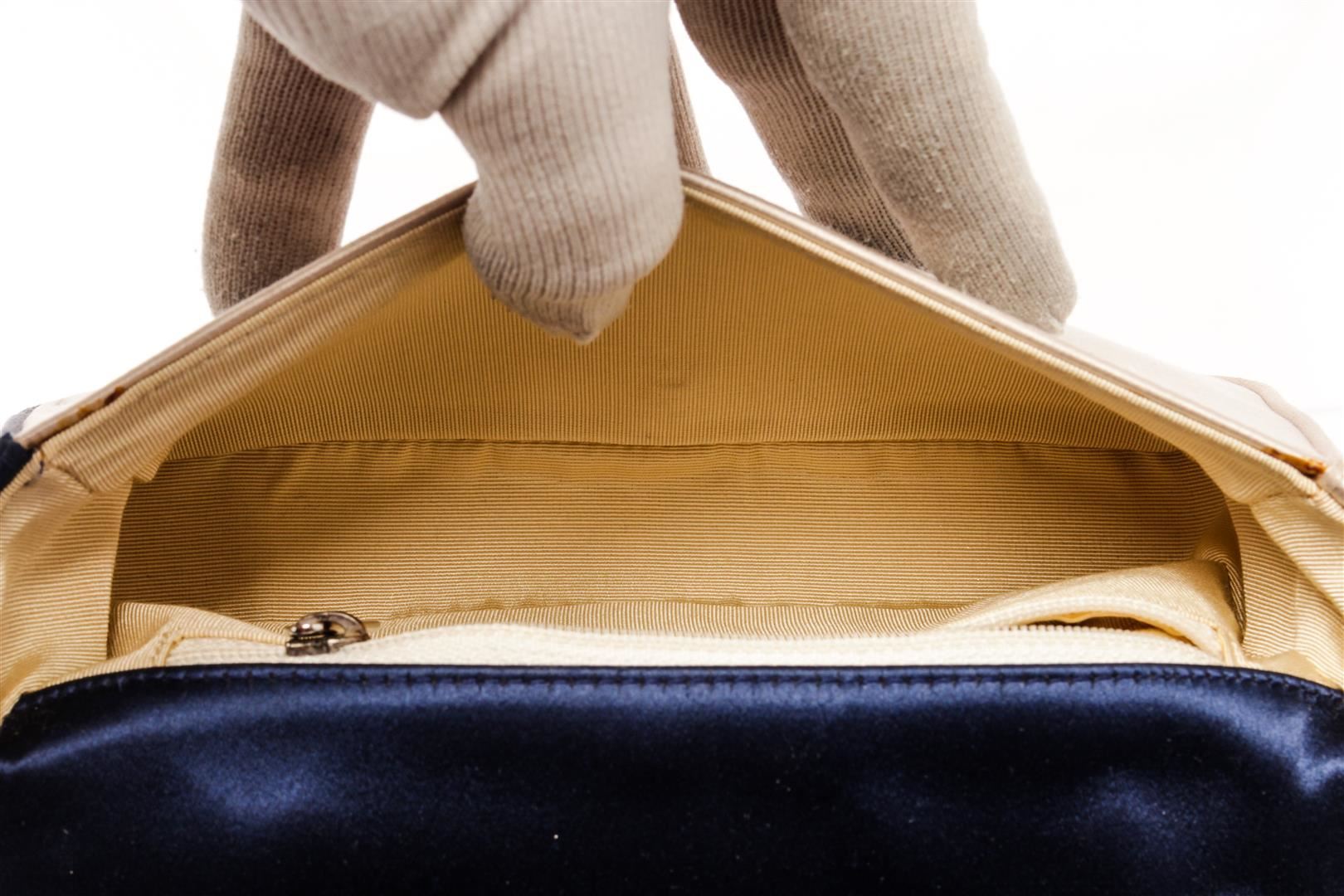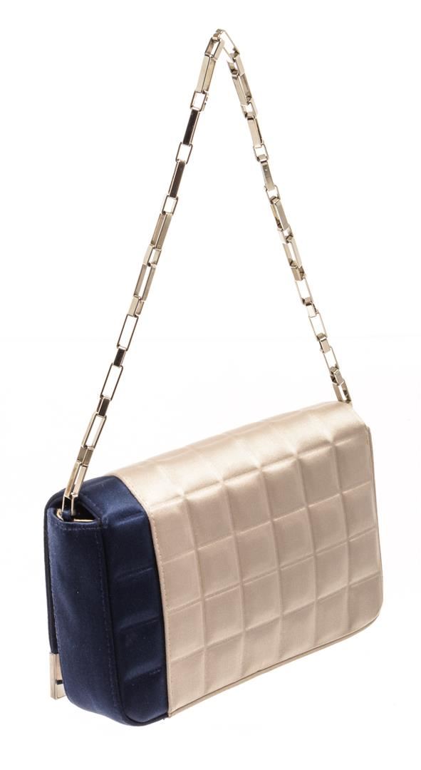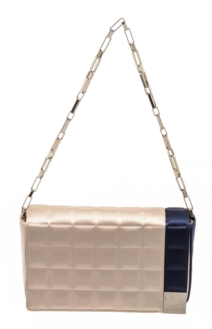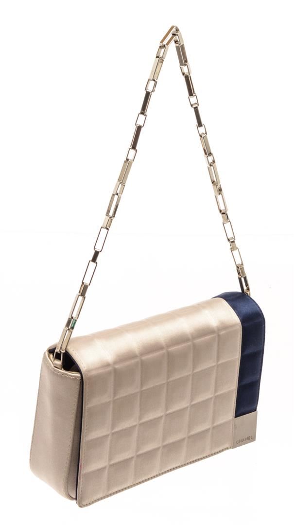 Chanel Beige Blue Satin Chocolate Bar Chain Shoulder Bag. All available information is listed in the description and shown in the photos. chanel beige blue satin chocolate bar chain shoulder bag with silver-tone hardware, a single edgy chain-link top handle, a dark slate tonal grosgrain lining, single zip pocket at interior wall and magnetic snap closure at front flap. Height: 5", Width: 8", Depth: 2" / 12.7 X 20.32 X 5.08 CM