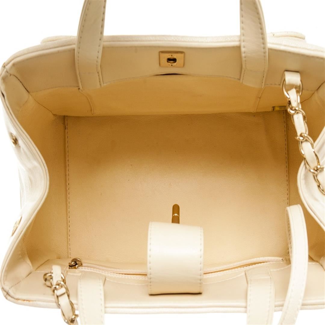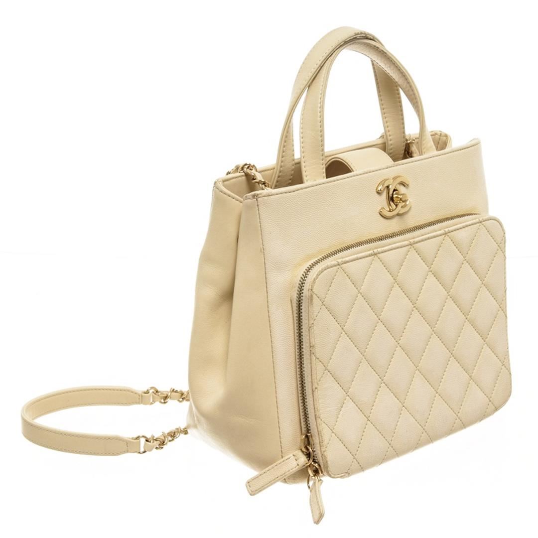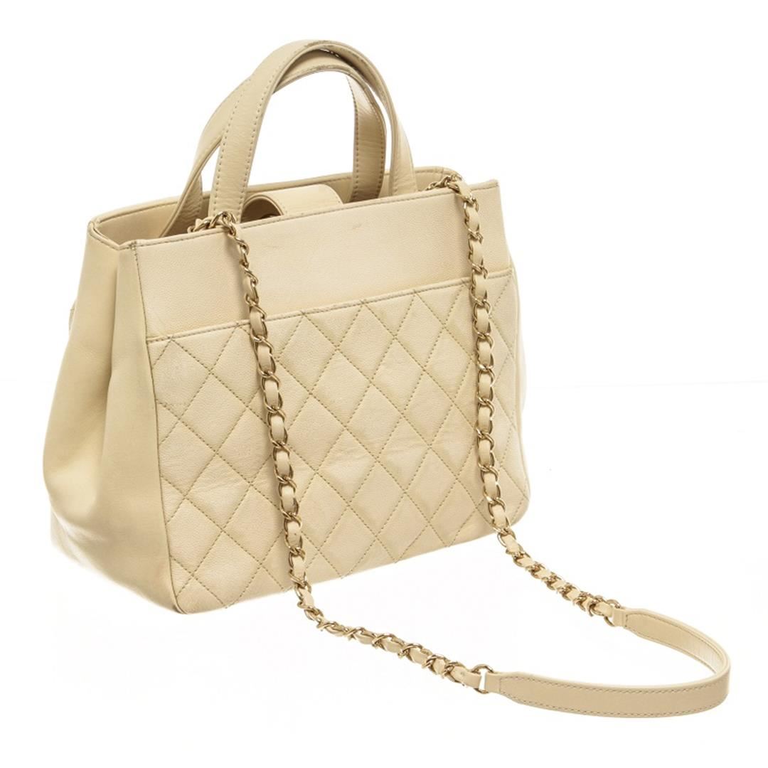 Chanel Beige Leather Business Affinity Shoulder Bag. All available information is listed in the description and shown in the photos. Chanel beige leather Business Affinity shoulder bag with quilted beige leather exterior, gold-tone hardware, turn-lock closure, beige leather lining, exterior zip pocket, interior zip slip pocket, dual top handle, long shoulder chain, and snap closure. There are some stains, leather wear, marking in the lining. Please refer to photos. Height: 10.5" Width: 13" Depth: 6", Handle Drop: / 26.67 x 33.02 x 15.24 Cm