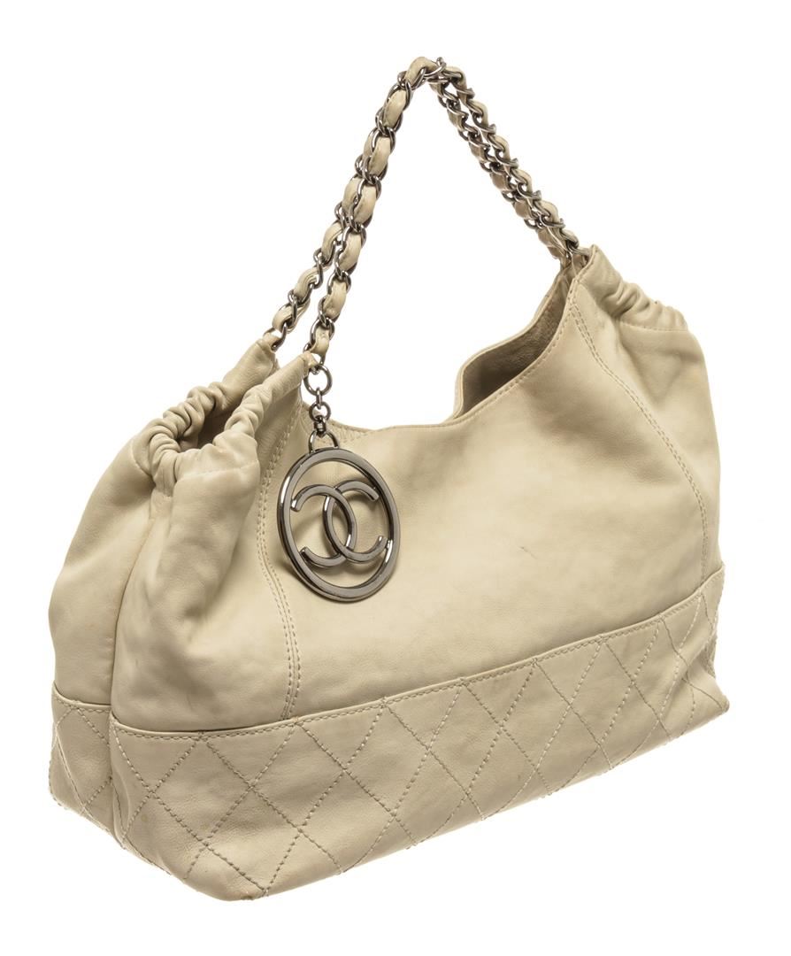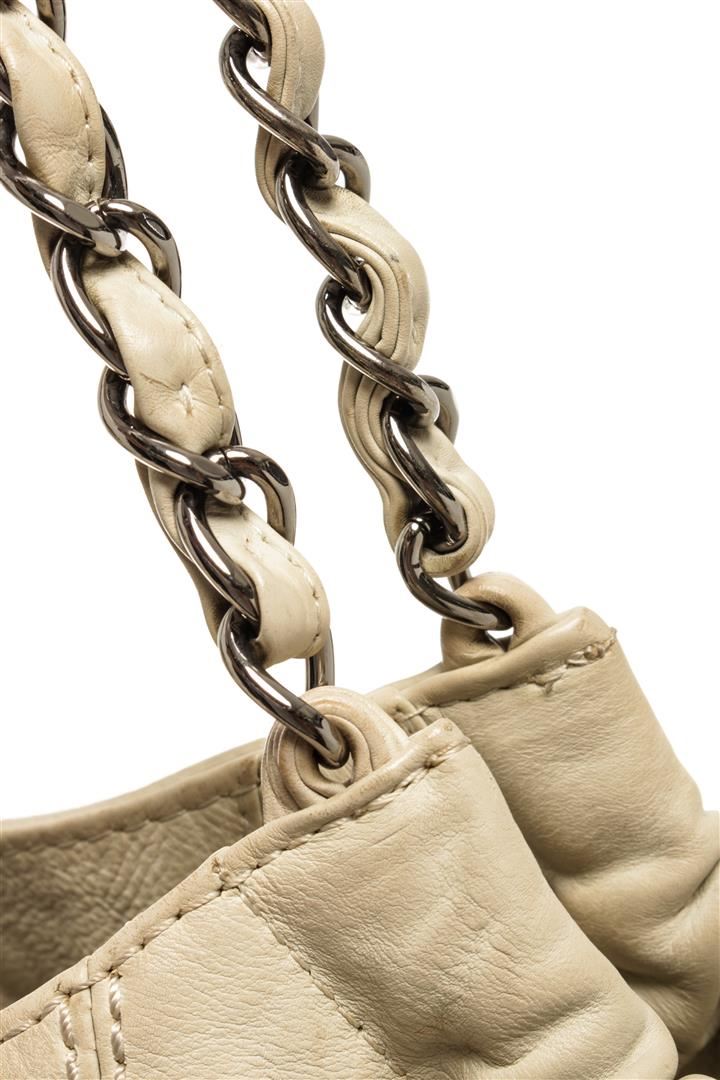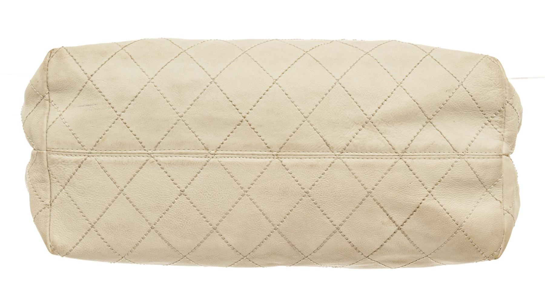 One Chanel Beige Leather Coco Cabas Tote Bag. Item is sold AS-IS. All available information is listed in the description and shown in the photo. Chanel beige leather Coco Cabas tote bag with relaxed beige leather exterior, with the bottom half having diamond-patterned stitching, silver-tone hardware, a CC logo, two top chain-link shoulder straps, beige satin lining, one interior zip pocket, and snap button closure. Corners are worn, fabric lining is very stained. Please refer to photos.