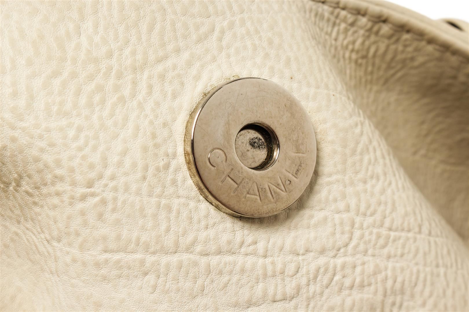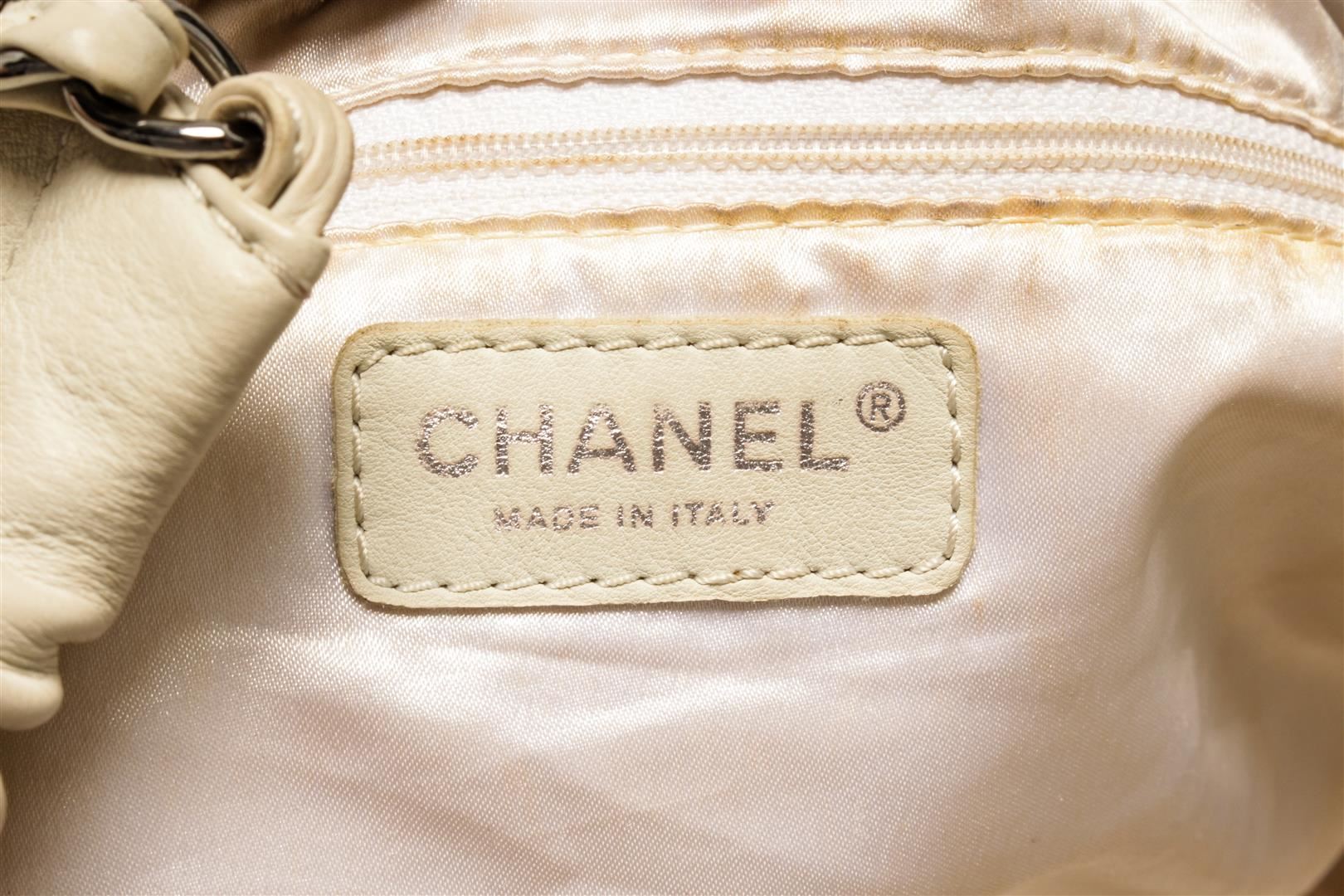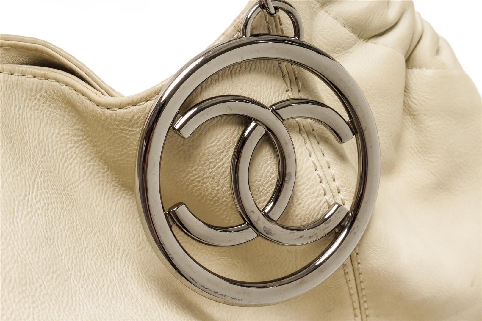 One Chanel Beige Leather Coco Cabas Tote Bag. Item is sold AS-IS. All available information is listed in the description and shown in the photo. Chanel beige leather Coco Cabas tote bag with relaxed beige leather exterior, with the bottom half having diamond-patterned stitching, silver-tone hardware, a CC logo, two top chain-link shoulder straps, beige satin lining, one interior zip pocket, and snap button closure. Corners are worn, fabric lining is very stained. Please refer to photos.