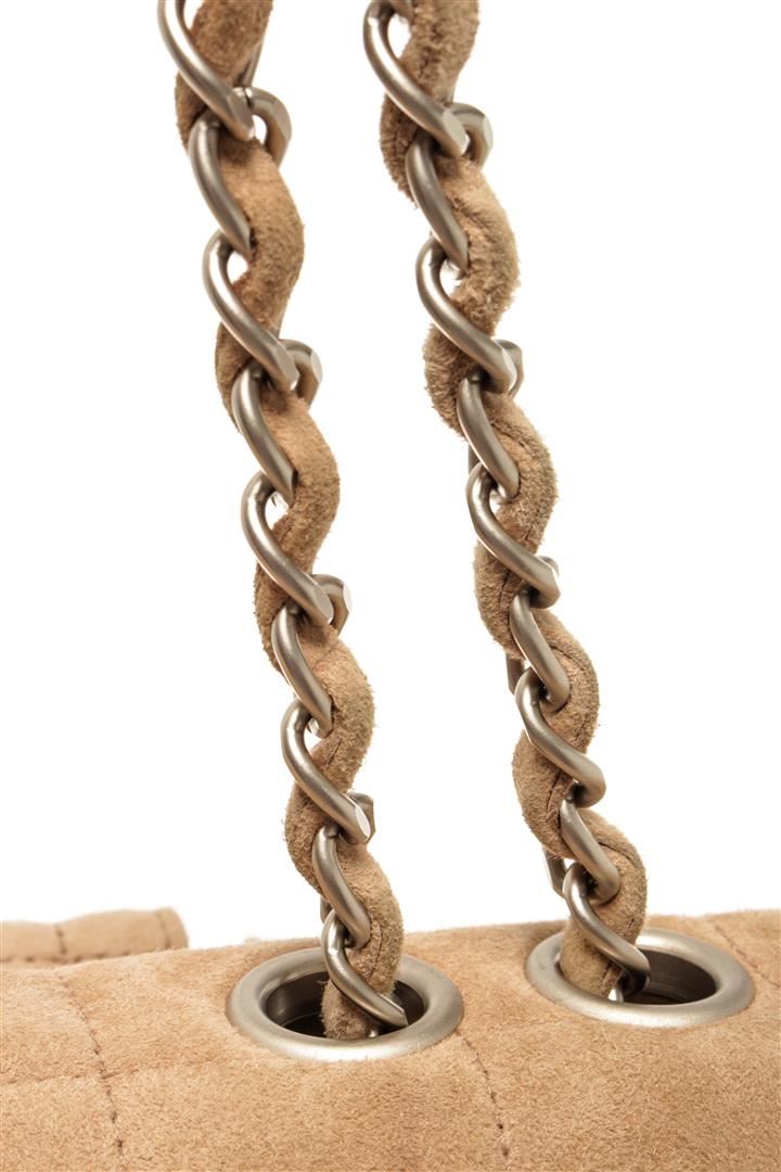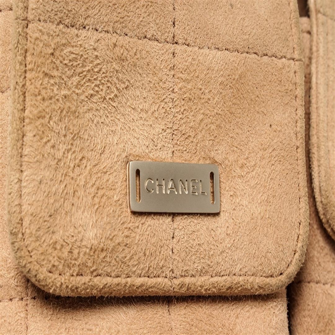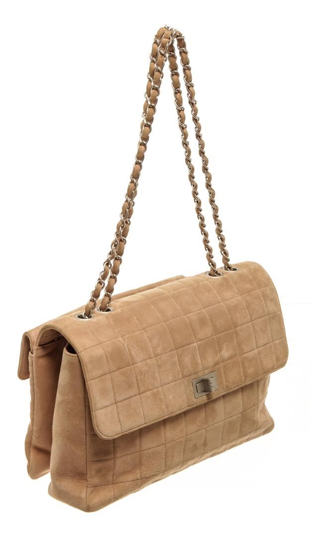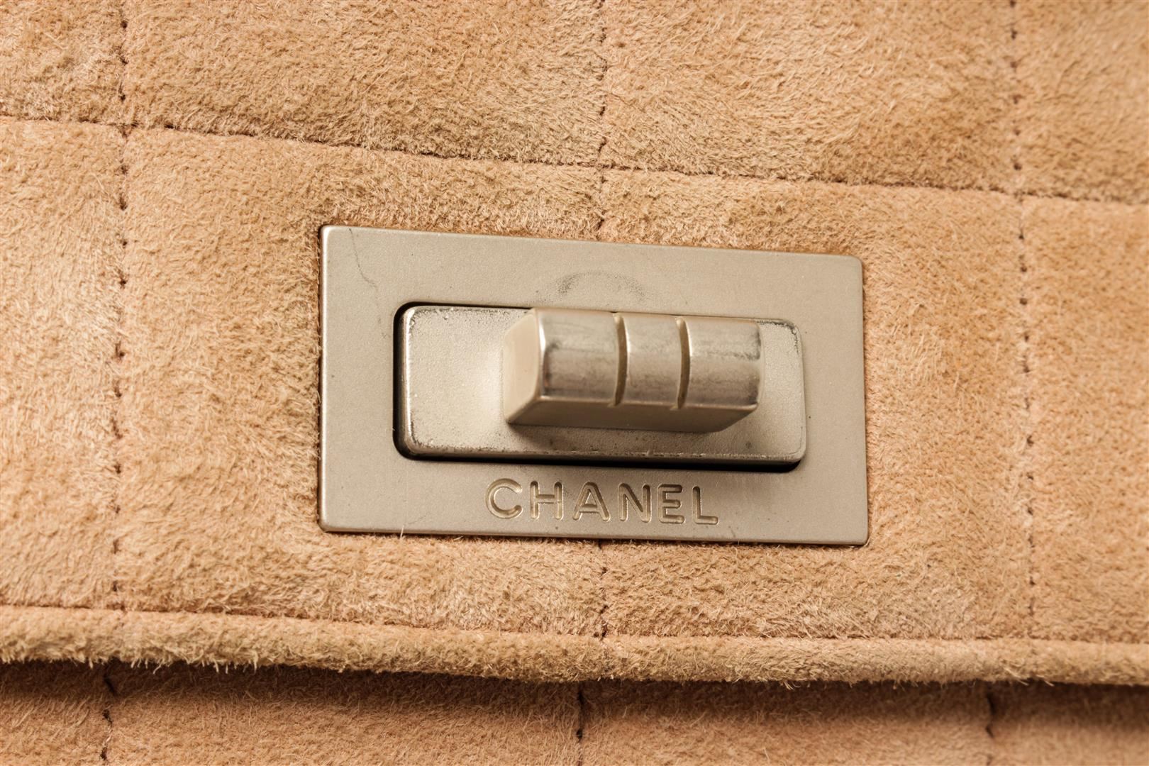One Chanel Beige Suede Leather Reissue Chocolate Bar Shoulder Bag. Item is sold AS-IS. All available information is listed in the description and shown in the photo. Chanel beige suede leather reissue chocolate bar shoulder bag with single flap, beige grosgrain lining, featuring three pockets on the back, opaque silver-tone metal chain interlaced with beige suede leather and mademoiselle turn-lock, two inner labels reading Chanel. There are some stains on the fabric lining as shown in photos. Height: 7.48" Width: 12.20" Depth: 3.93", Handle Drop: 3.5" / 19 x 31 x 10 Cm