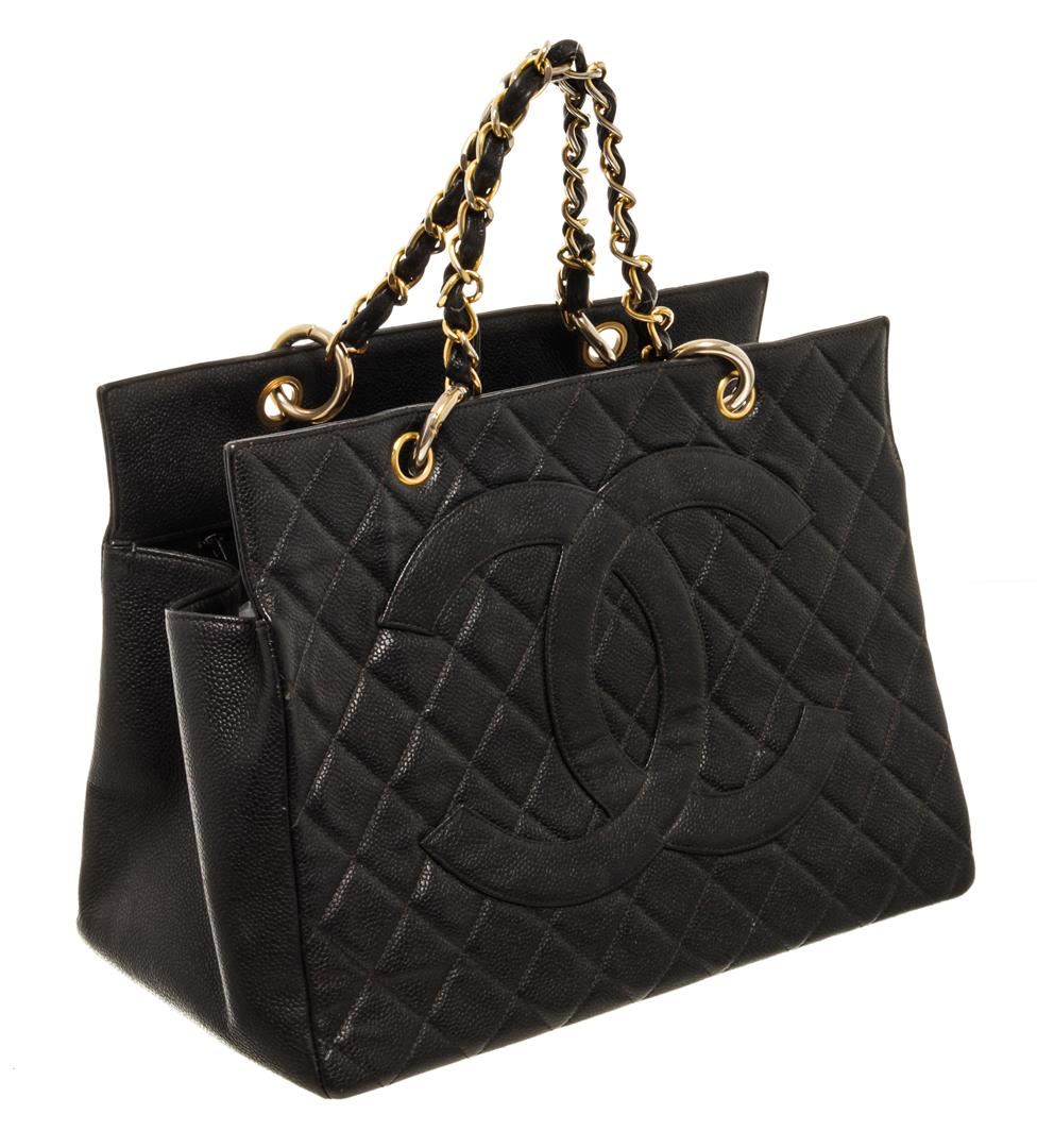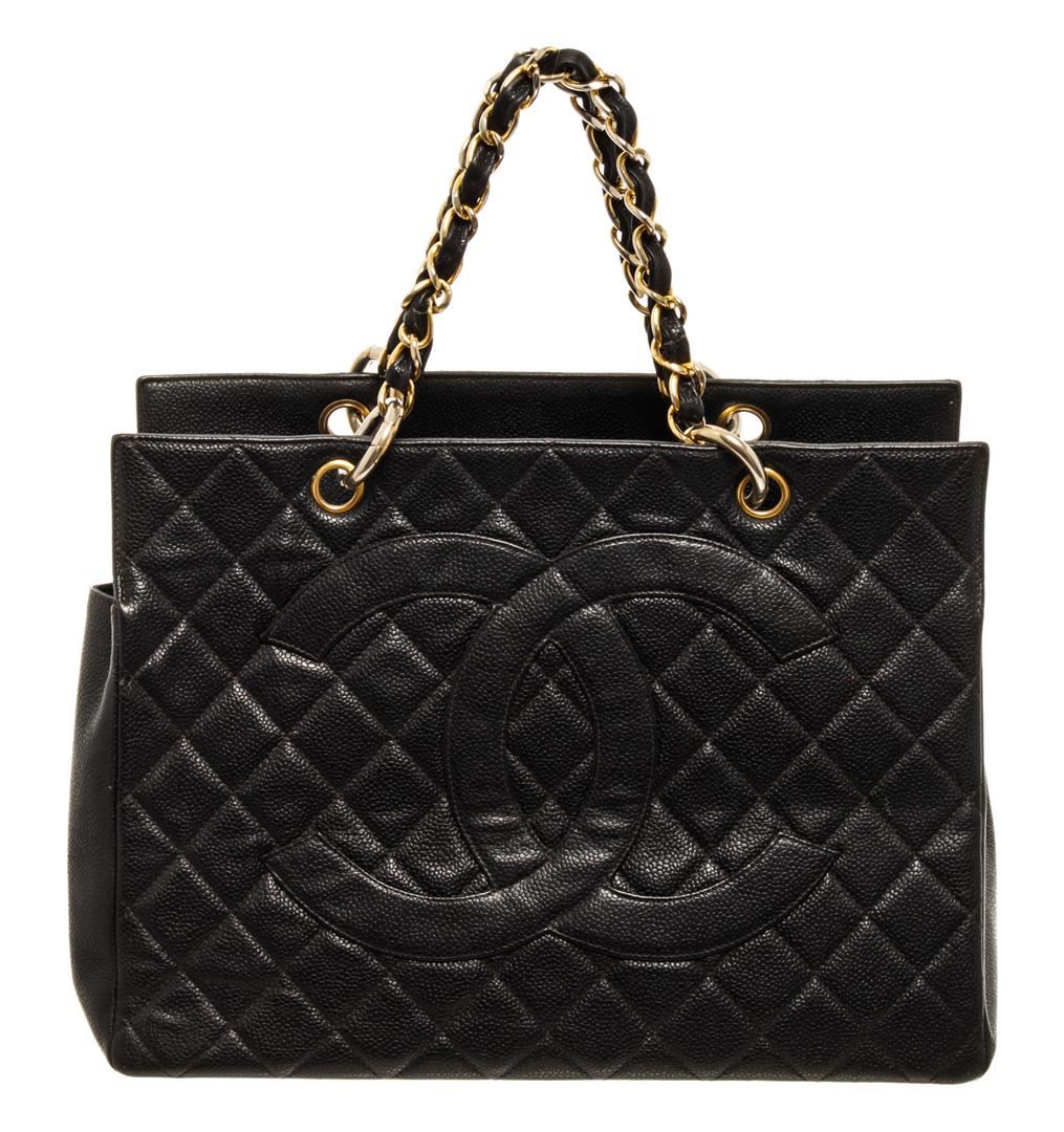Chanel Black Caviar Quilted Leather Vintage GST. All available information is listed in the description and shown in the photos. Chanel Black Caviar Quilted Leather Vintage GST with chain/leather shoulder strap, two slip pockets, leather lining, gold hardware.
