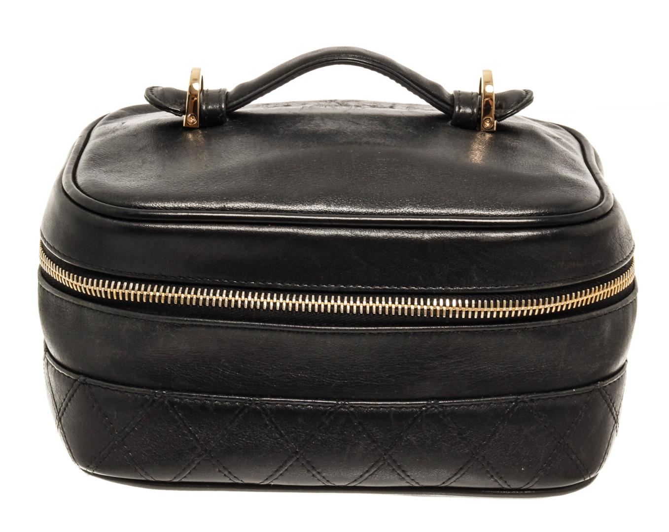 One Chanel Black Lambskin Vintage Vanity Case. Item is sold AS-IS. All available information is listed in the description and shown in the photo. Chanel Black Lambskin Vintage Vanity Case with gold-tone hardware, diamond quilted leather detailing at the bottom part, CC gold-tone metal logo on a round shaped leather zipper charm, black leather interior, single flat leather top handle, and zipper closure. .