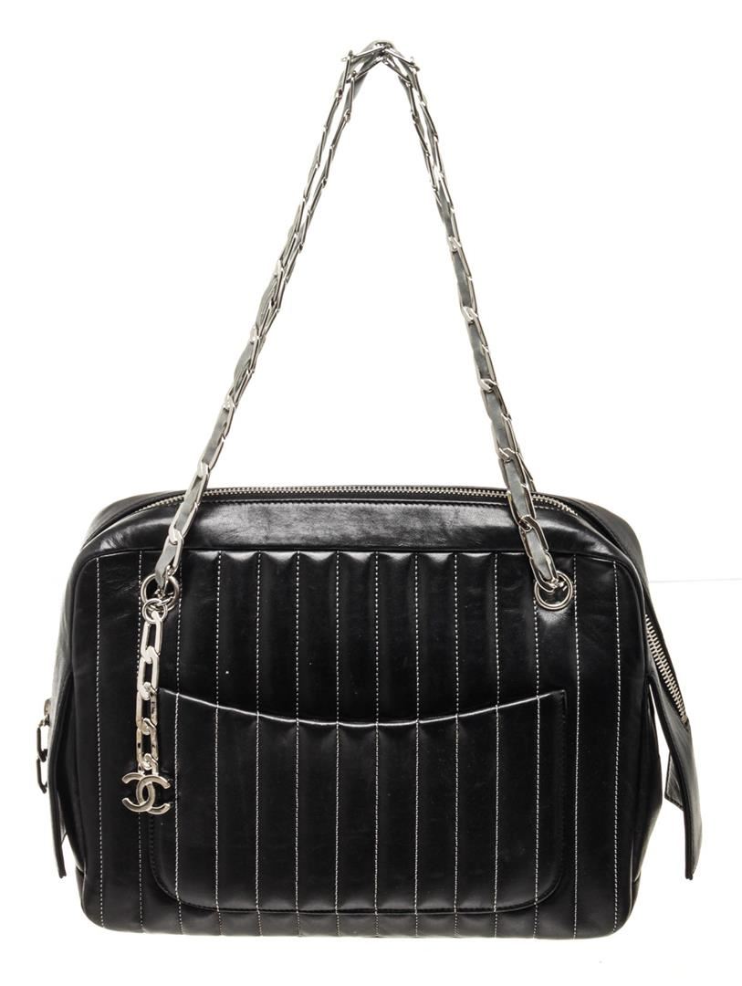 One Chanel Black Leather Mademoiselle Shoulder Bag. Item is sold AS-IS. All available information is listed in the description and shown in the photo. Chanel Black Leather Mademoiselle Shoulder Bag with leather, silver-tone hardware, trim leather, interior zip slip pocket, chain shoulder strap and zipper closure.