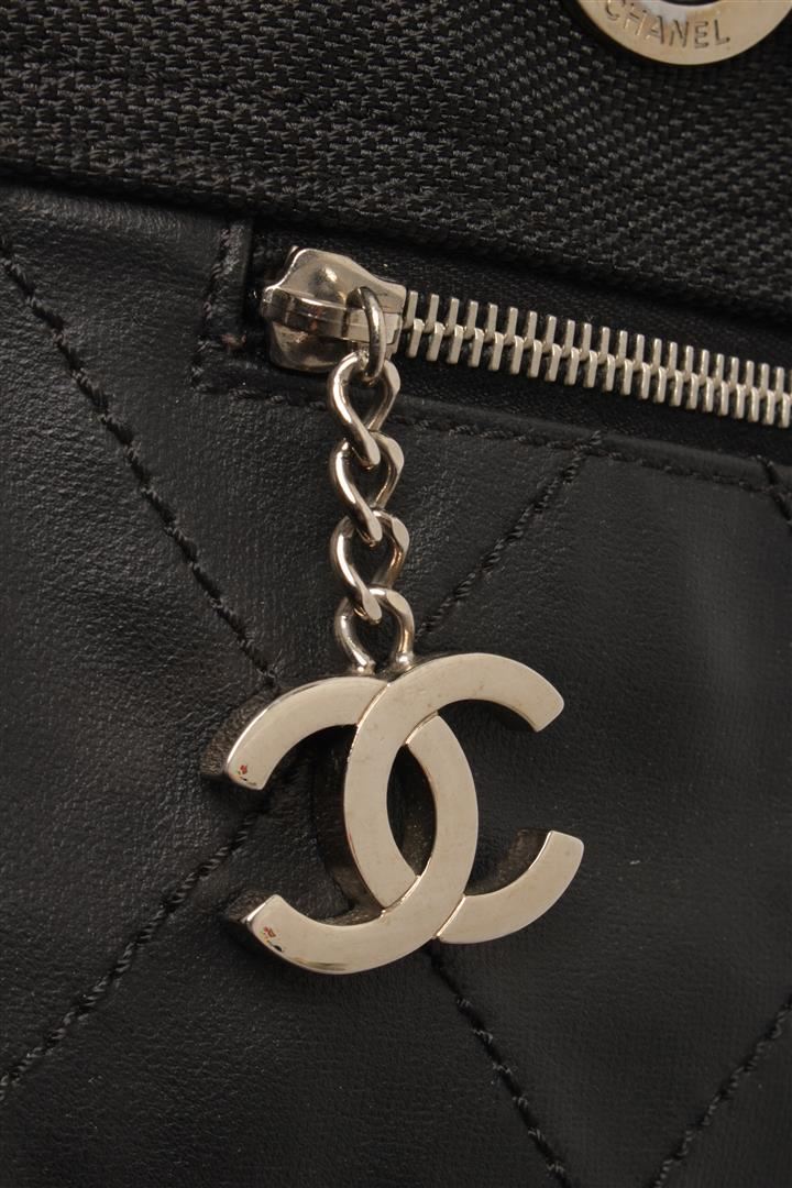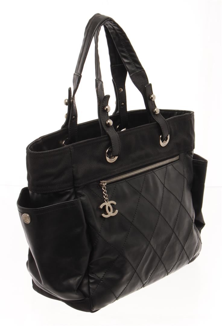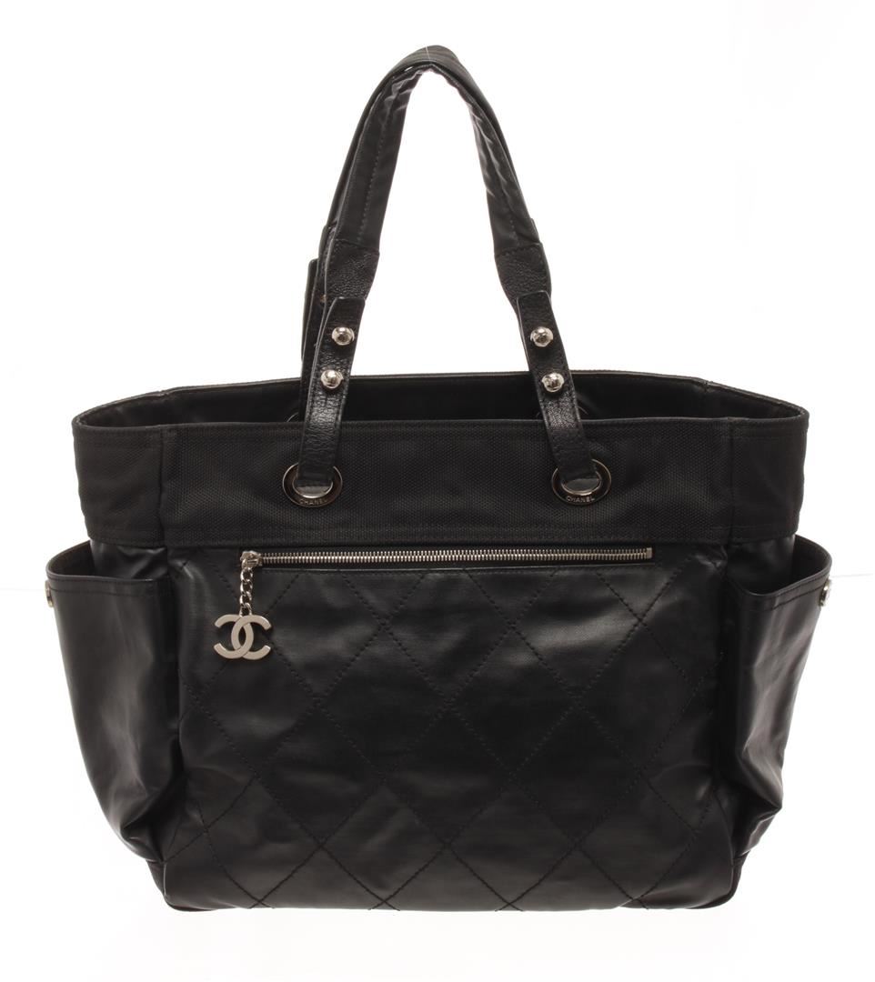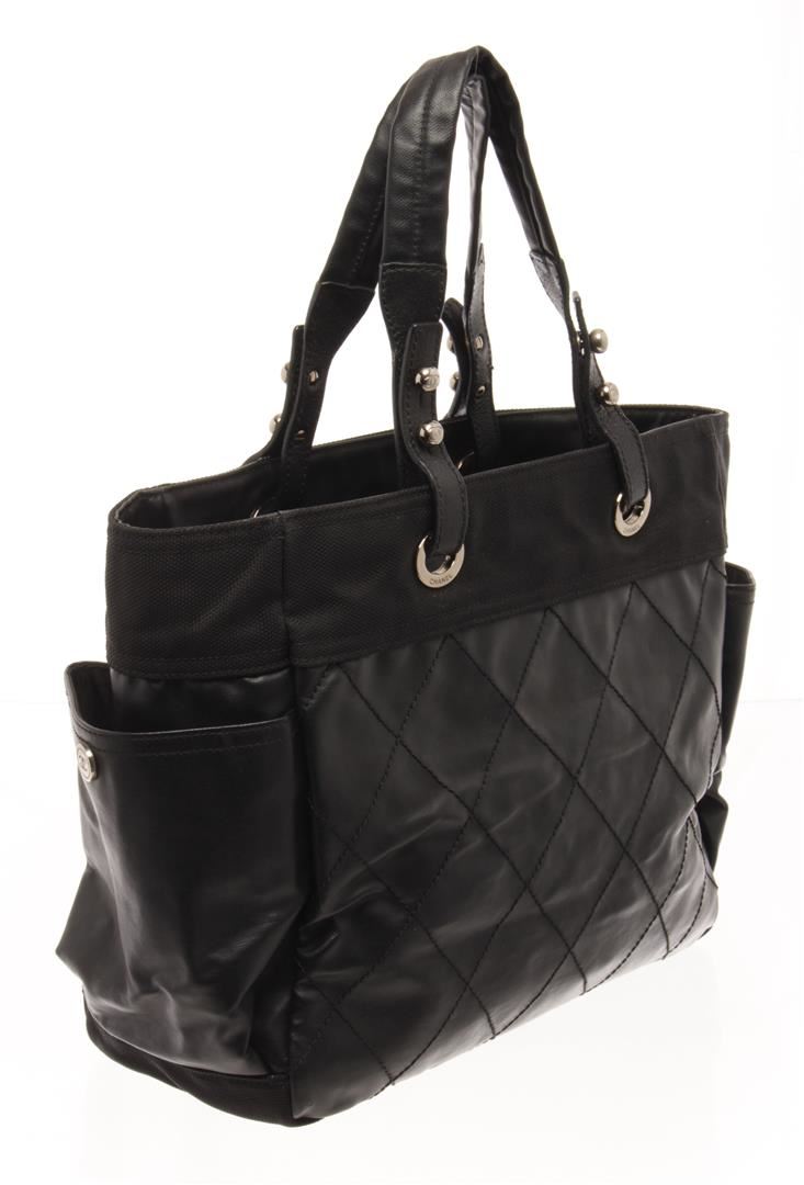 One Chanel Black Quilted Coated Canvas Biarritz Tote Bag. Item is sold AS-IS. All available information is listed in the description and shown in the photo. chanel black quilted coated canvas biarritz tote bag with black coated canvas and comes with and a studded bottom, extended canvas upper, a zipper pocket with cc zipper pull at the front, side pockets and double flat handles, the top zip closure opens to a fabric- lined interior with a slip pocket and a zipper pocket. Length: 40 cm, Width: 15.5 cm, Height, 29 cm / 15.74" x 6.10" x 11.41" Inches