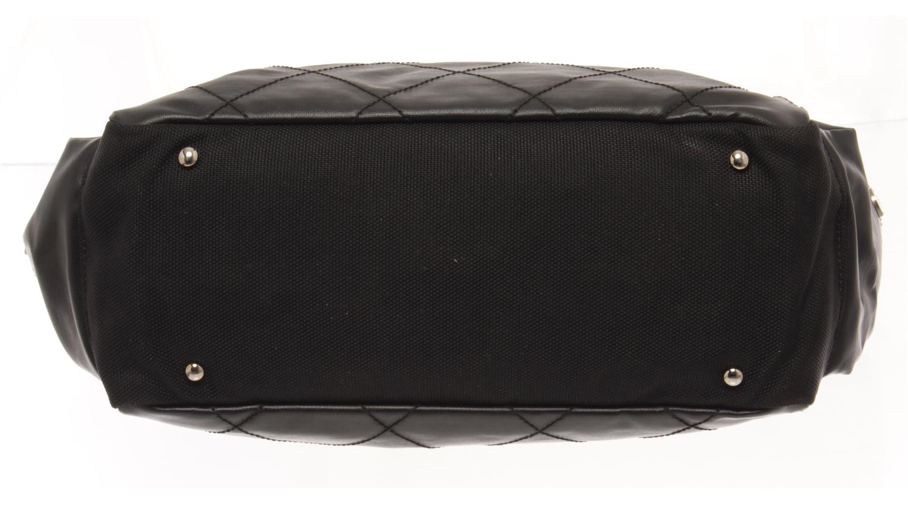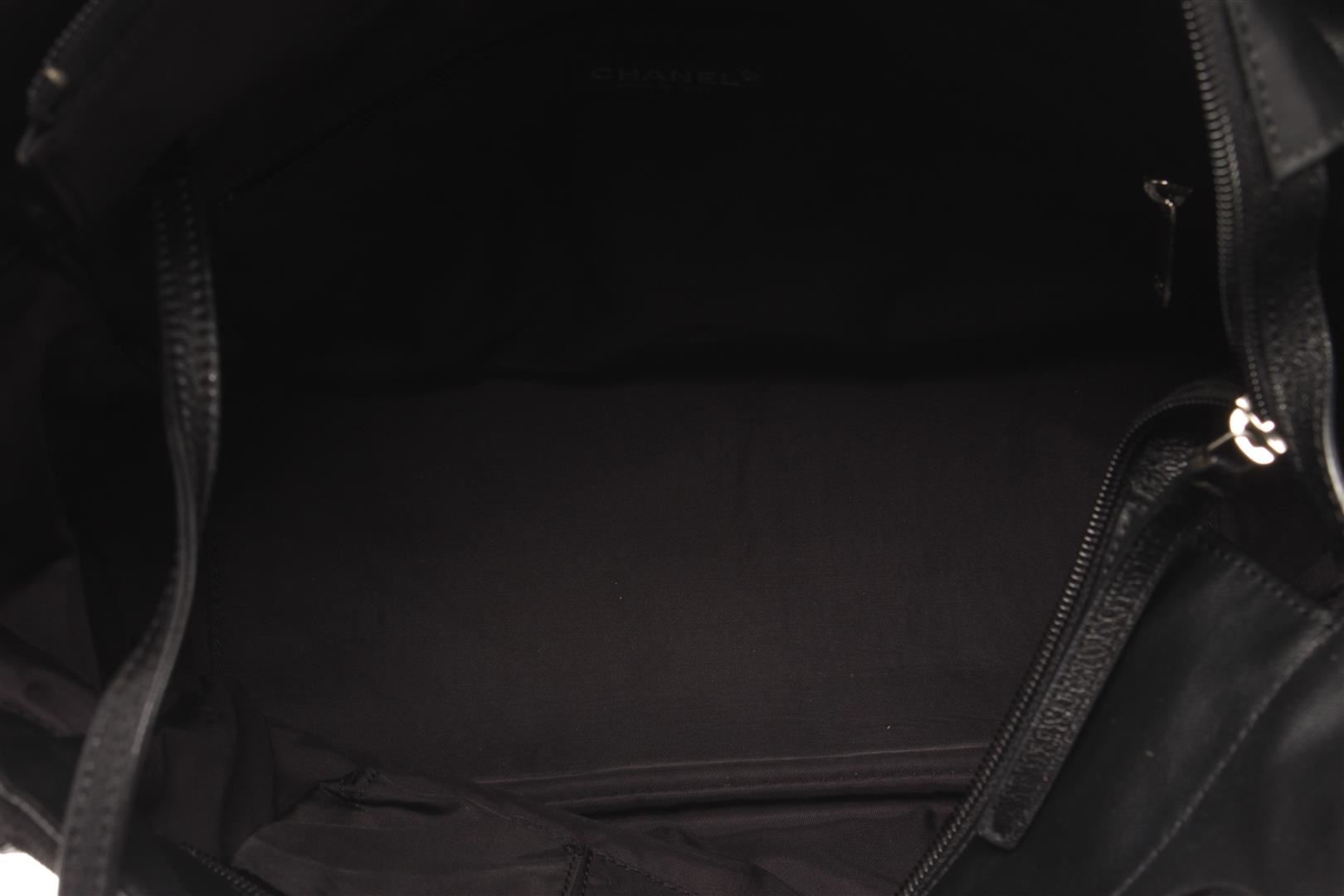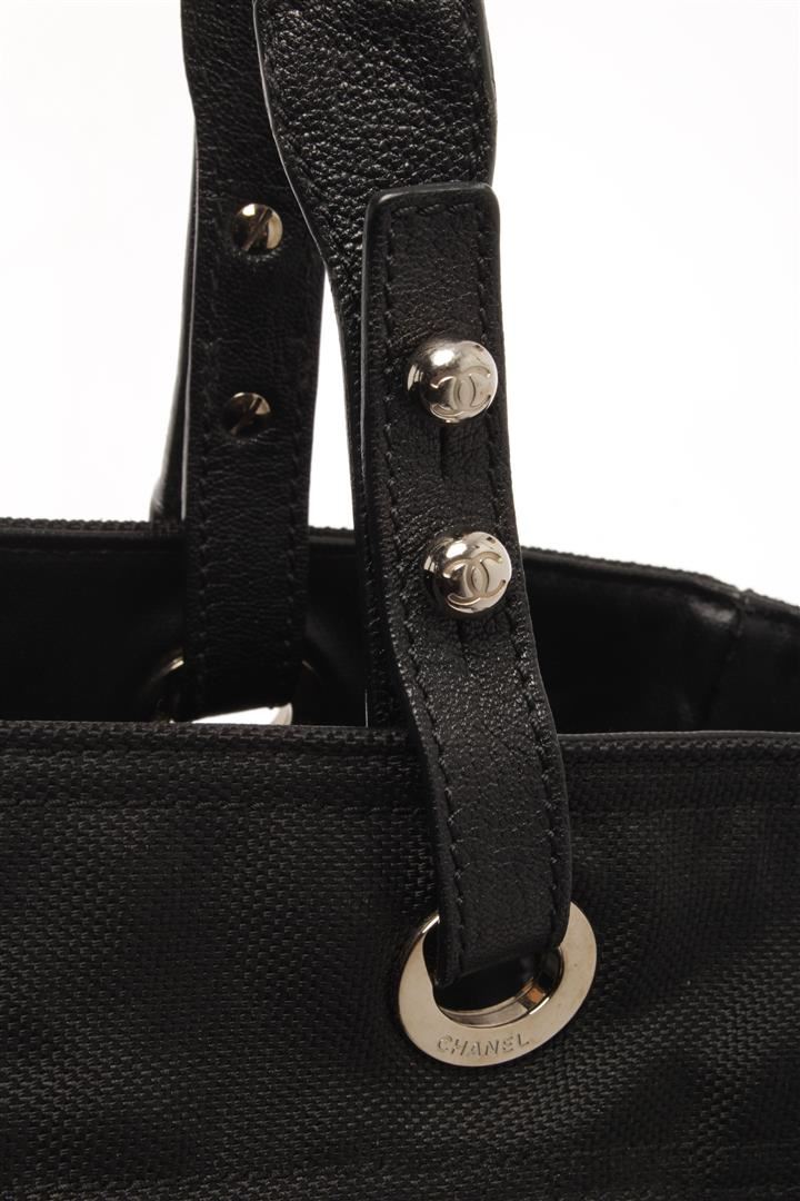 One Chanel Black Quilted Coated Canvas Biarritz Tote Bag. Item is sold AS-IS. All available information is listed in the description and shown in the photo. chanel black quilted coated canvas biarritz tote bag with black coated canvas and comes with and a studded bottom, extended canvas upper, a zipper pocket with cc zipper pull at the front, side pockets and double flat handles, the top zip closure opens to a fabric- lined interior with a slip pocket and a zipper pocket. Length: 40 cm, Width: 15.5 cm, Height, 29 cm / 15.74" x 6.10" x 11.41" Inches