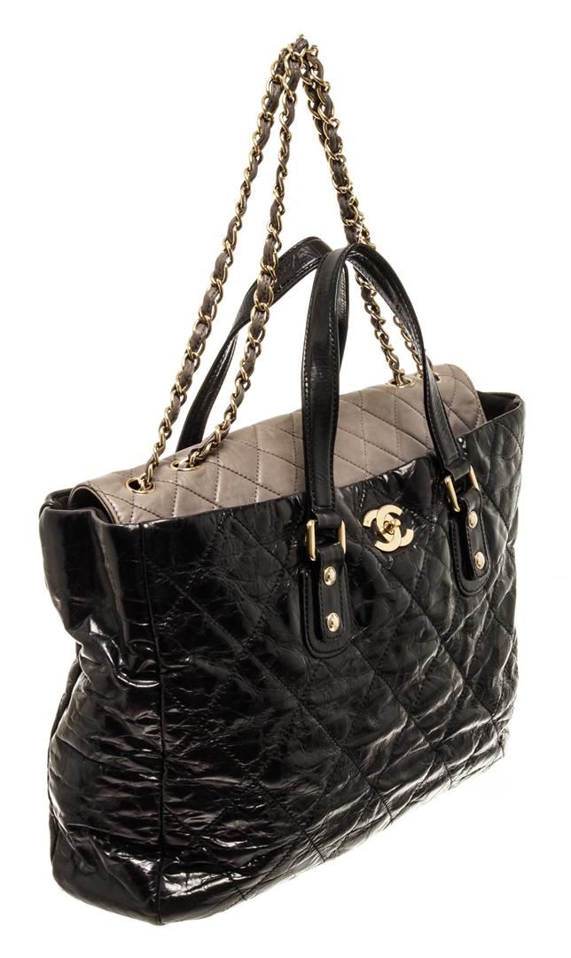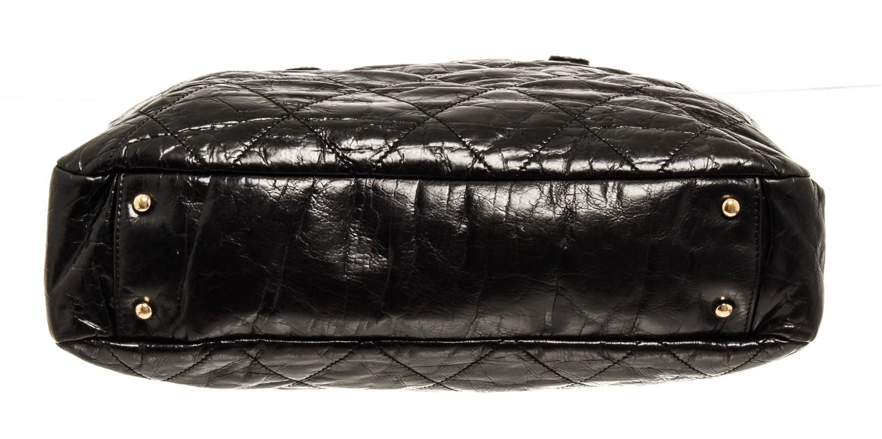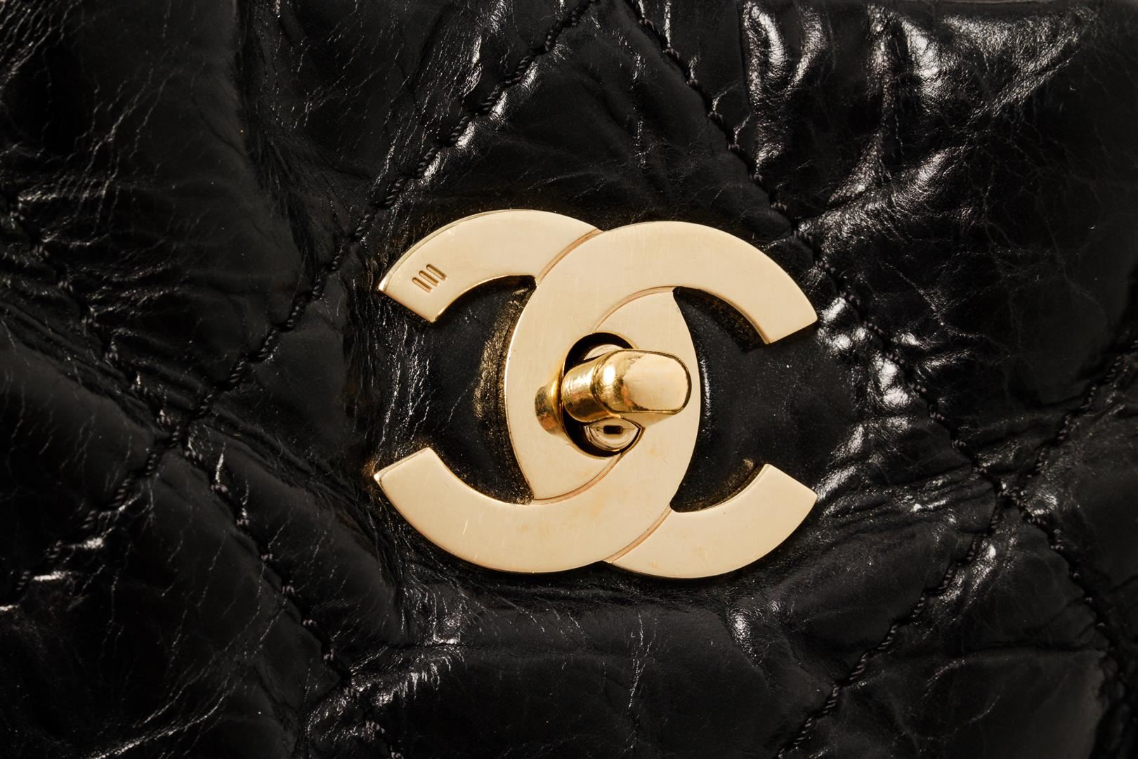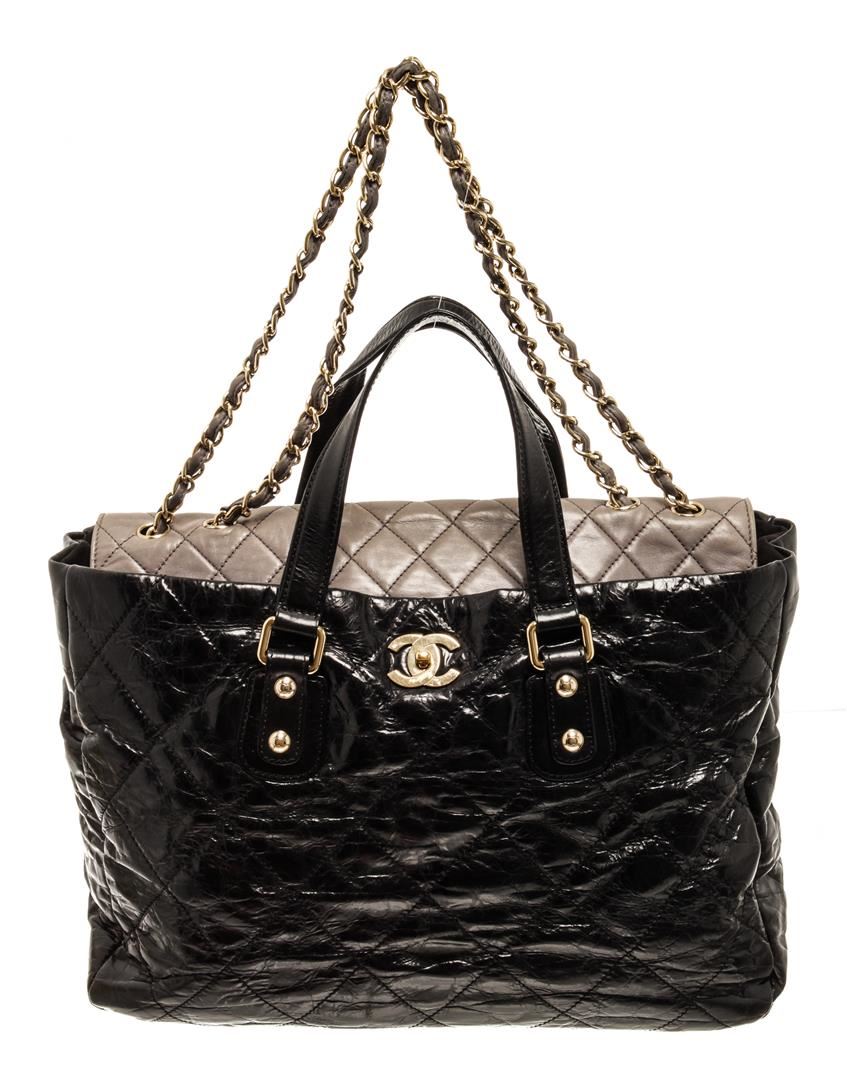 One Chanel Black and Gold Leather Portobello Tote bag. Item is sold AS-IS. All available information is listed in the description and shown in the photo. Chanel black and gold leather Portobello tote bag with black quilted leather exterior, gold flap quilted leather, black top handles, two chain-link straps, gold-tone hardware, turn-lock closure, and grey striped fabric lining. Leather is creased as shown in pictures. Height: 13" Width: 3.55" Length: 16.15", Handle Drop: / 33 x 3.55 x 41 Cm