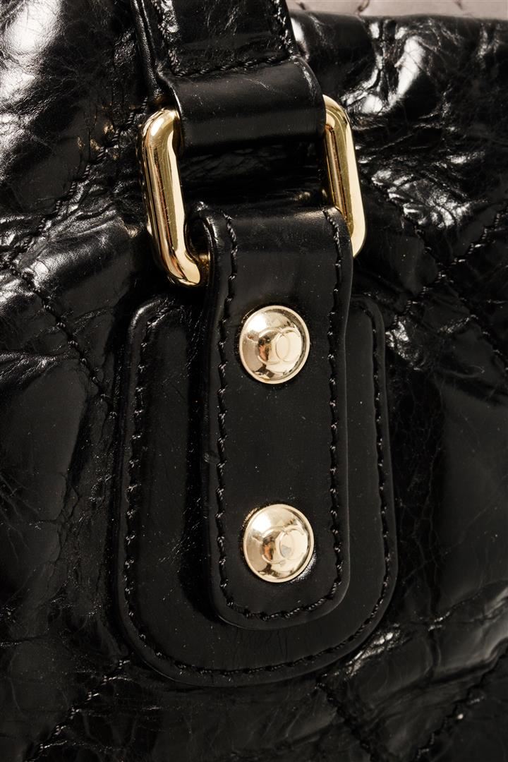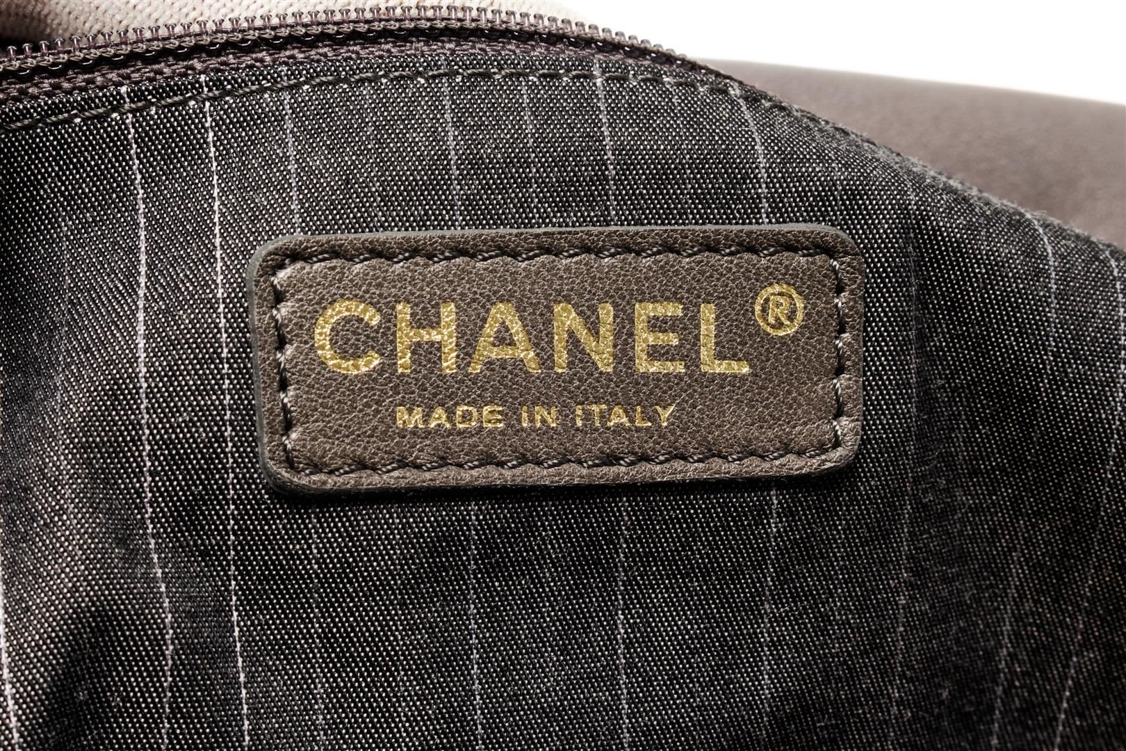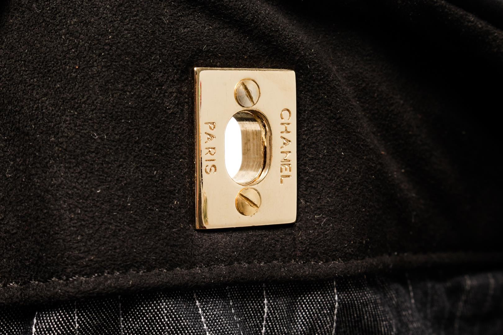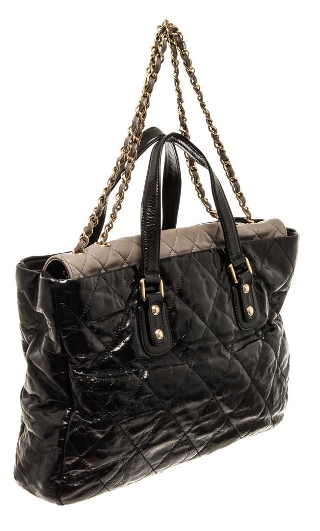 One Chanel Black and Gold Leather Portobello Tote bag. Item is sold AS-IS. All available information is listed in the description and shown in the photo. Chanel black and gold leather Portobello tote bag with black quilted leather exterior, gold flap quilted leather, black top handles, two chain-link straps, gold-tone hardware, turn-lock closure, and grey striped fabric lining. Leather is creased as shown in pictures. Height: 13" Width: 3.55" Length: 16.15", Handle Drop: / 33 x 3.55 x 41 Cm