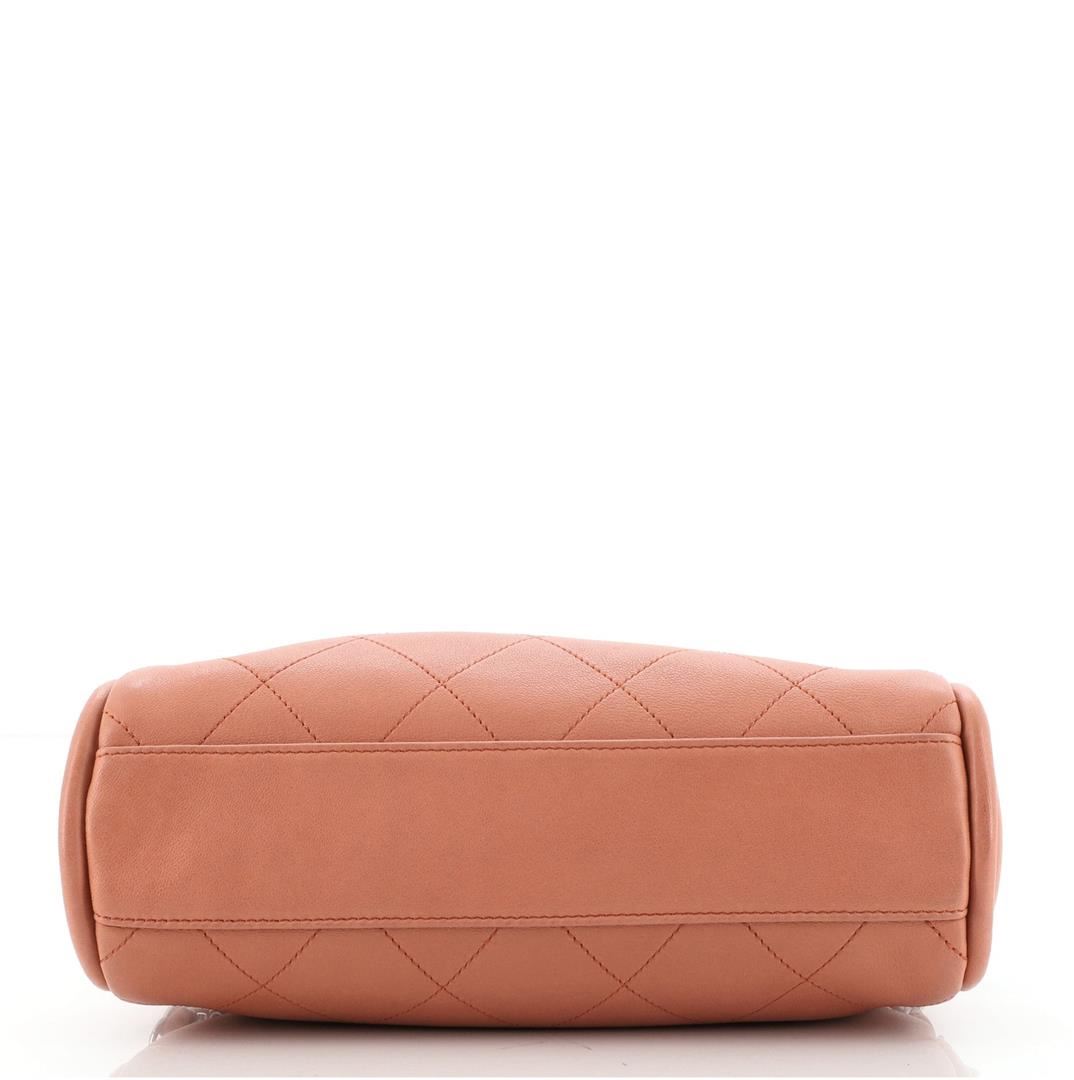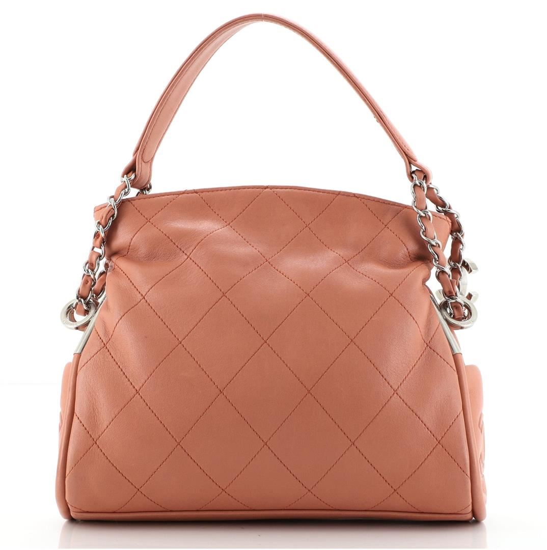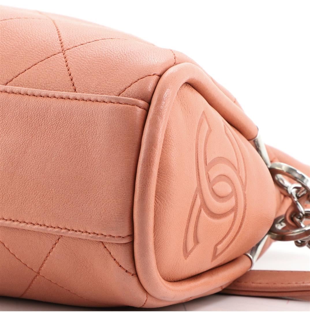 One Chanel Pink Quilted Leather Ultimate Small Soft Hobo Bag. Item is sold AS-IS. All available information is listed in the description and shown in the photo. Chanel Pink Quilted Leather Ultimate Small Soft Hobo Bag features silver-tone hardware, single chain-link and leather shoulder strap with shoulder guard, dual slip pockets with embossed CC accent at sides, tonal logo jacquard lining, single zip pocket at interior and zip closure at top fold-over. Height 8", Width 9.5", Depth 3"