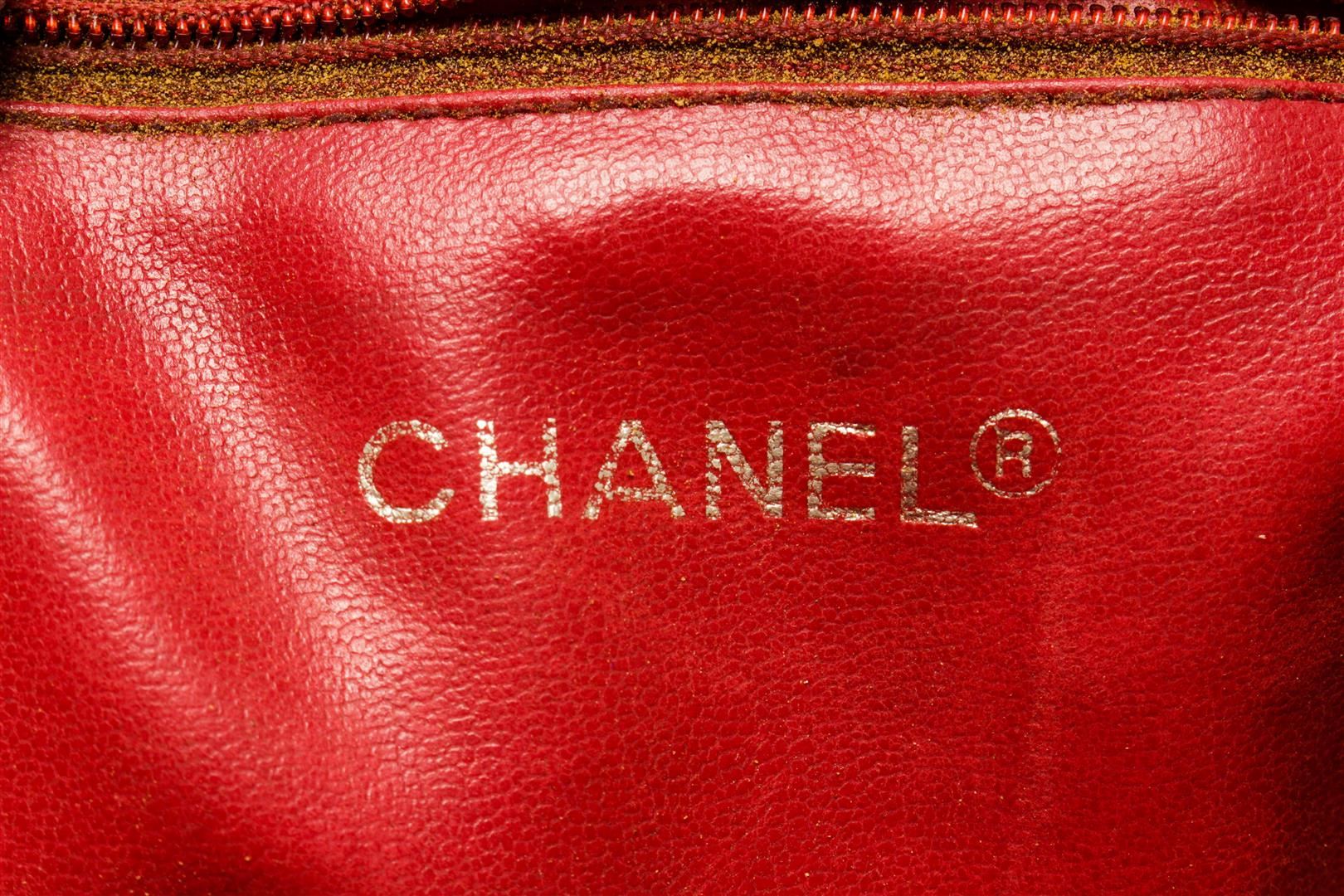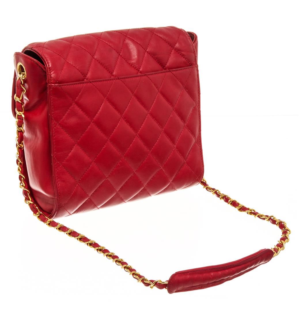 Chanel Red Leather Chain Buckle Flap Shoulder Bag. All available information is listed in the description and shown in the photos. Chanel red leather chain buckle flap shoulder bag with red quilted leather exterior, red leather lining, gold-tone hardware, a long chain with shoulder pad, buckle closure, one main compartment, and one interior zip pocket. There is a scratch on the front, peeling on the lining. Please refer to photos. Body is vintage and body has a chunky feel to it.