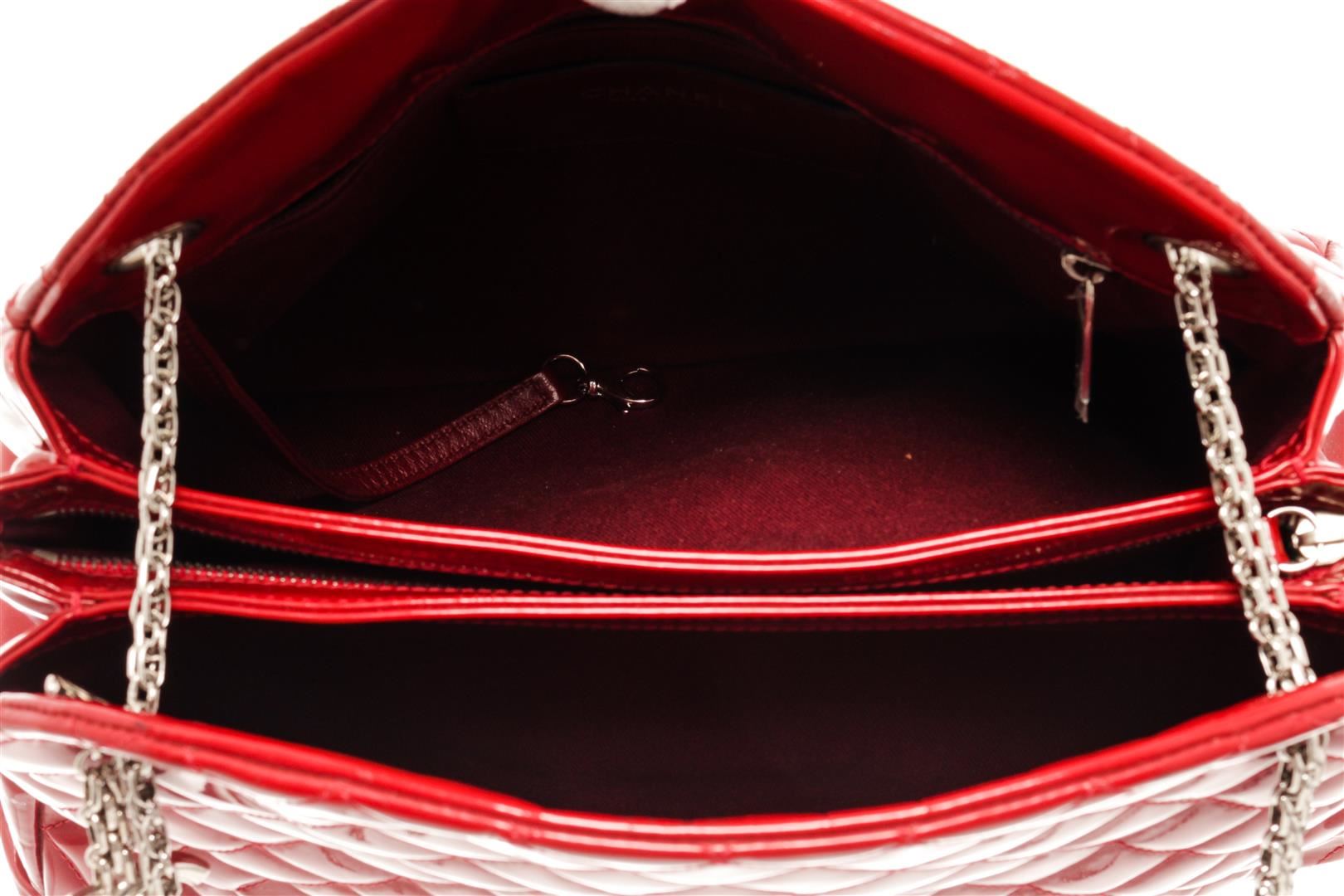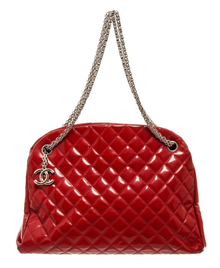 One Chanel Red Leather Mademoiselle Bowler Bag. Item is sold AS-IS. All available information is listed in the description and shown in the photo. Chanel red leather Mademoiselle bowler bag with red quilted patent leather exterior, red fabric interior, three compartments: two with magnetic snap button closure and one with zipper closure; one interior zip pocket, silver-tone hardware, two top handle chains, and an interlocking CC logo charm. There are black stains on patent leather. Some creasing. Please refer to photos. Height: 10.63" Width: 5.12" Length: 13", Handle Drop: / 27 x 13 x 33 Cm