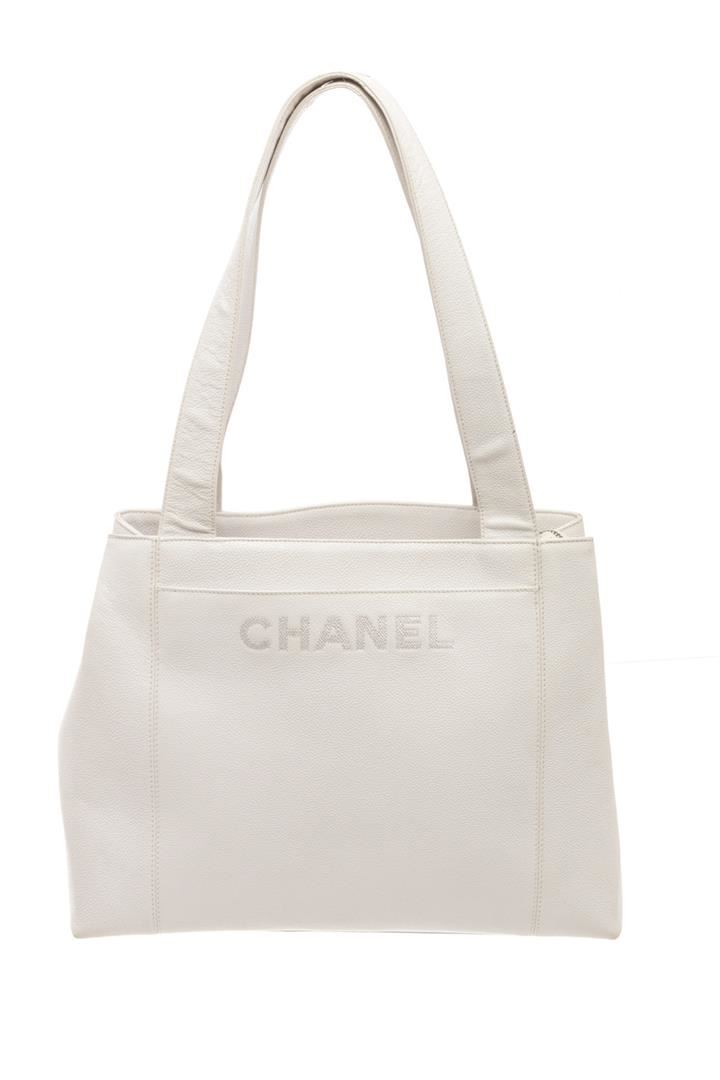 Chanel White Caviar Leather Tote Bag. All available information is listed in the description and shown in the photos. Chanel White Caviar Leather Tote Bag with double flat leather handles, two exterior slip pockets, white fabric lined interior with two zip pockets, and gold tone hardware, embroidered on the front side, three compartments: two open and one middle compartment with top zip closure.