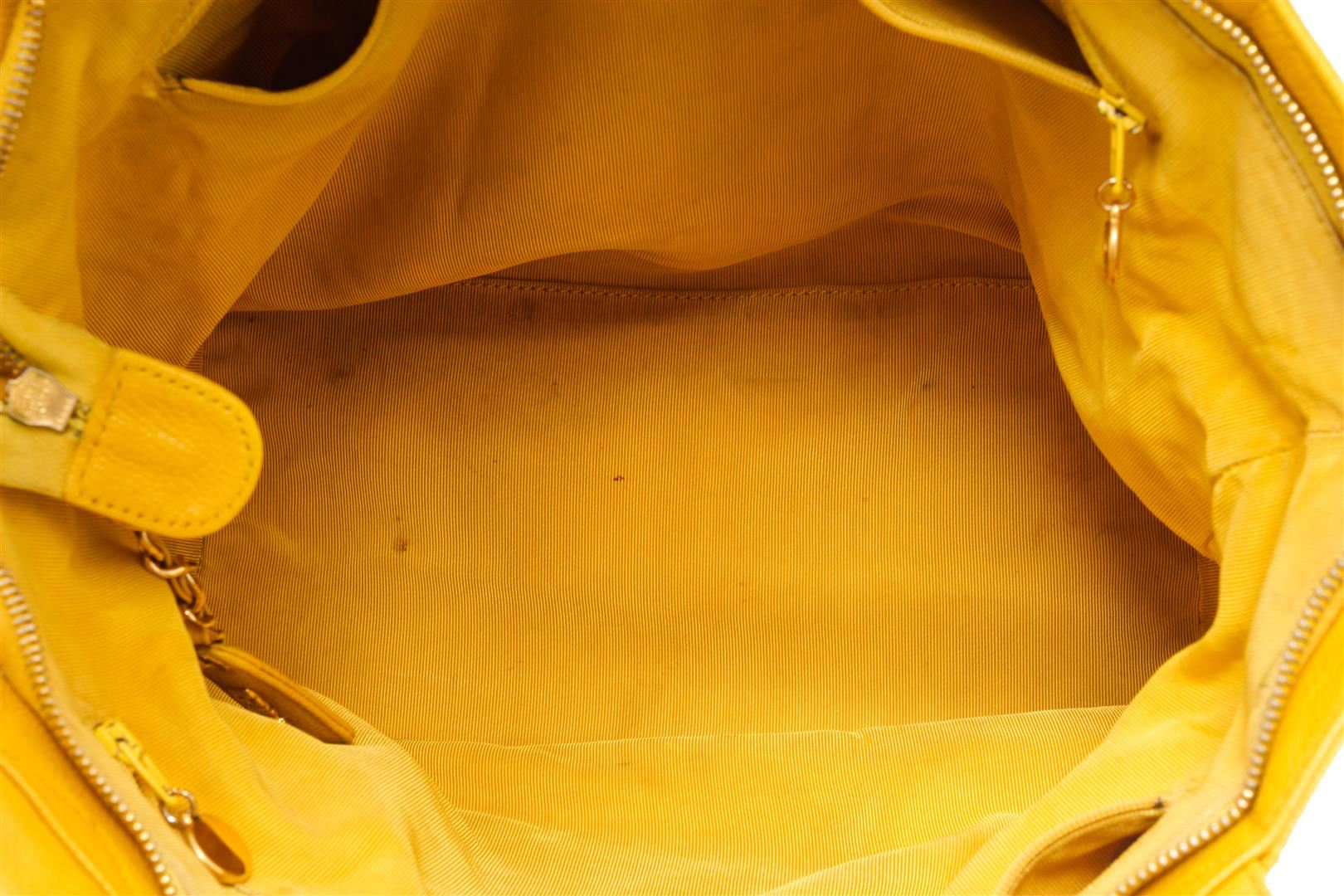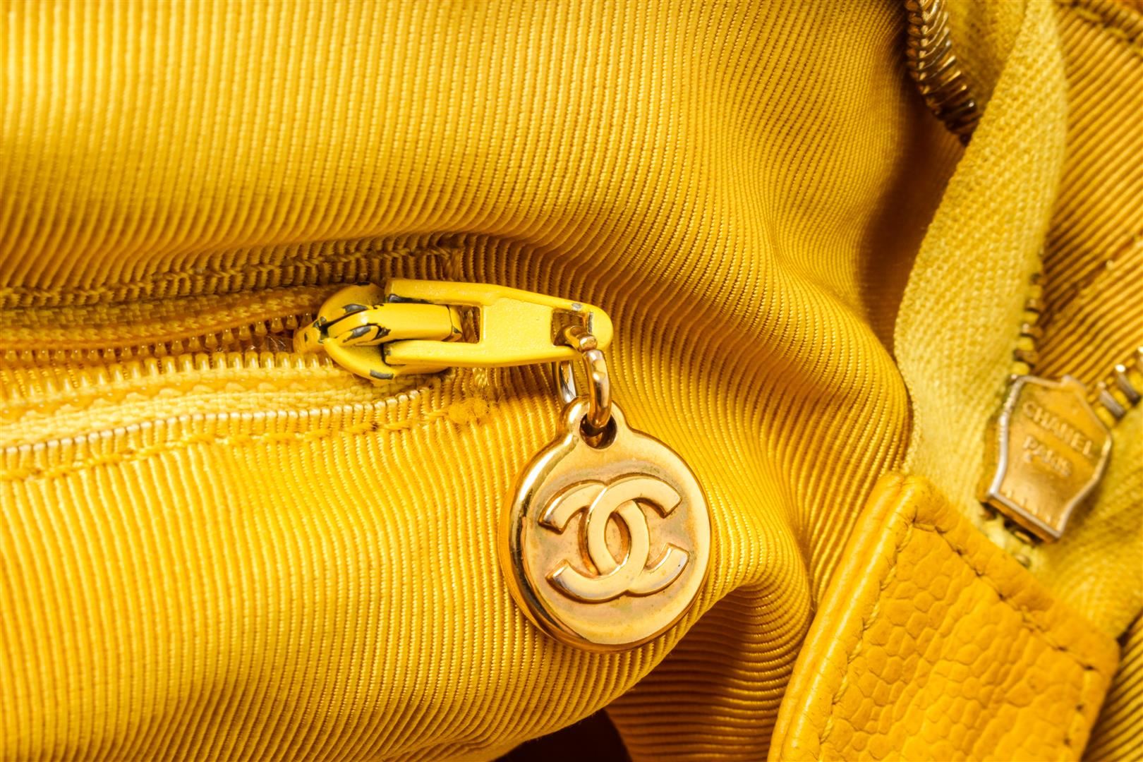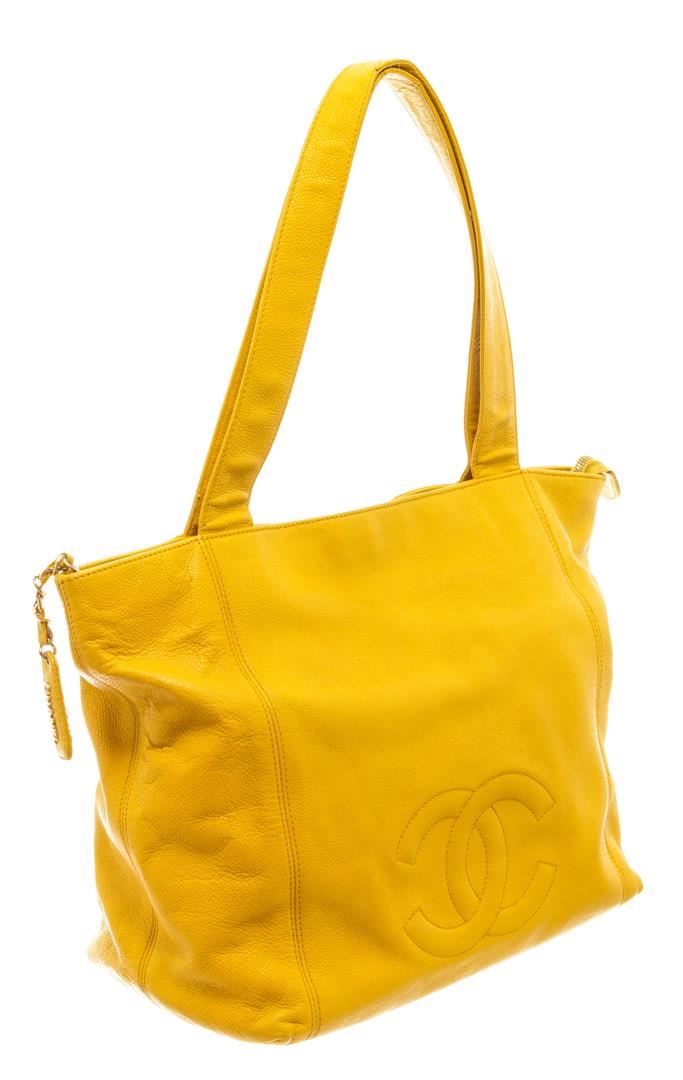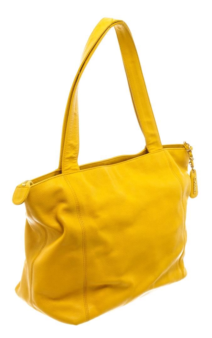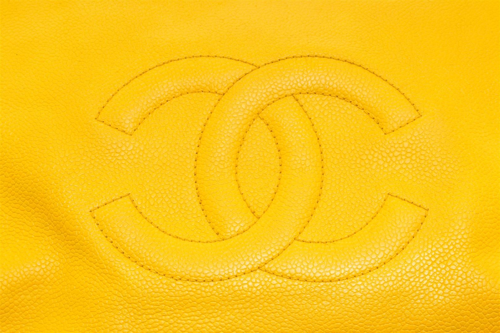 One Chanel Yellow Leather Vintage CC Shoulder Bag. Item is sold AS-IS. All available information is listed in the description and shown in the photo. Chanel yellow leather vintage CC shoulder bag with yellow leather exterior with a stitched-in CC logo on the front, two top handles, yellow fabric lining, gold-tone hardware, zipper closure, Chanel logo on the exterior zipper tab, CC logo on the interior zipper tag, and one main compartment with one zip pocket. There is some wear on the zipper, stains on the canvas lining as shown in pictures.