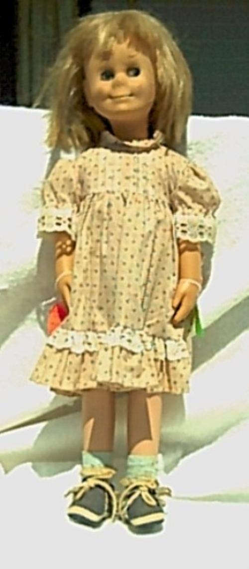 Chatty Kathy back of head "2254", rooted straight blond hair, 25", Bottom marked "Charmin Chatty 1961, Mattel, Inc. Hawthorne, CA, USAA Patent 3,017,187", pale pink printed dress w/purple flowers, open/sleep blue eyes. (Talker not working)