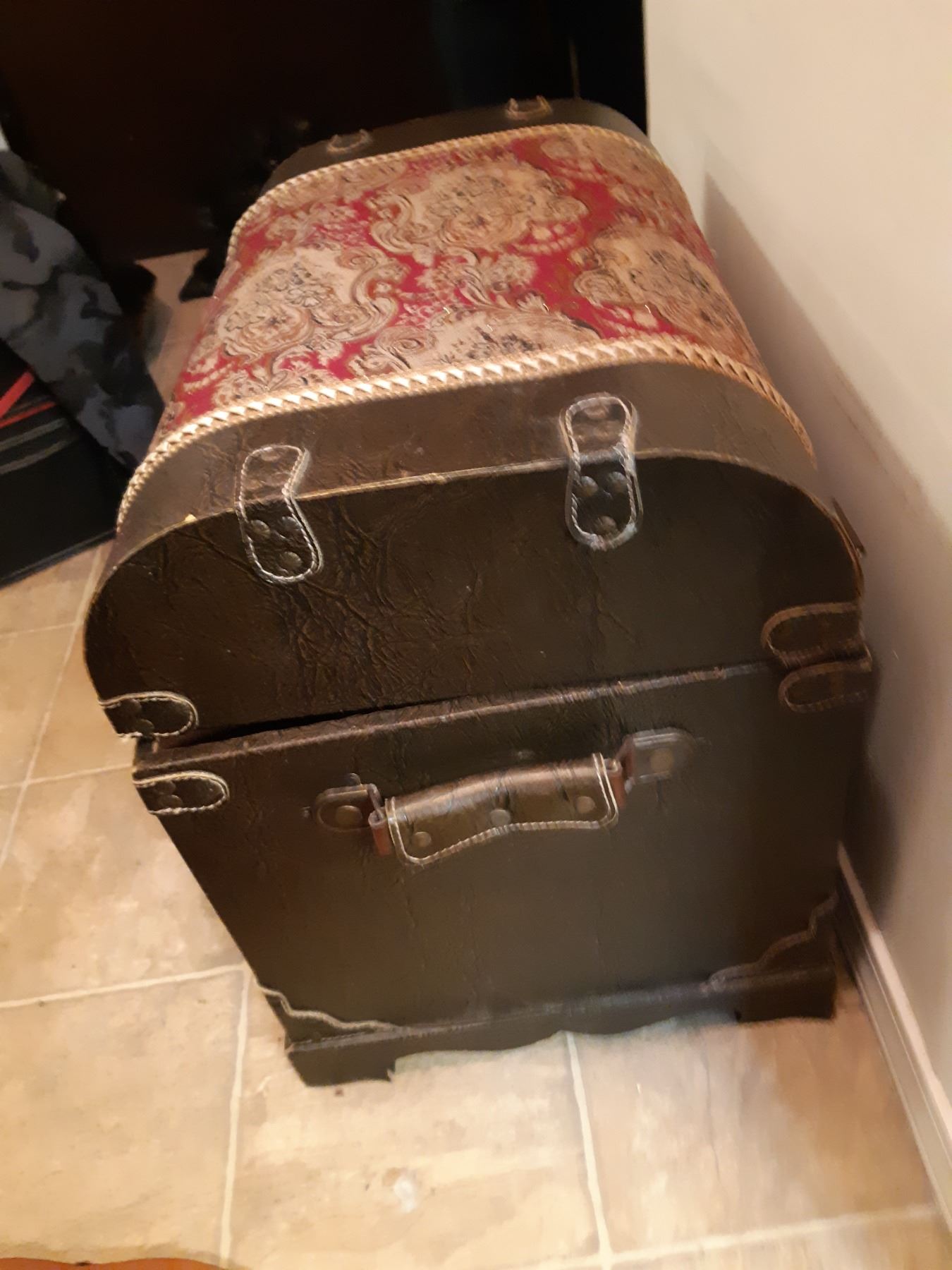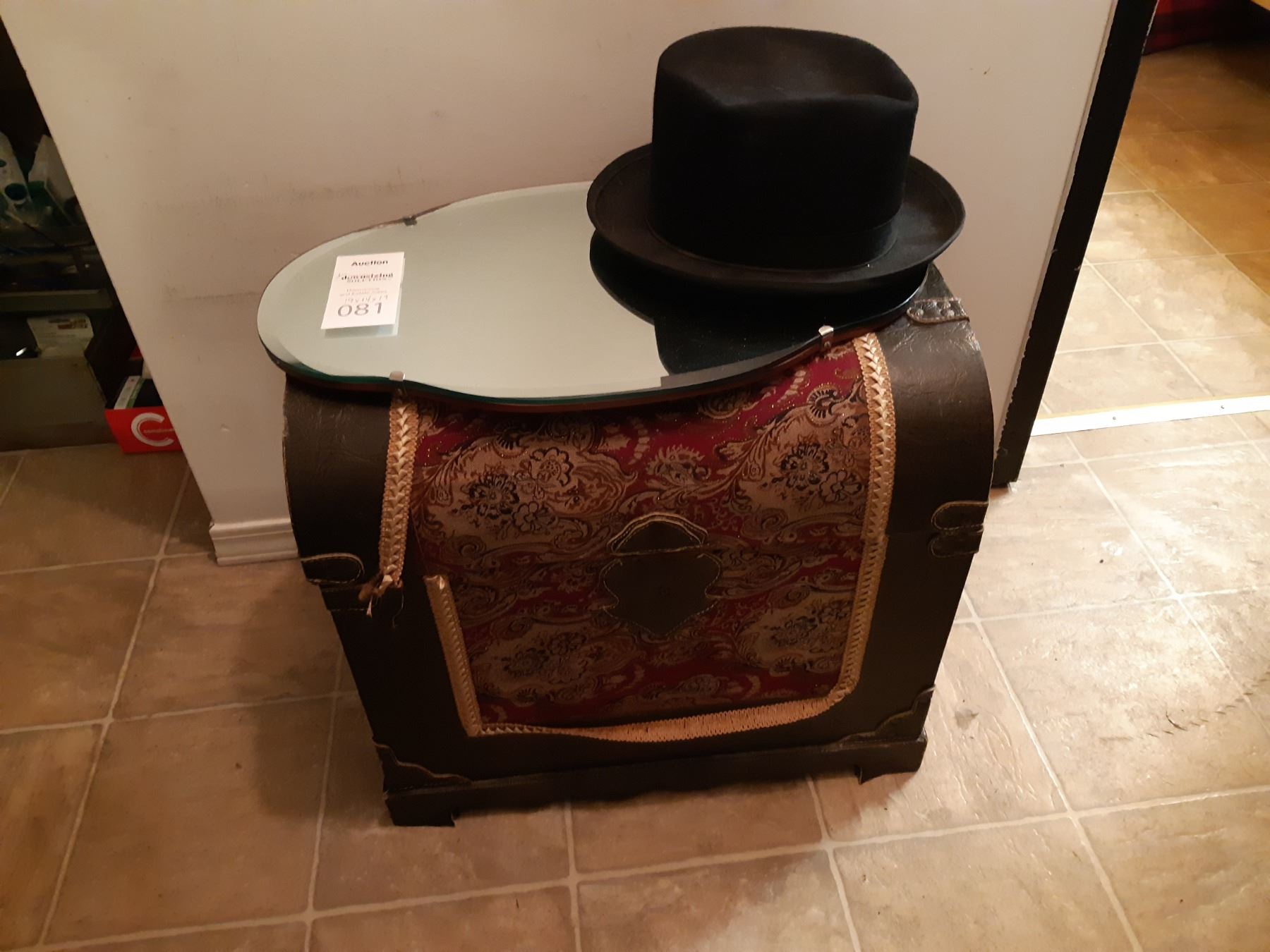 Cardboard chest 19x14x19, needs hinges repaired, small oval mirror and black hat. Pickup at 9 am.
