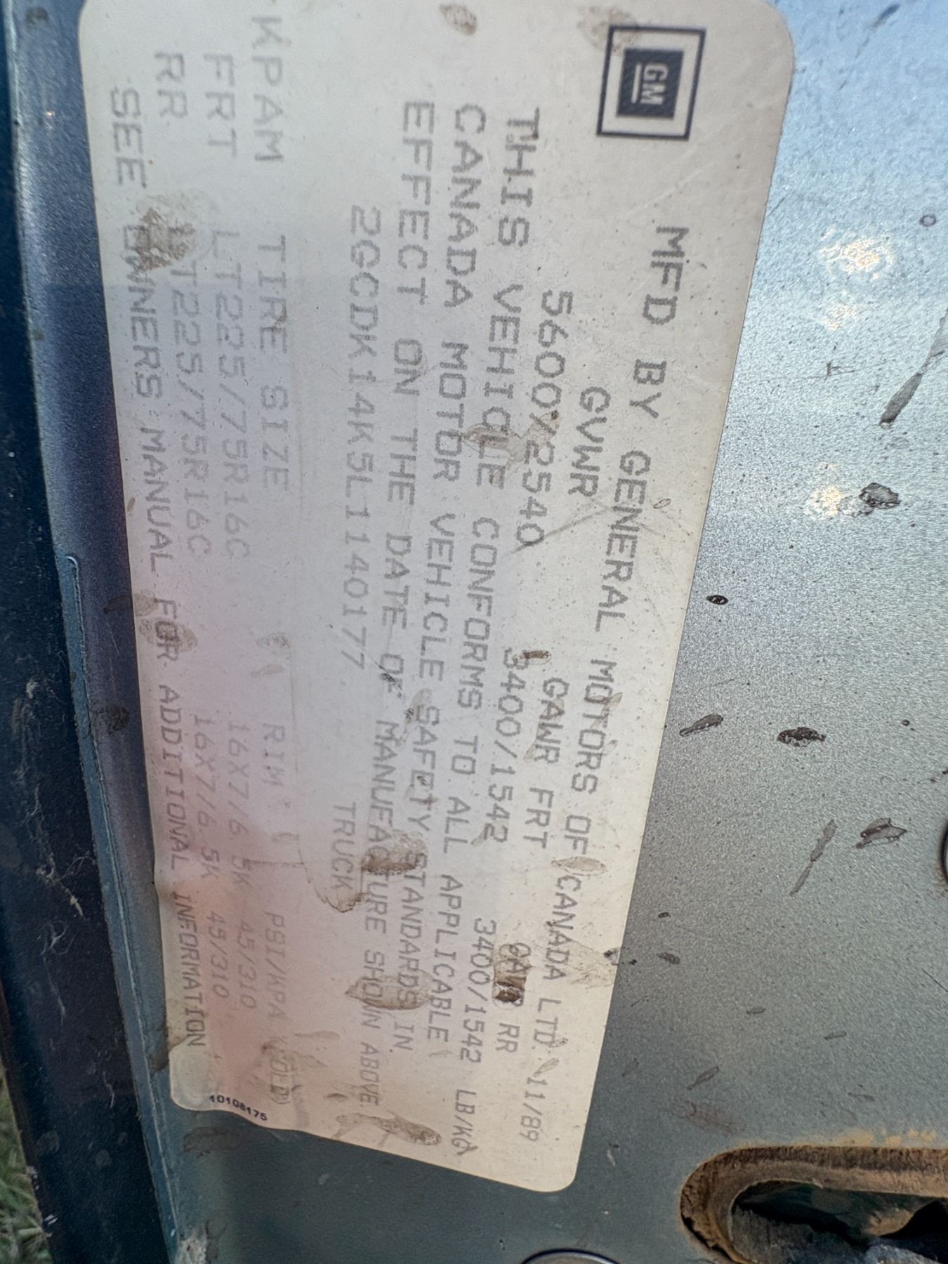 Chev Reg Cab 1500 4x4 s/n: 2GCDK14K5L1140177. Sold for Parts. Located at Land Parcel #2