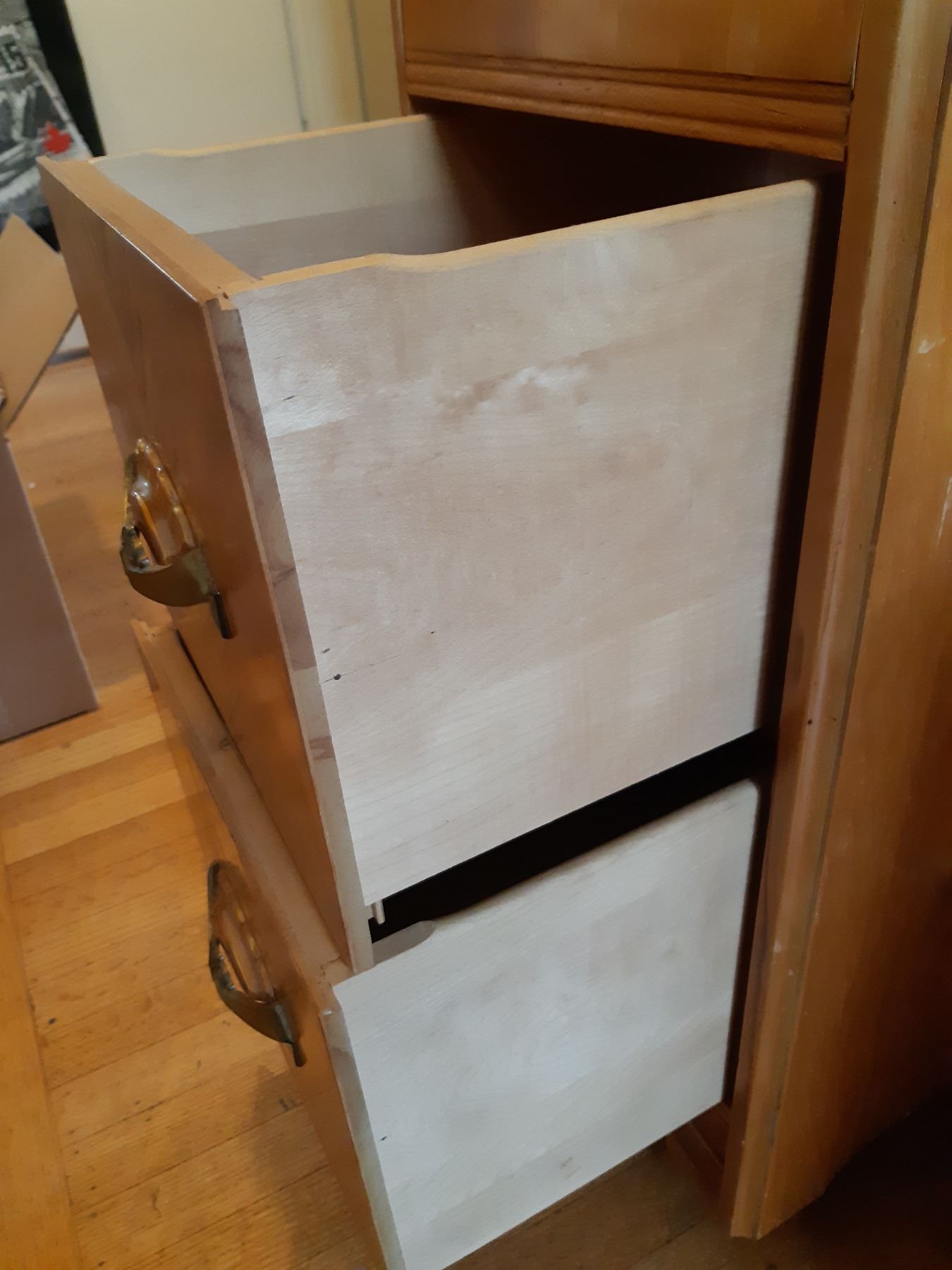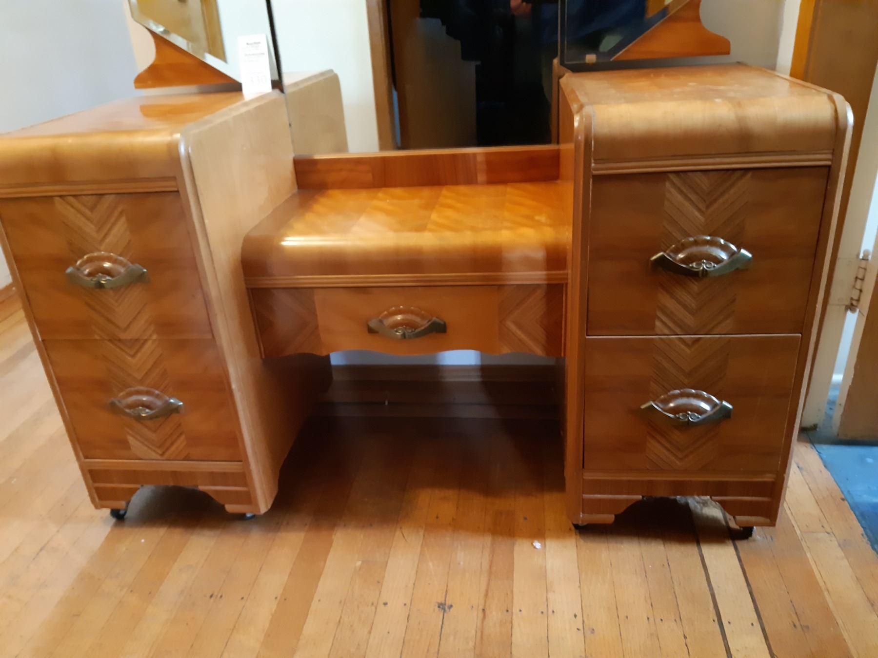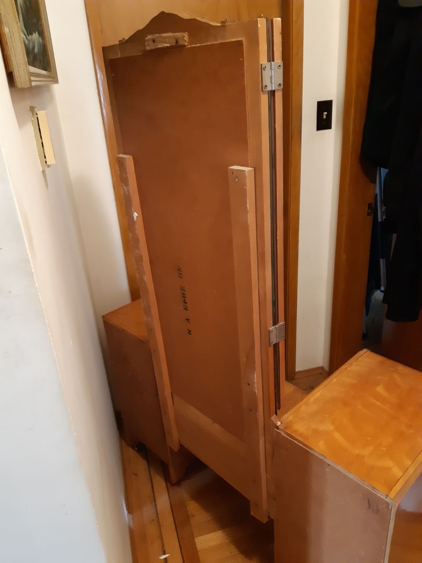 47x19x64 has castors for ease of moving around. Please note veneer is cracking and scratches. Bring tools to dismantle and help to remove. Pickup at 11 am