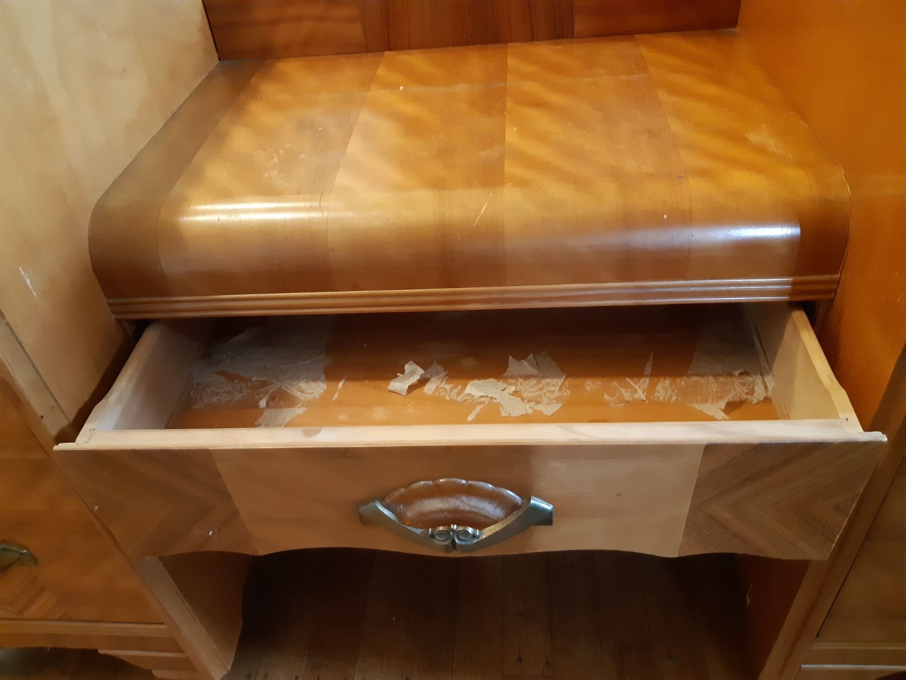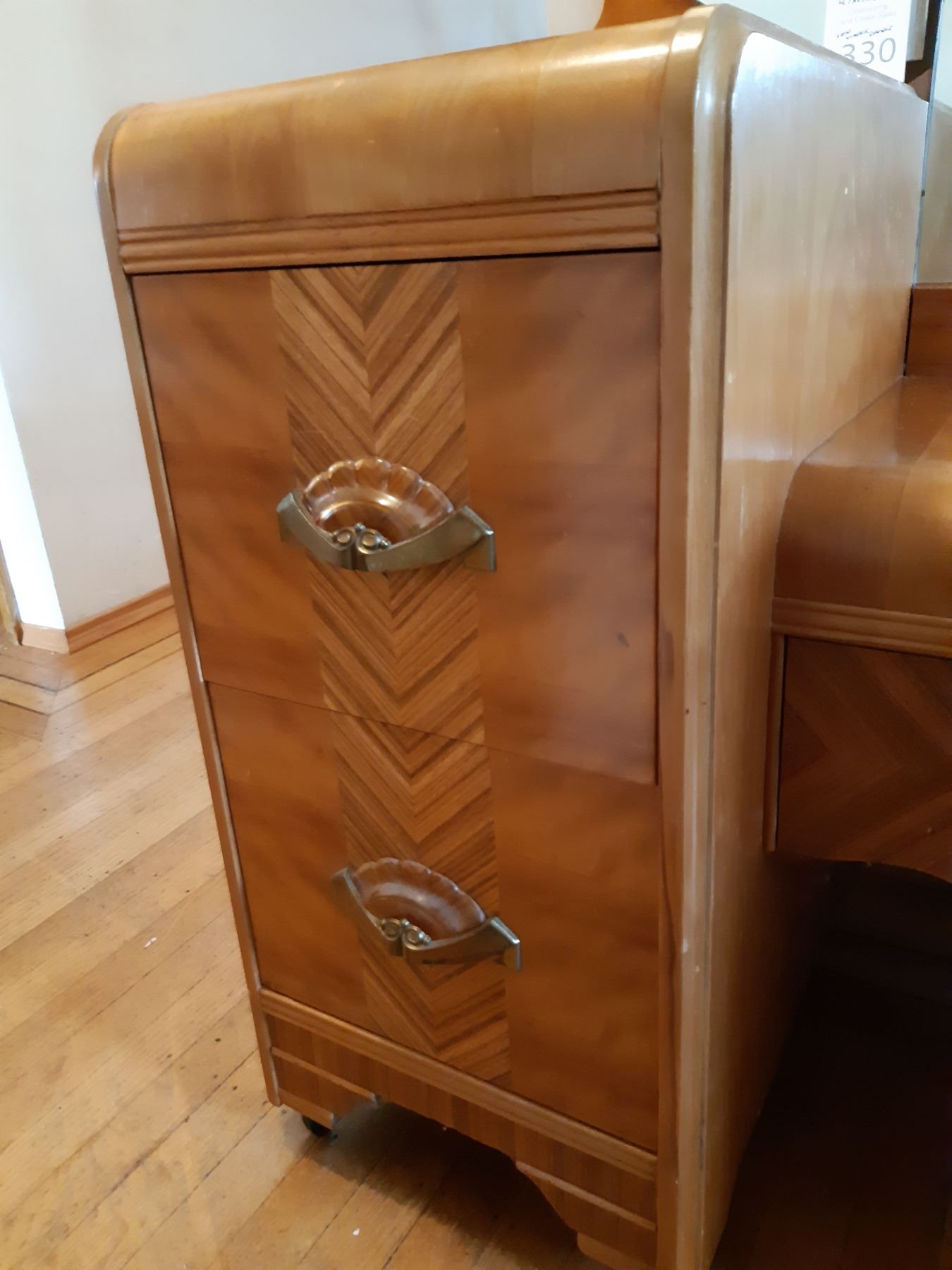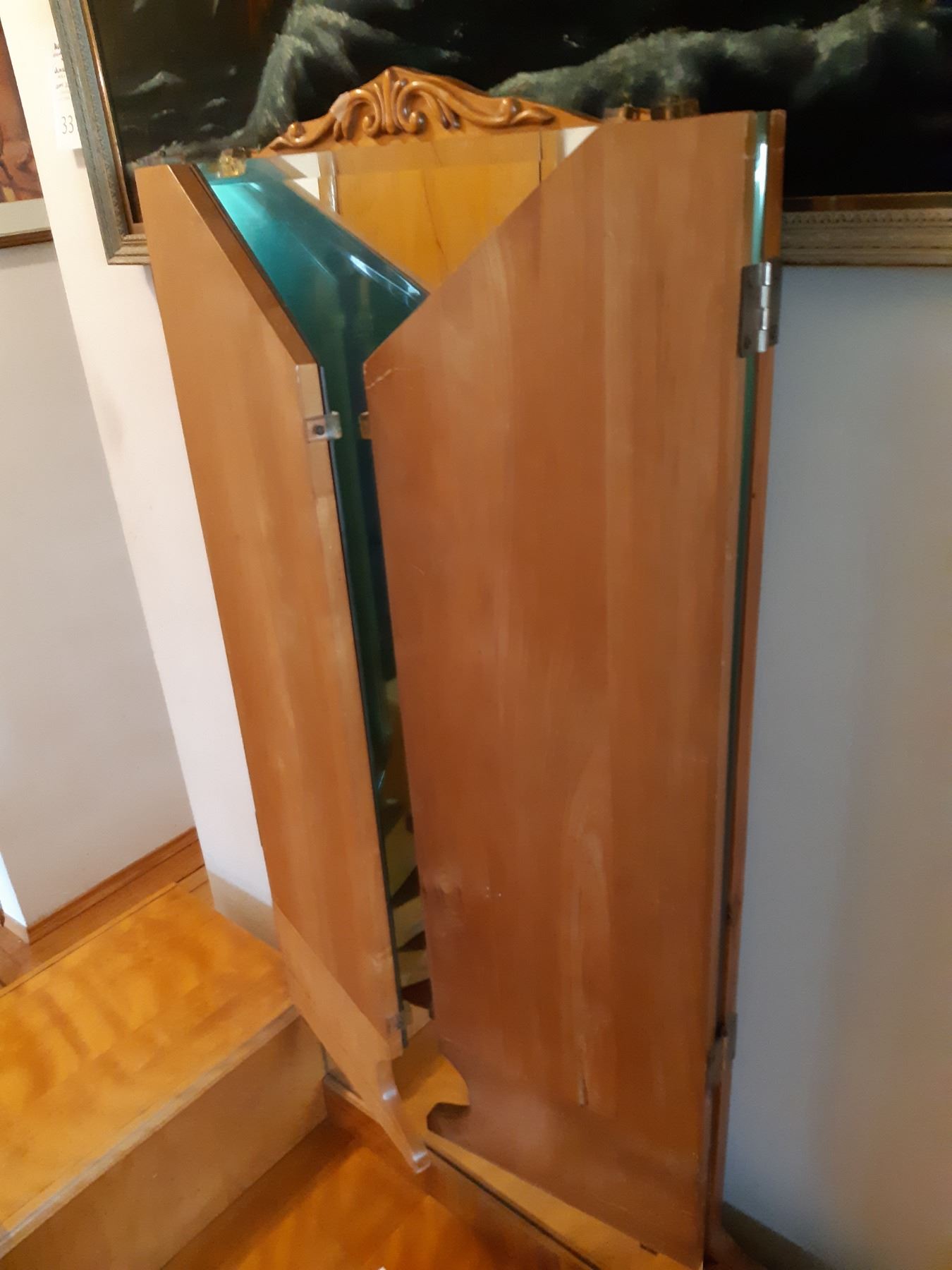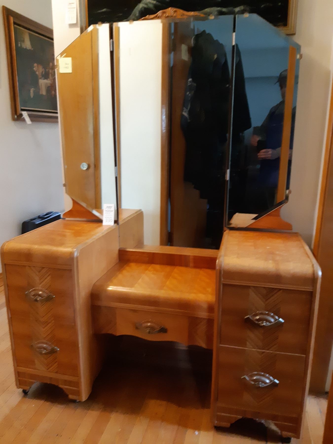 47x19x64 has castors for ease of moving around. Please note veneer is cracking and scratches. Bring tools to dismantle and help to remove. Pickup at 11 am