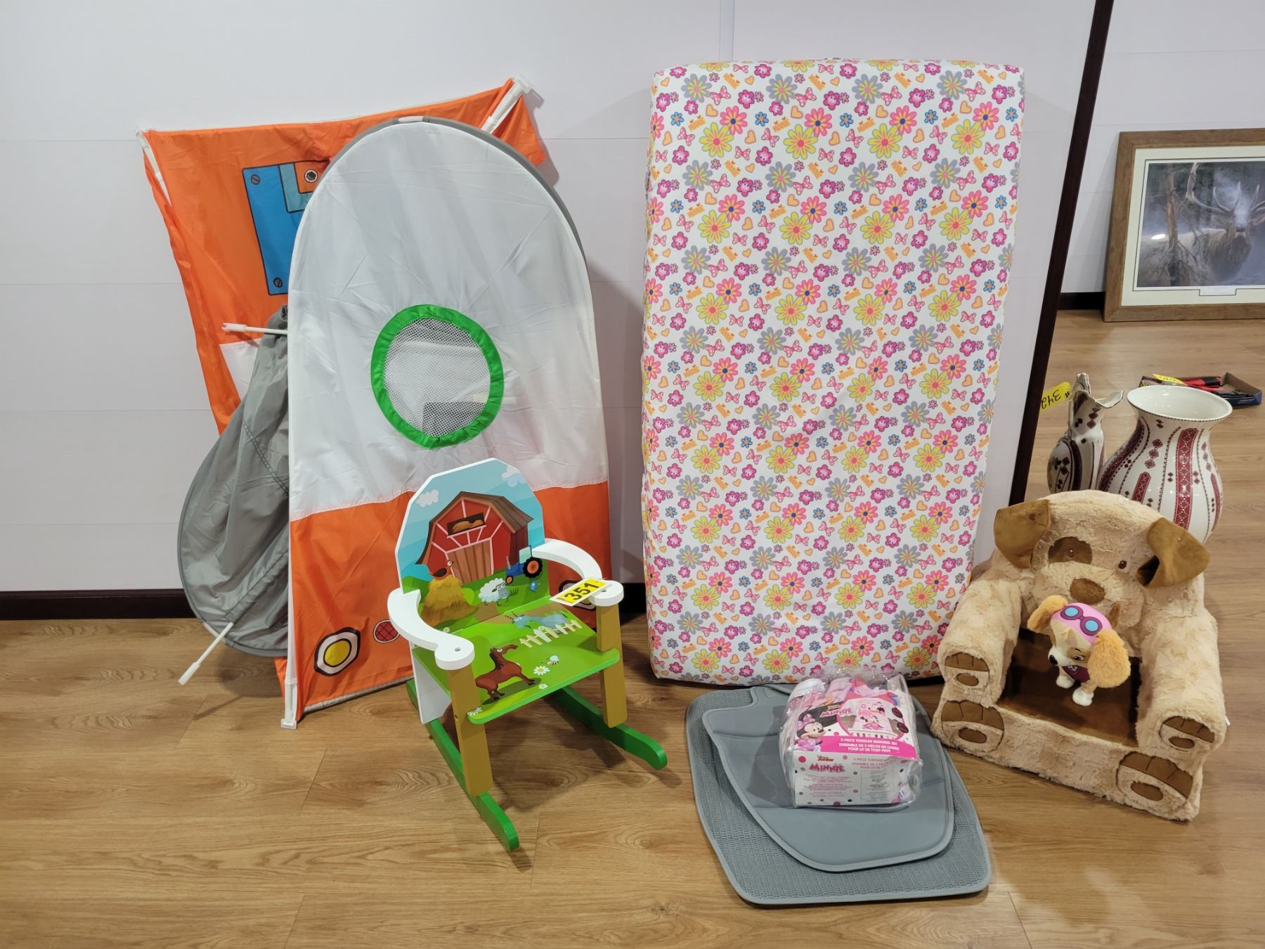 Children's pop-up play center, foam chair, crib mattress, wooden rocking chair etc.