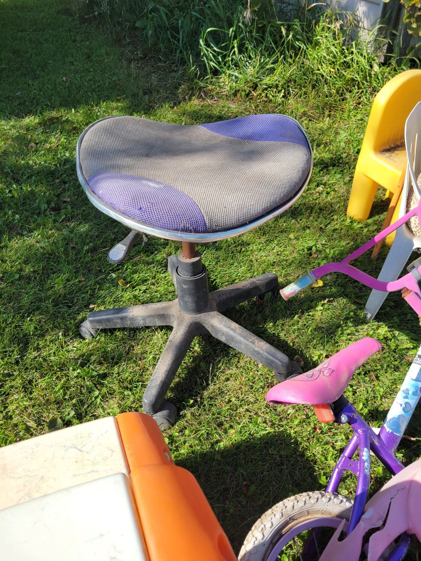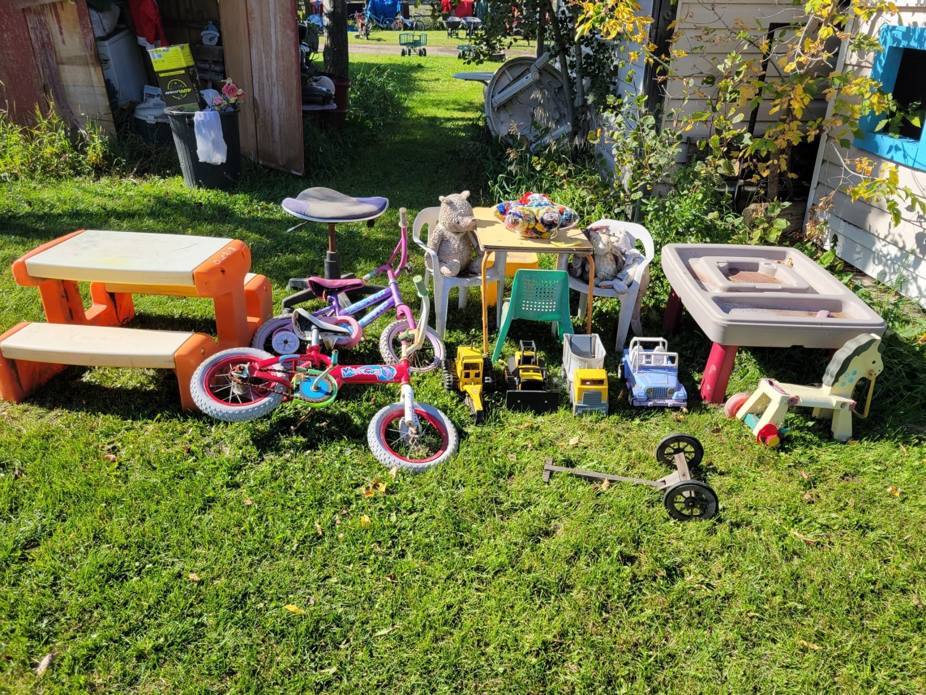 Children's sand table, picnic table, 2- bikes, table and chairs and misc. toys