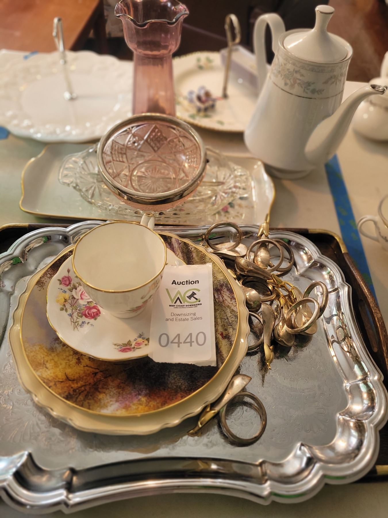 Wood & Sons handled cake plate. Collector plates. Coffee pot, silver and gold tone napkin holders. And more. Pickup at 9 am