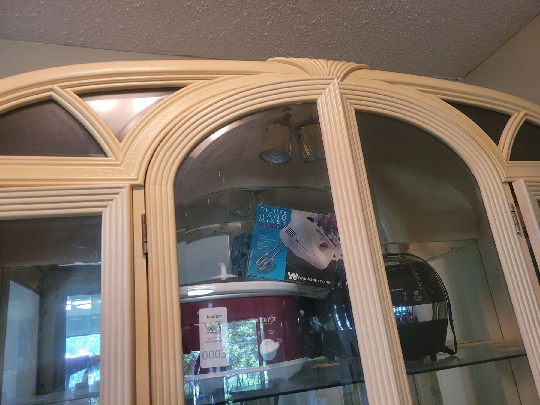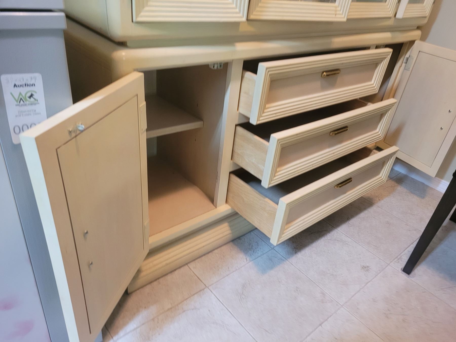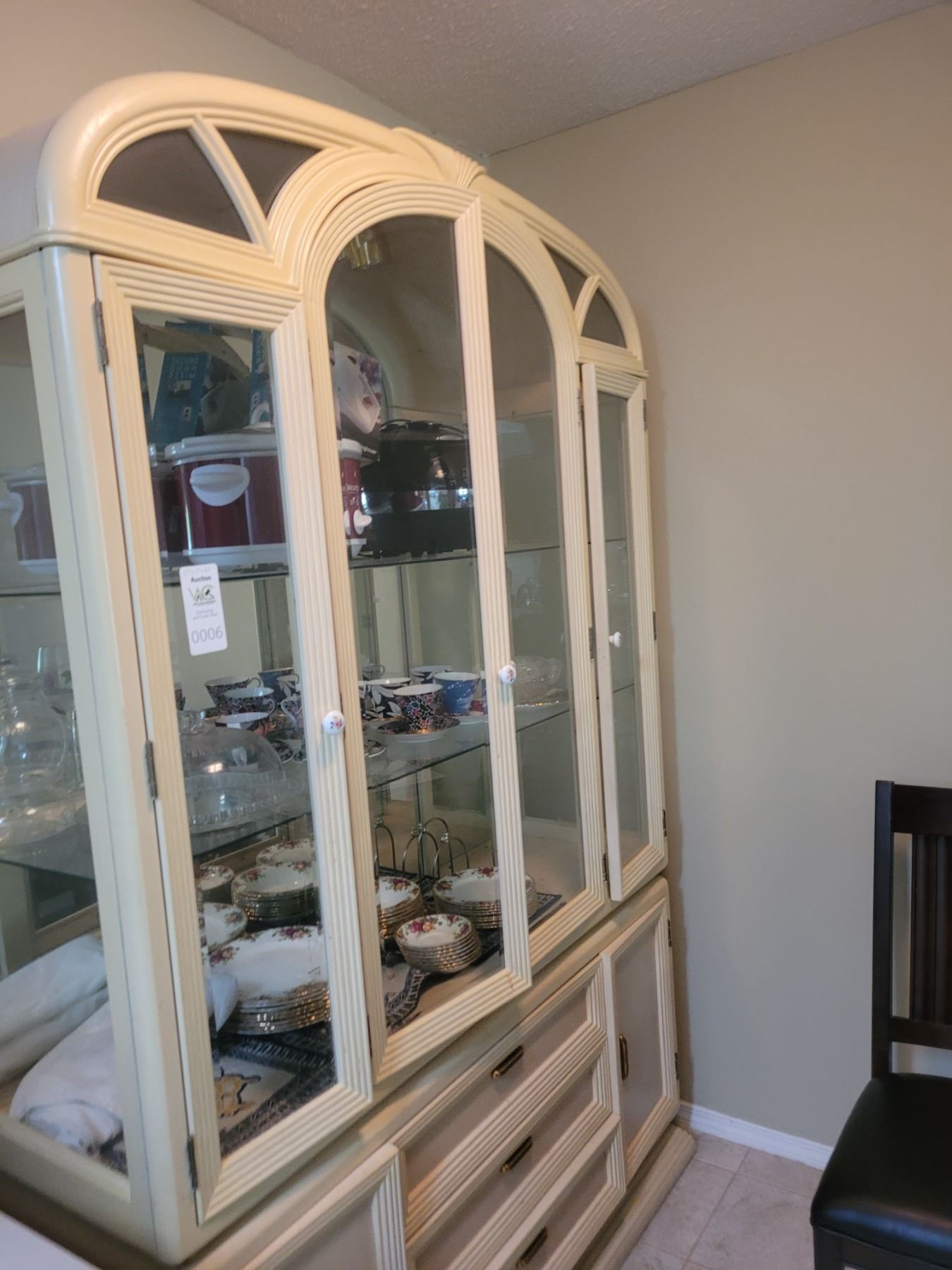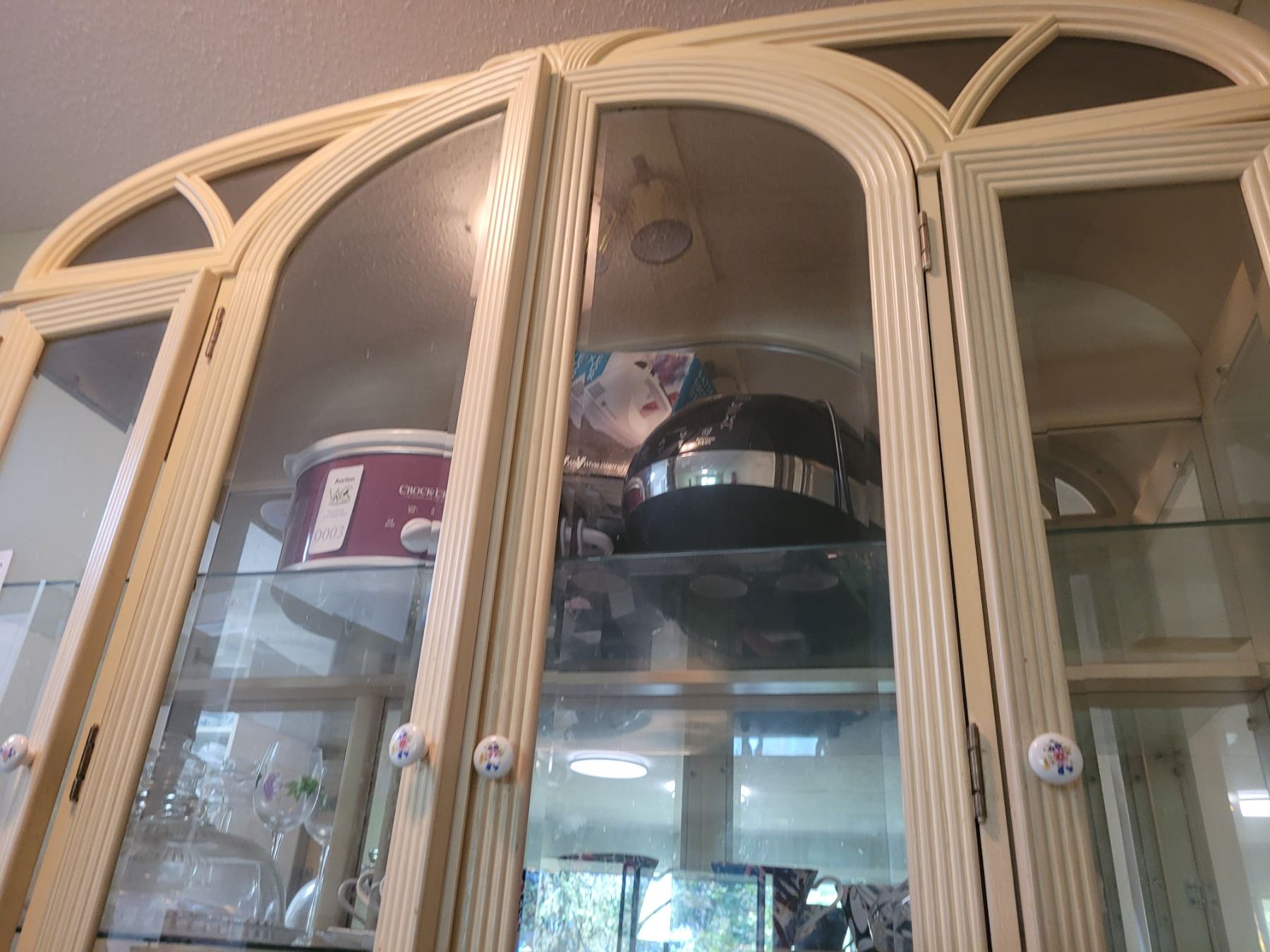 Solid wood China cabinet, 18"x56.5"x83". 2 pieces. Heavy, bring help to carry out. Pick up 11-12