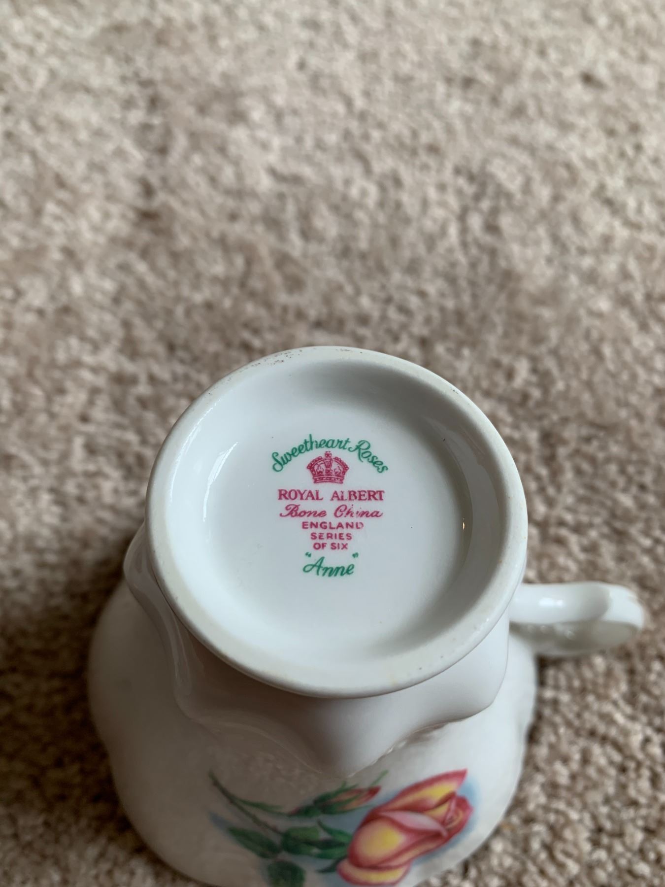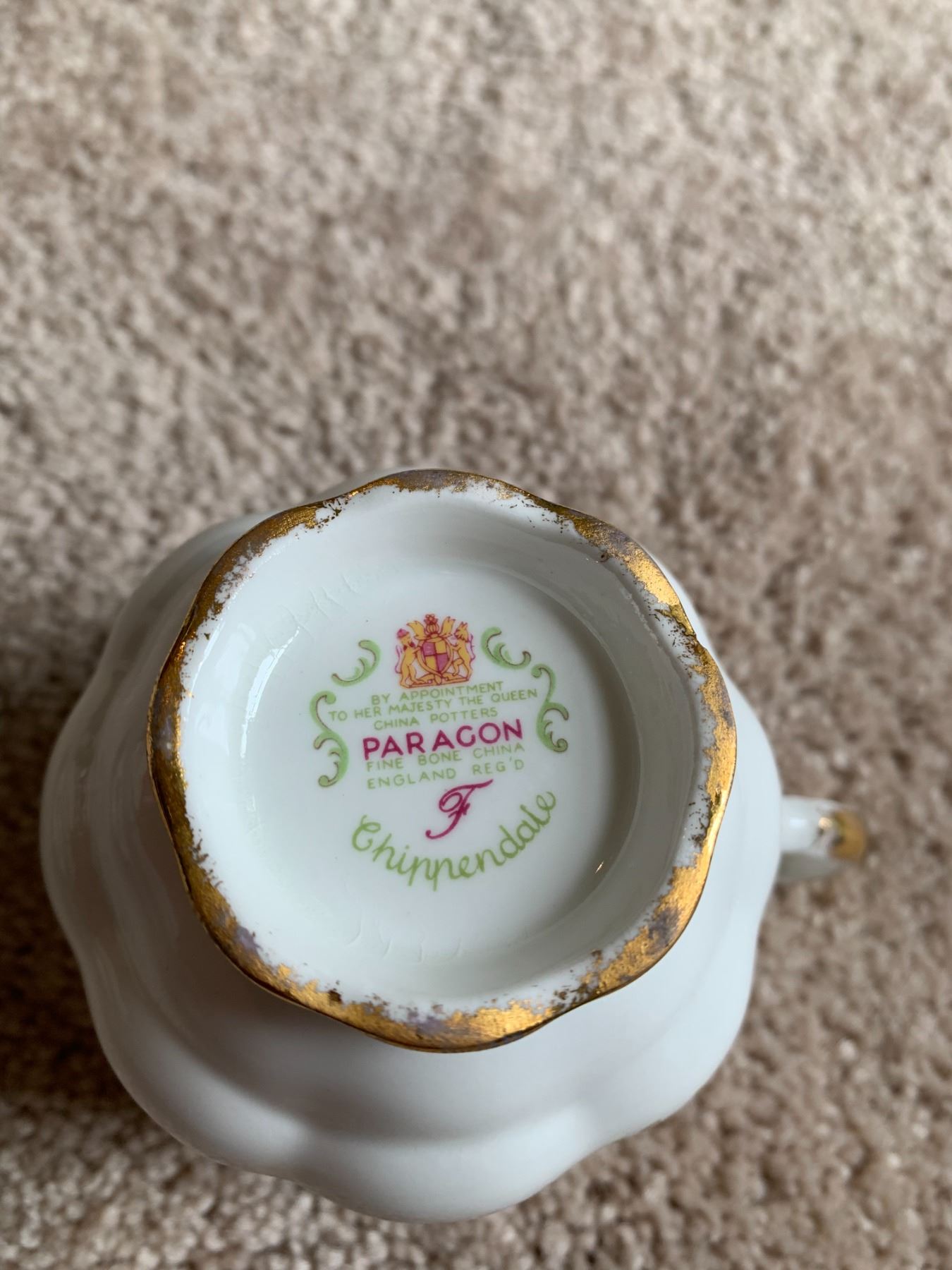Cups and saucers by Royal Albert, Paragon, and Adderley. Royal Albert has chip on cup bottom. Pickup at 9 am, cat. A.