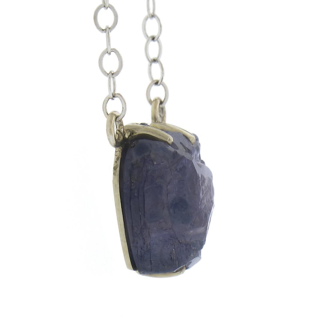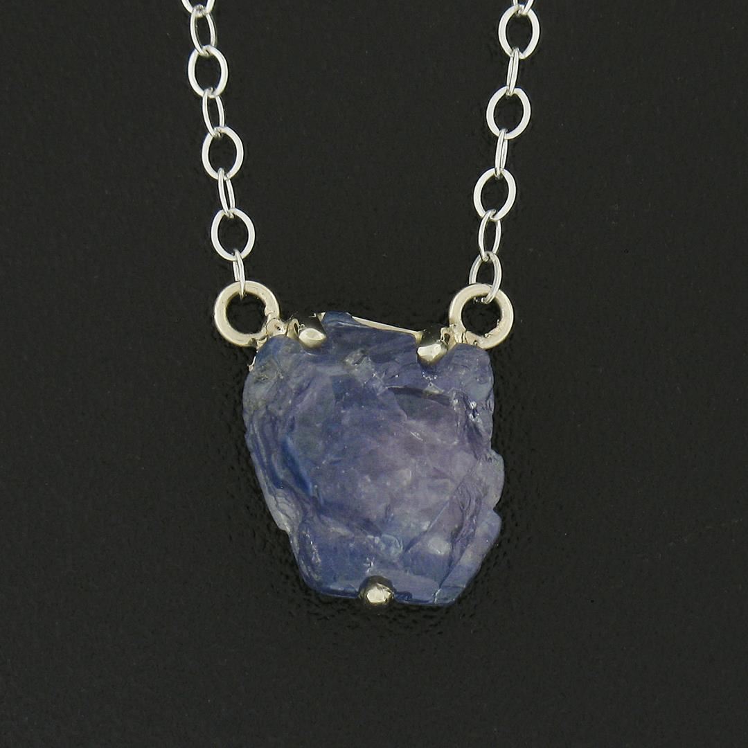 A solid 14k white gold pendant necklace by Chinchar Maloney, featuring 1 uncut natural genuine Iolite or tanzanite (purple - 9.3x8mm). 18 inch cable link chain, 1.91 grams total weight, pendant measures 9.3x8mm.