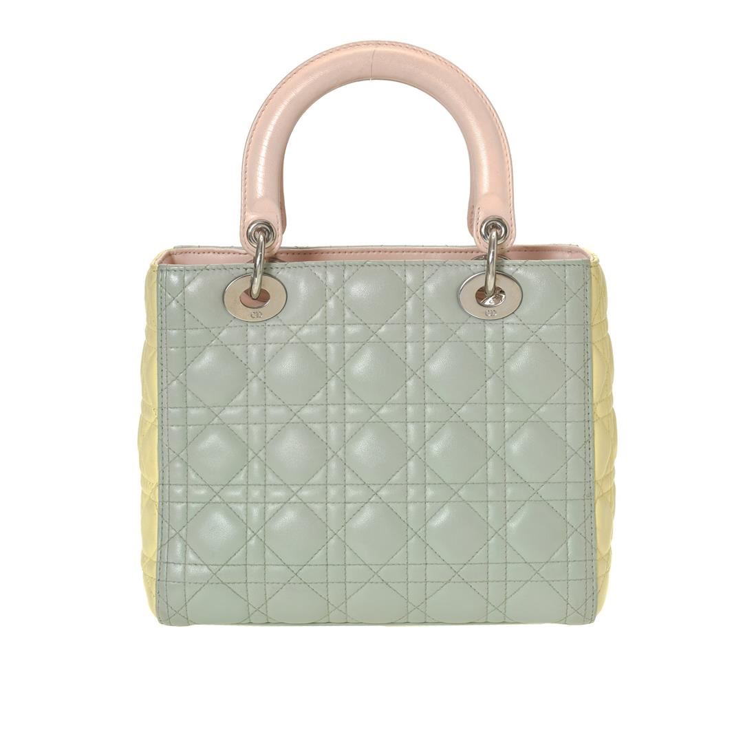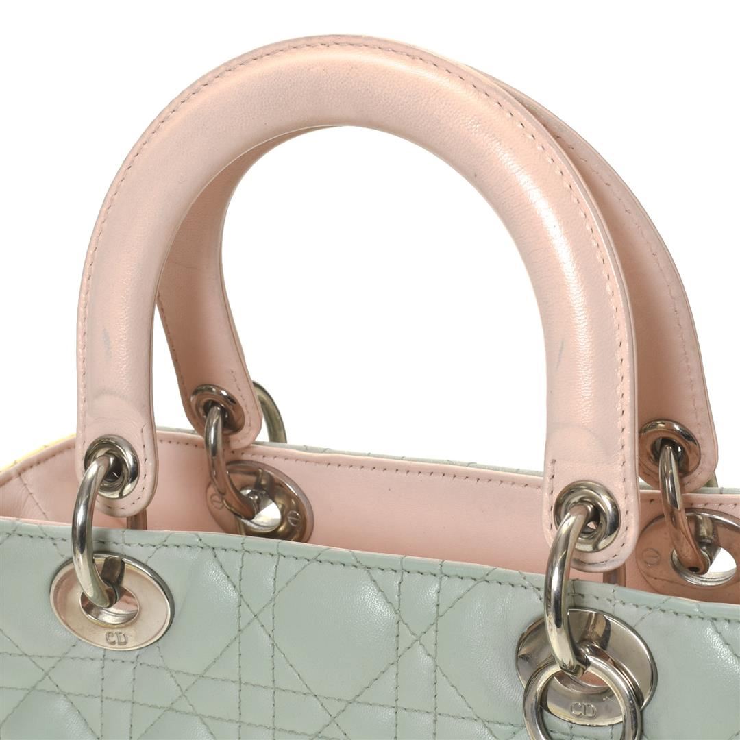 One Christian Dior Tricolor Cannage Quilted Lambskin Leather Medium Lady Dior Handbag. Item is sold AS-IS. All available information is listed in the description and shown in the photo. Pink, yellow and green Cannage quilted Lambskin leather Christian Dior Medium Lady Dior handbag with silver-tone hardware, dangling DIOR letter charms, double flat leather top handles, pink leather removable shoulder strap, pink leather lining with one zipped pocket inside. 9.5" L x 4.5" W x 8" H Handle Drop: 4" and 16"
