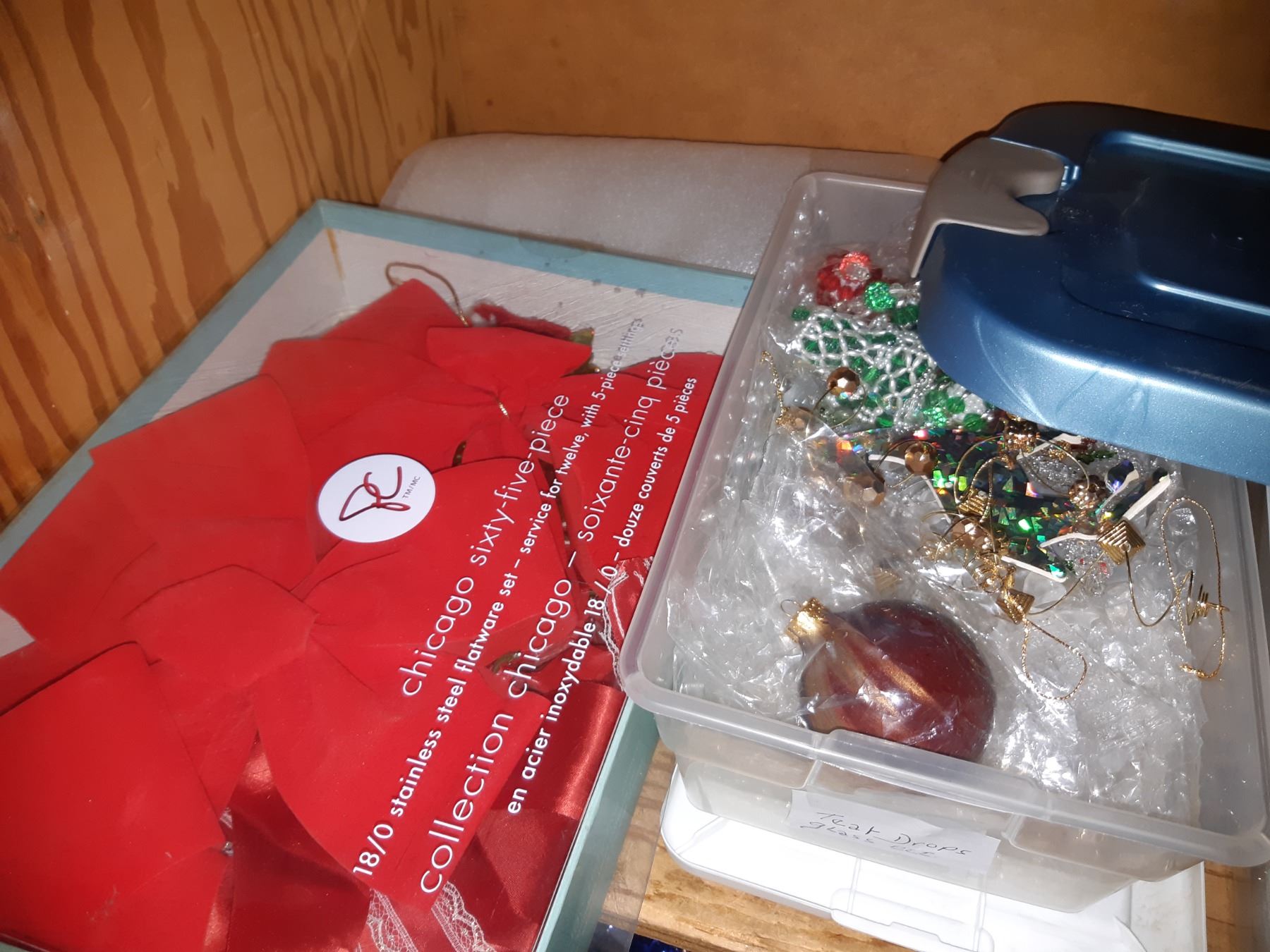 4' lighted Tree , Xmas balls, cones, wreaths, holly, and more. Pickup at 10 am
