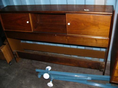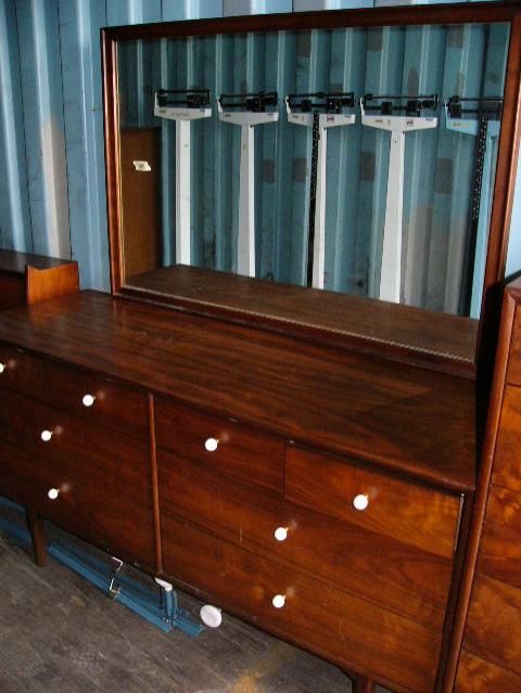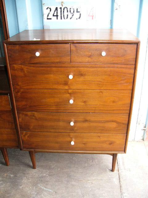 Circa 1960 American walnut 3 piece bedroom set : hi-boy, 8-drawer dresser with mirror, headboard with Hollywood frame by Drexel (185)