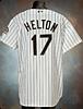 On the front left tail of this jersey is the "RUSSELL ATHLETIC" manufacturer's tag with wash instructions and two flag tags attached. One reads "+2" EXTRA LENGTH" and the other reads "50 100% POLYESTER". On the front left breast is the "COLORADO ROCKIES" logo done in black on silver tackle twill. On the right breast and on the back of the jersey is the player number "17". Across the back of the jersey is the player name "HELTON" sewn directly on the jersey. This numbering and lettering is done in black on grey tackle twill. On the back of the collar is the official MLB logo patch. On the left sleeve is the "Rockies" logo patch and below is the Russell "R" embroidered logo. The jersey shows game-use and appears to have no alterations of any kind.