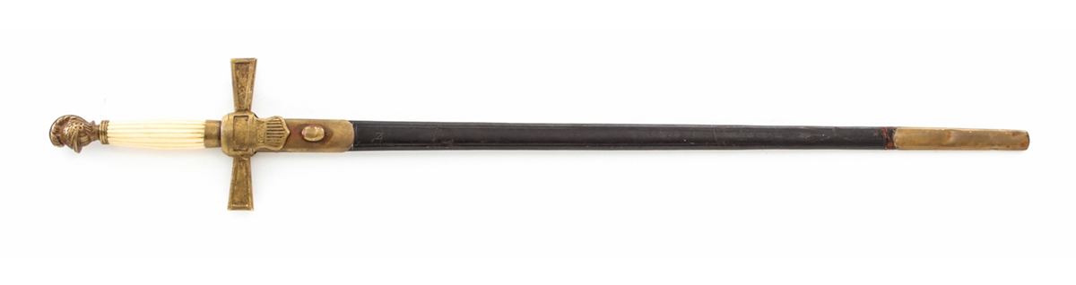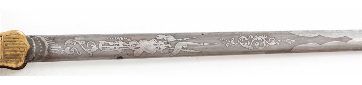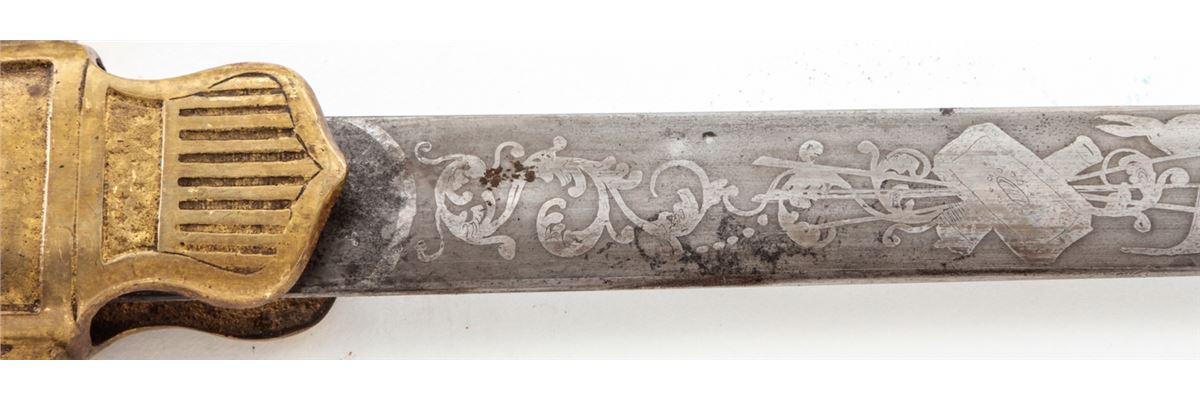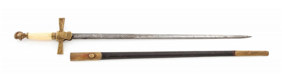 Civil War Era Militia NCO Sword, by Baker & McKenney, 25'' double-edged etched blade with Stand of Arms and scrolls, cast naval bronze hilt with shield-shaped langets, and horizontally fluted bone grip. In black leather scabbard with brass throat and tip. Condition is excellent showing even toning to brass and one small loss to one of the grip flutes. Blade with good detail. Scabbard marked ''2'', with some thinning where it contacts chape. Often seen in Civil War photographs, this type sword no doubt saw service during that conflict. Est.: $200-$400.