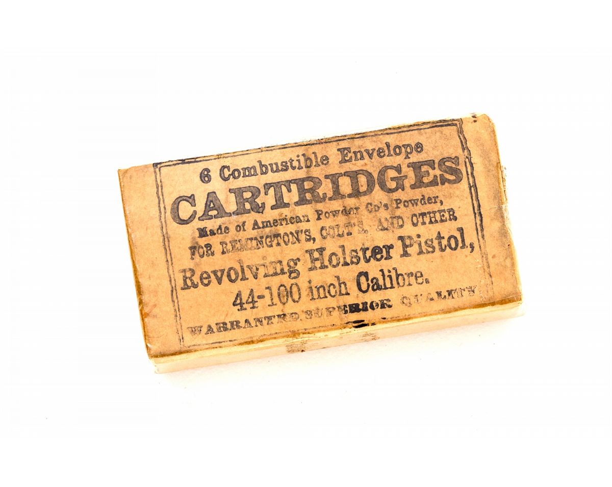 Civil War Era Woodblock Packet for Army Model, by American Powder Co., wrapped and sealed. Condition is excellent with minor discoloration and bleeding of label. Est.: $400-$600.