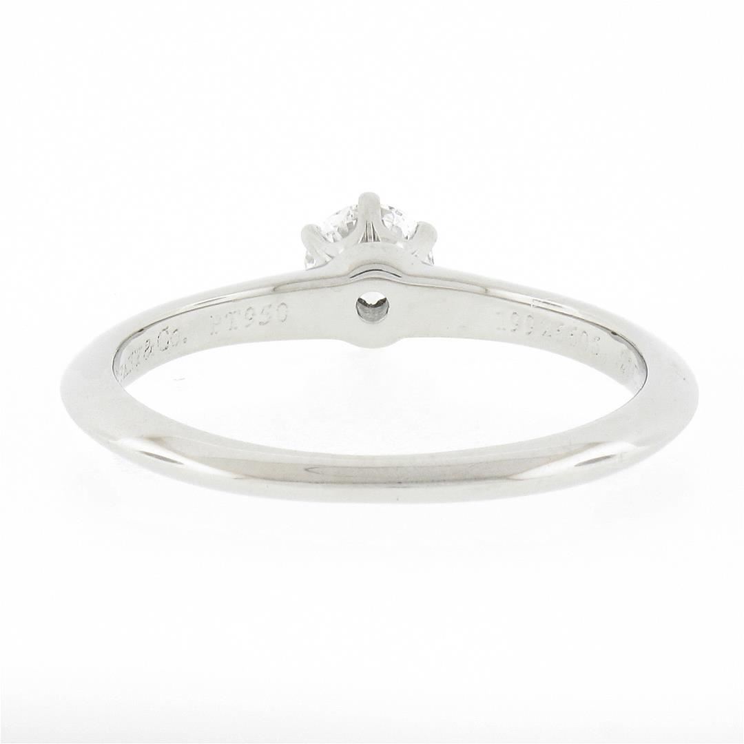 A solid platinum classic engagement ring by Tiffany & Co. with 1 round brilliant cut natural diamond (D - VVS2 ; 0.27ct). The ring is size 5.5, weighs a total of 3.12 grams, and measures 4.95mm wide.